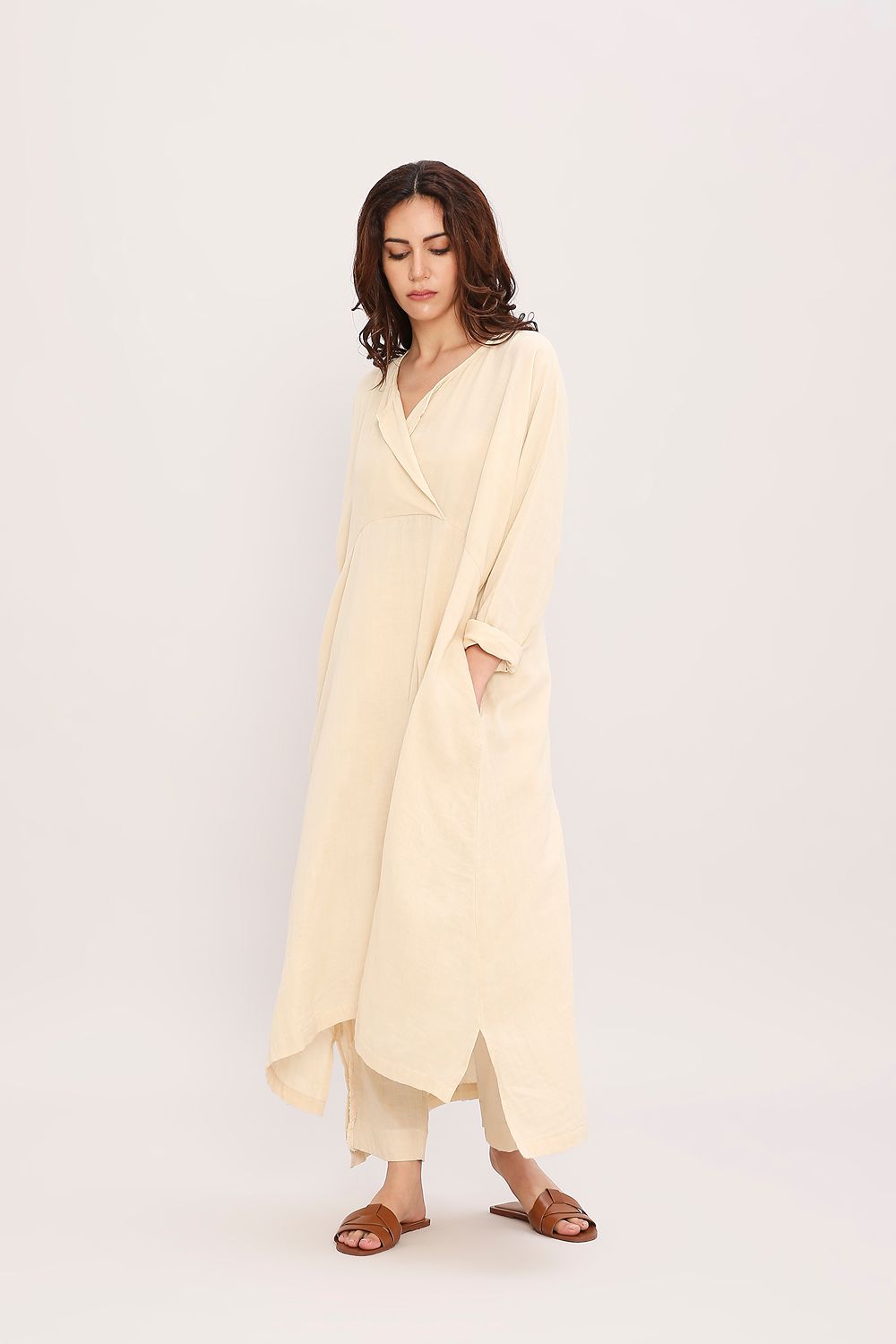 Easy & comfortable kaftan stylle tunic made in soft crush cotton with side pockets comes with a matching tassled pants. Total 2 pcs.
