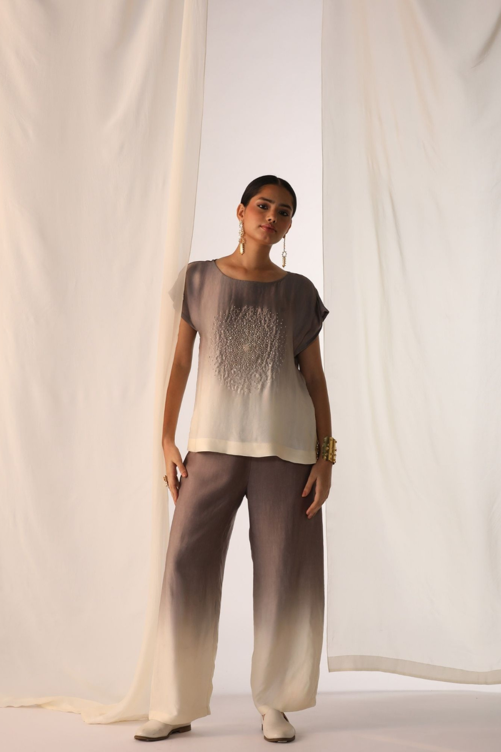 Elevate your summer wardrobe with this Linen satin Ombre in dove grey and pearl white, featuring delicate french knot embroidery scatter on the top