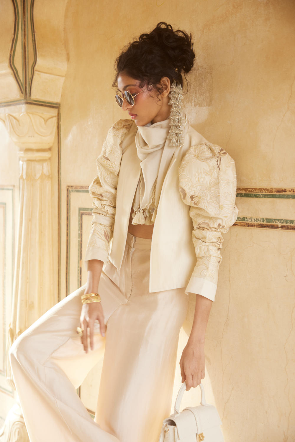 The ivory jacket set is crafted from luxurious silk organza fabric. The jacket and blouse has floral jaal which is embroidered using cutwork technique. It is fully lined, the sleeves are voluminous and the set is paired with scallop and tassel detailed scarf.