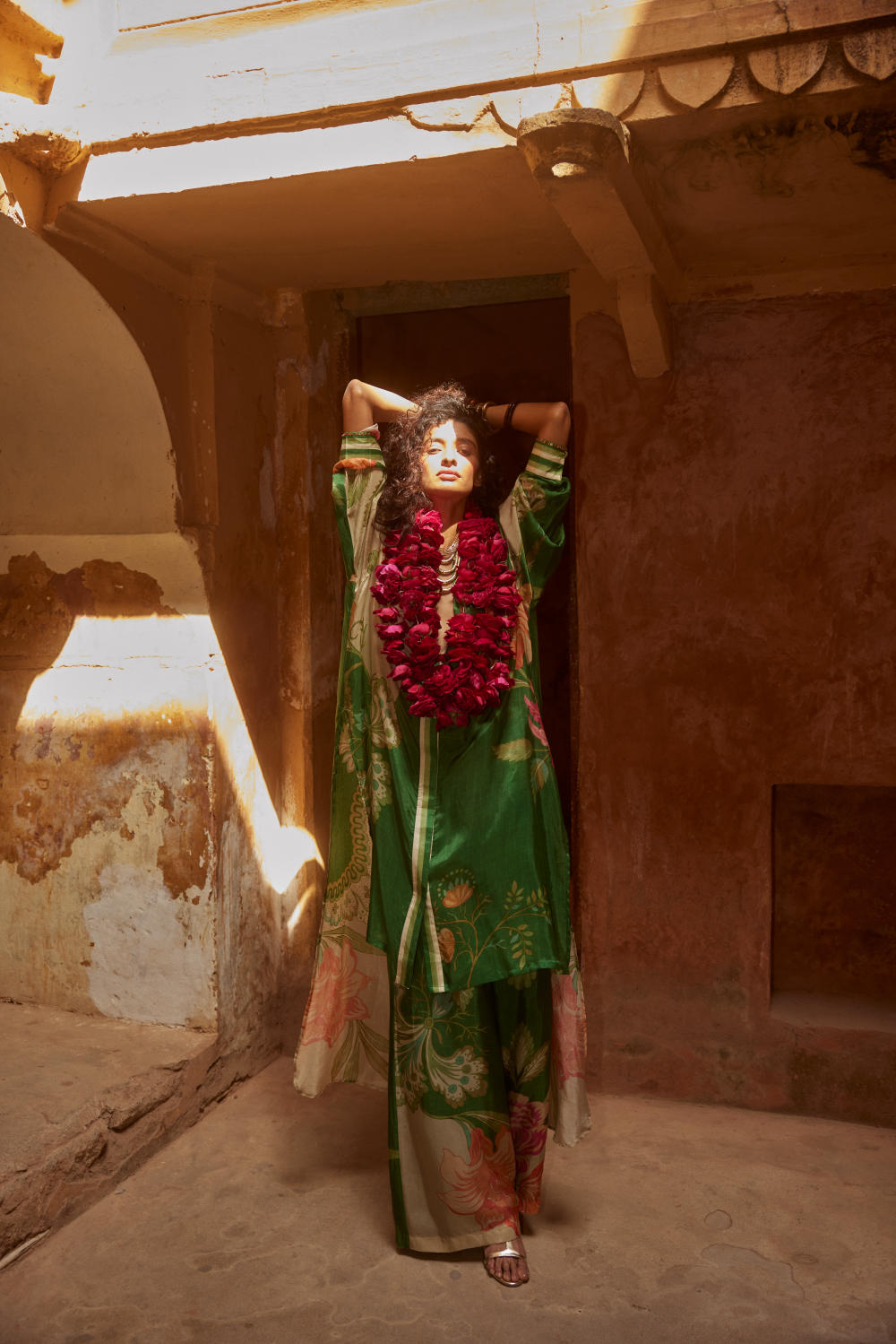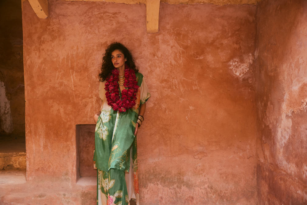 Every collection begins long before the garment is stitched: months of research into India’s rich craft traditions, followed by the painstaking creation of detailed illustrations. These artworks are then scanned, enhanced with jewel-toned palettes and touches of rich gold, and finally translated onto fabric. The result is a visual language so distinct that their name has become synonymous with print, colour, and the kind of glamour that still feels feather-light.
