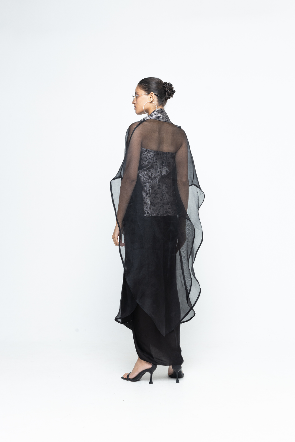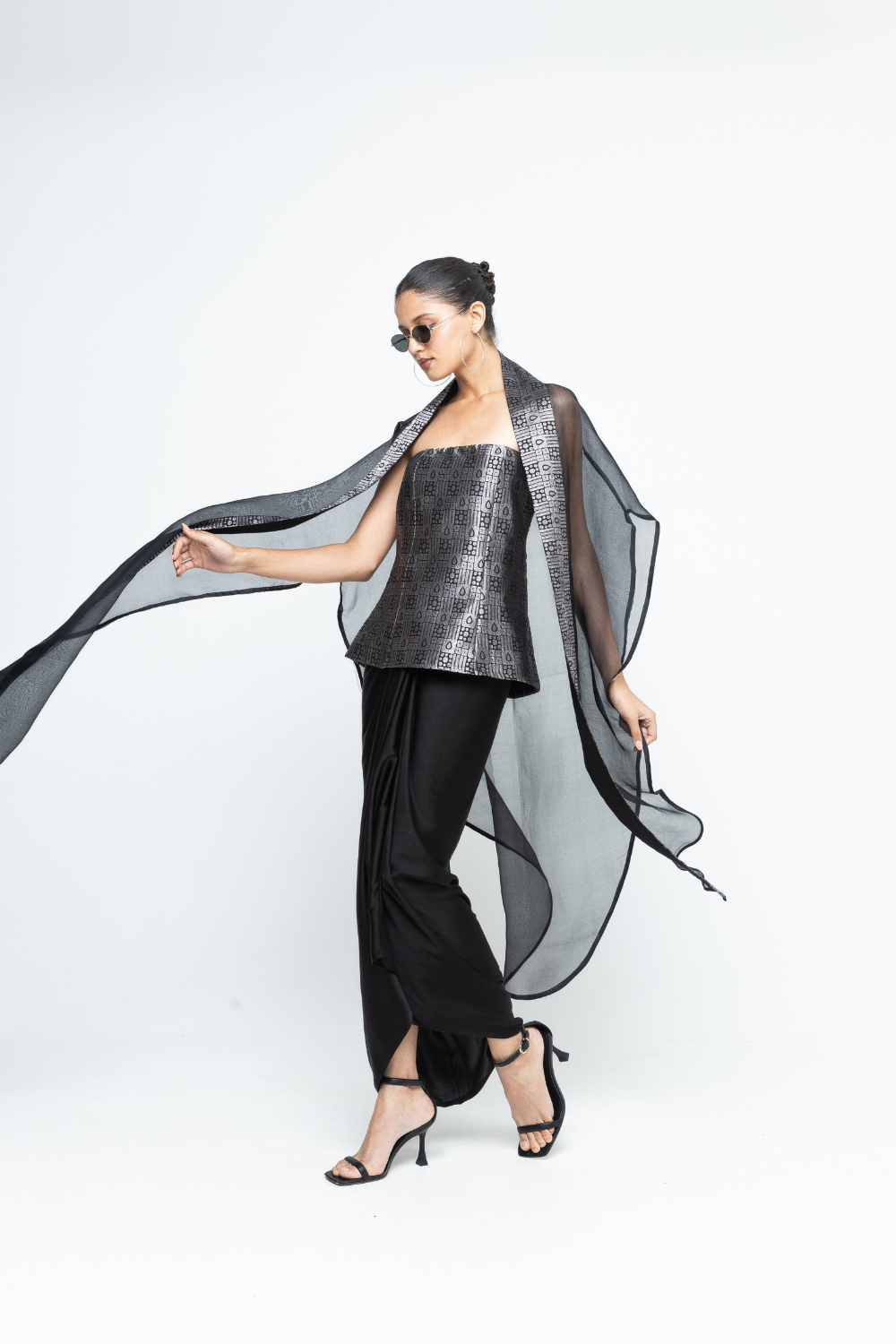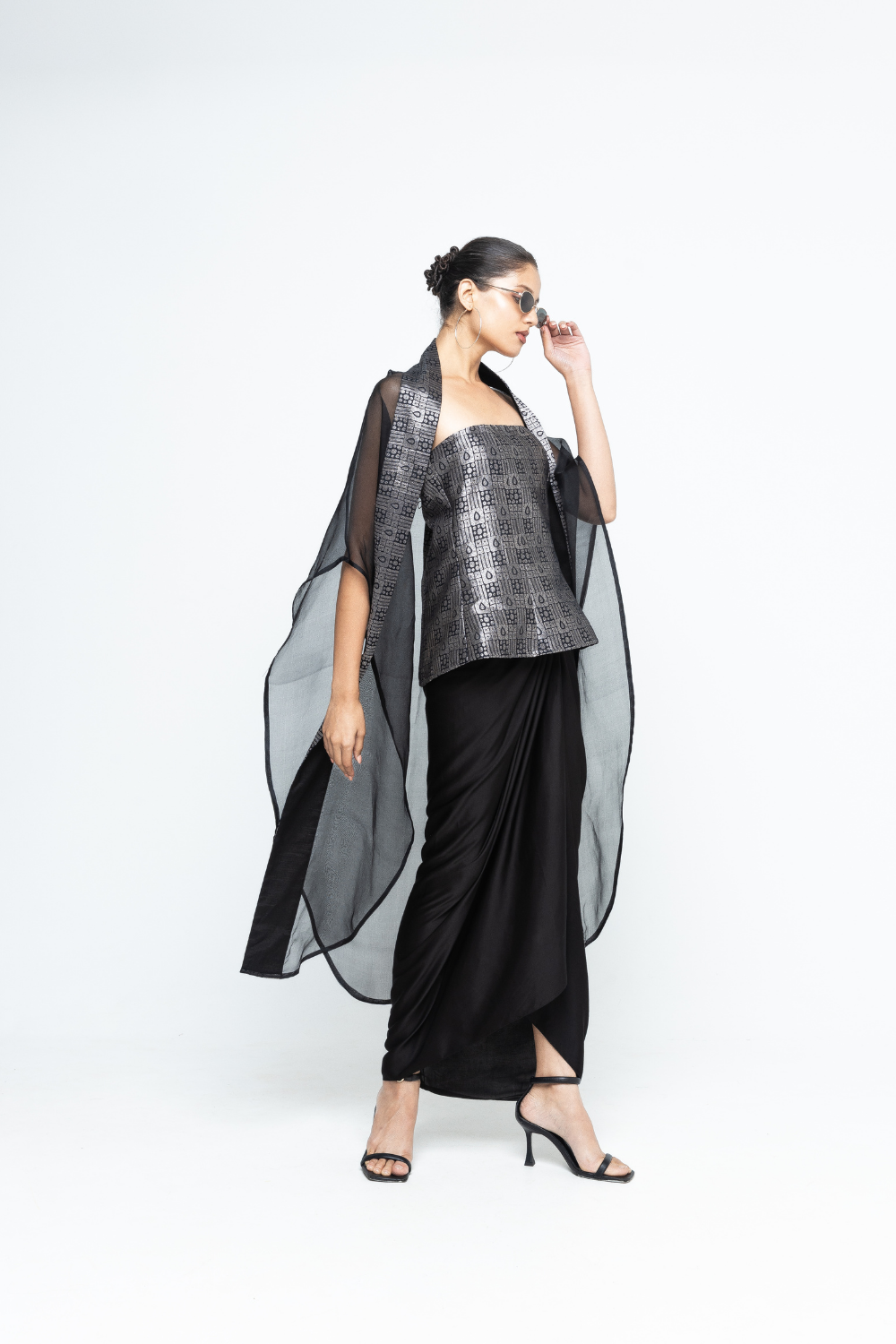 Statement Brocade strapless top paired with draped skirt and organza cape with brocade details.