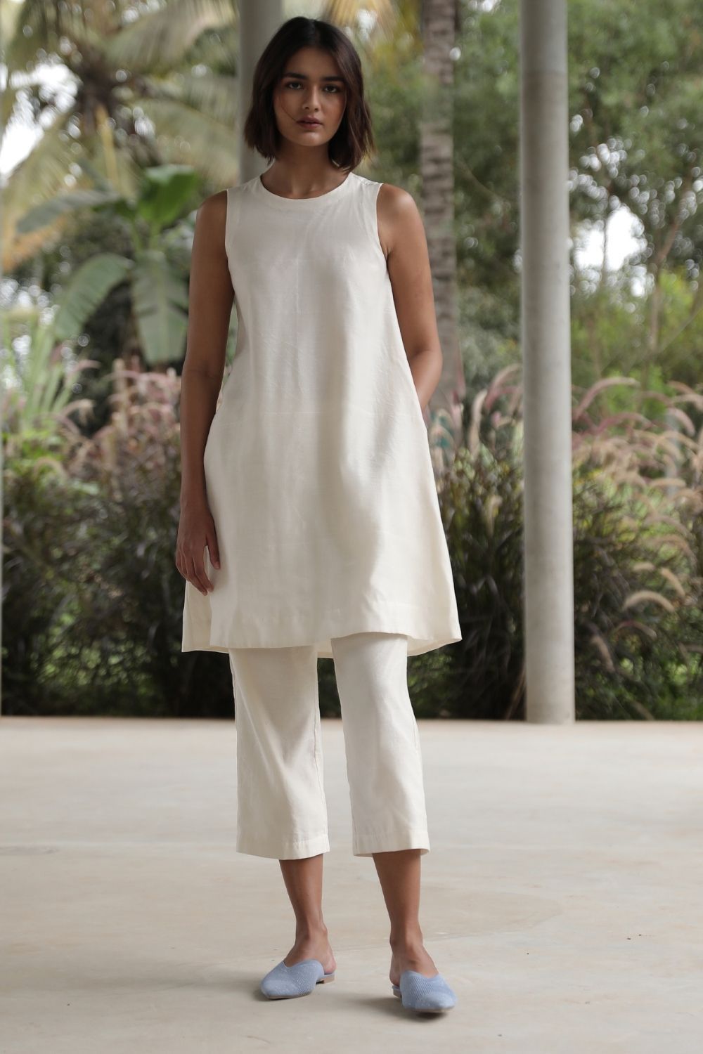 Sleeveless tunic with a close round neck. Back button fastening. In-seam pockets. Fully lined. Can be worn separately as a dress.