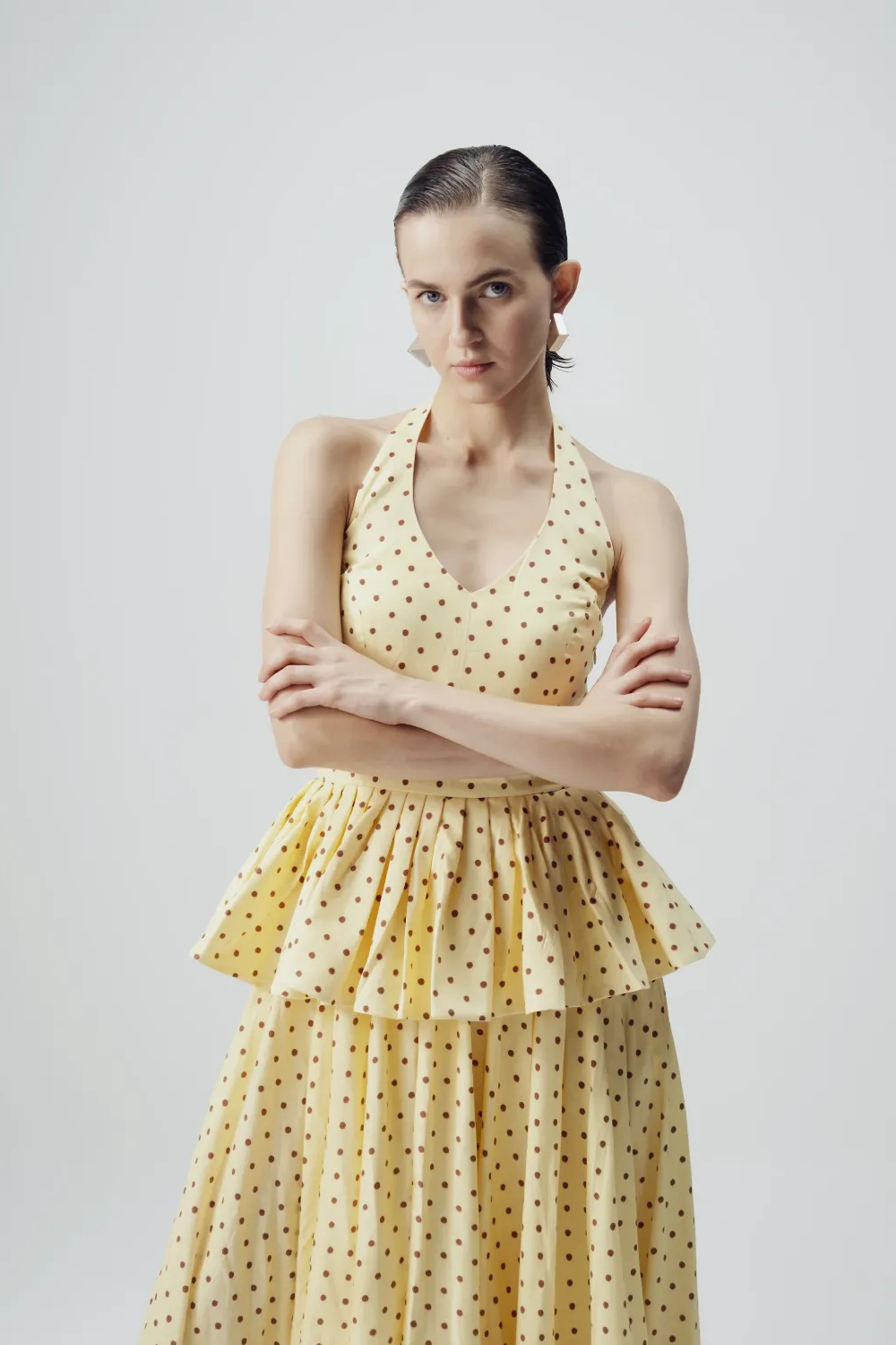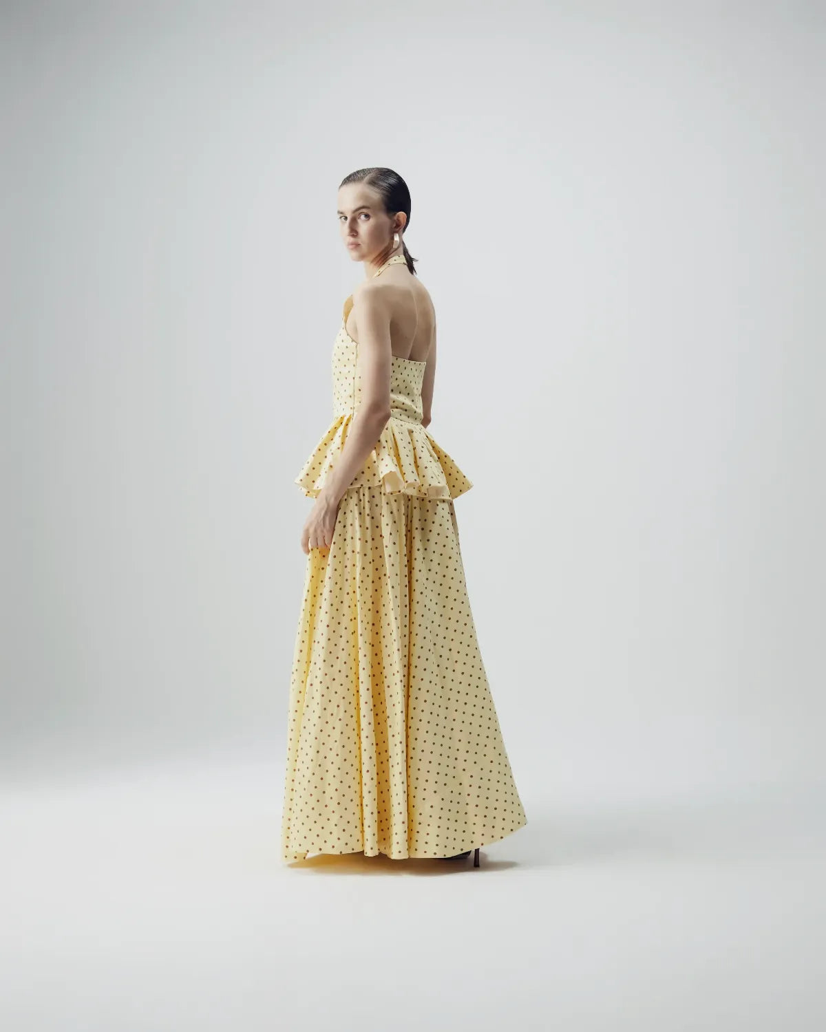 This dress features a charming all-over polka dot print, set against a soft pastel yellow base. The evenly spaced brown polka dots lend the outfit a nostalgic, retro-inspired appeal while keeping it playful and feminine.