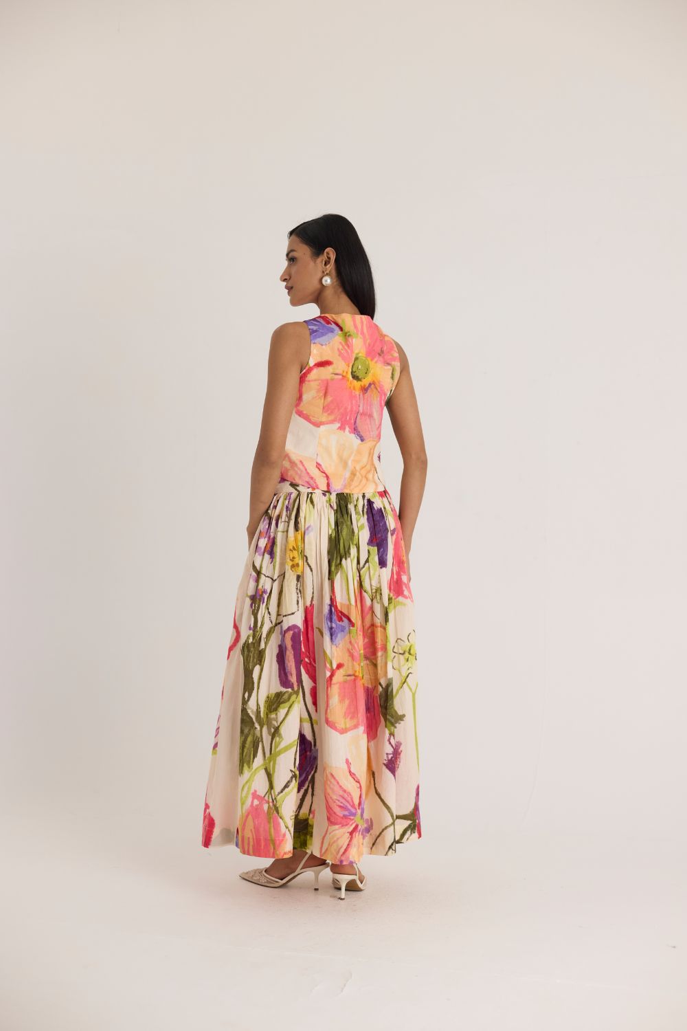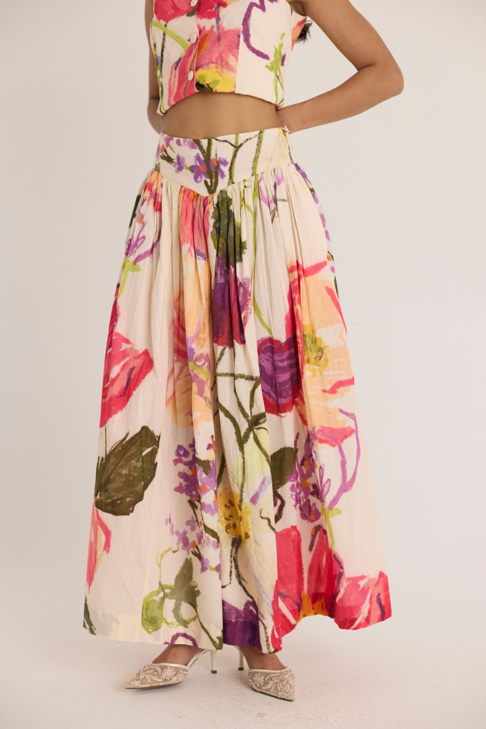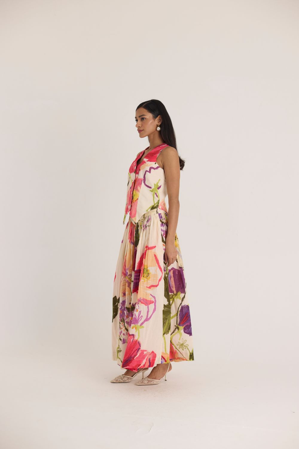 Make a bold statement with this floral waistcoat and skirt set, designed to bring artistic elegance to your wardrobe. The structured waistcoat features a sharp, pointed hem and a tailored fit, creating a striking silhouette. Paired with the matching high-waisted skirt, this co-ord set showcases a stunning watercolor-inspired floral print in vibrant shades of red, pink, green, and purple. Crafted from lightweight fabric, it offers both style and comfort.
