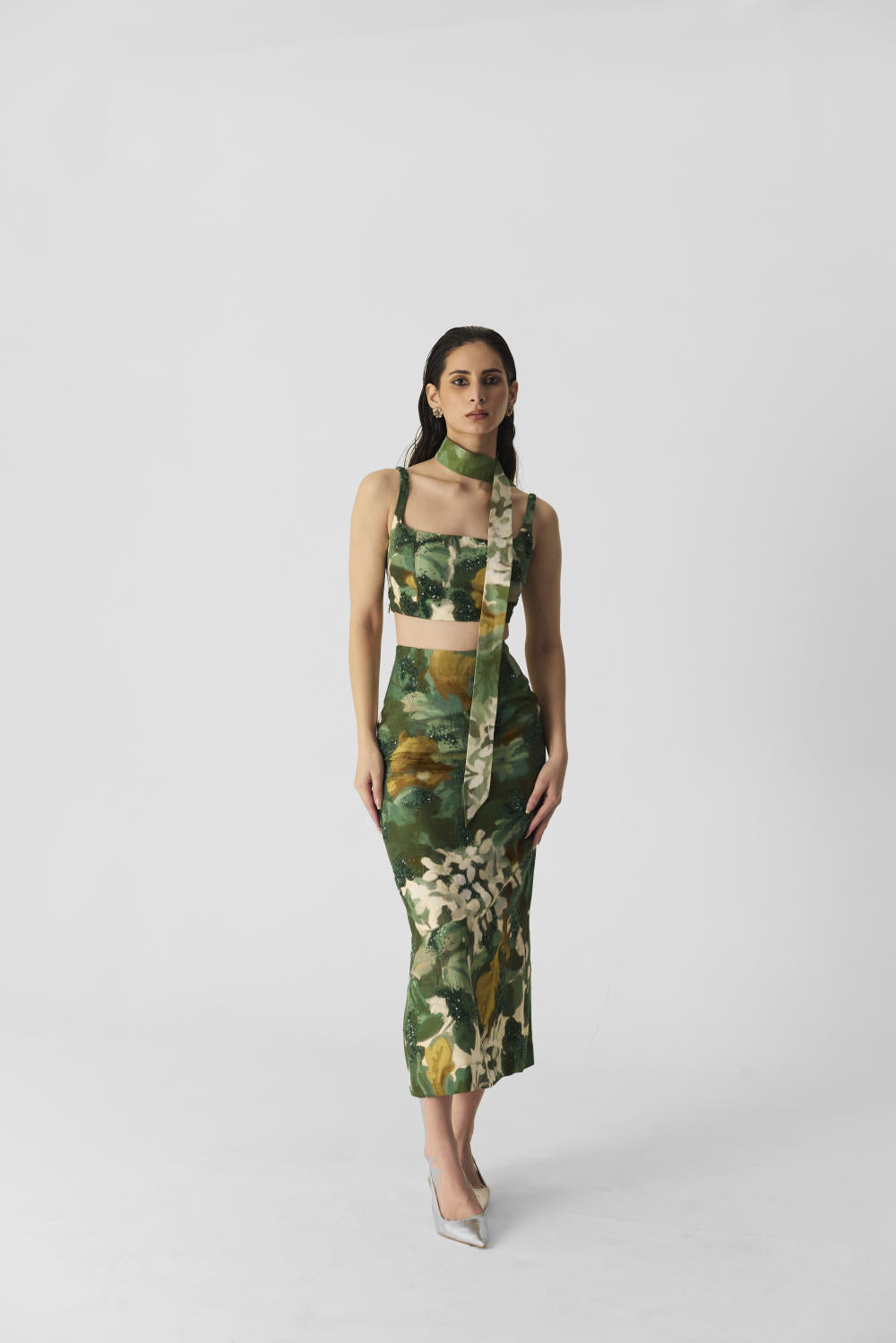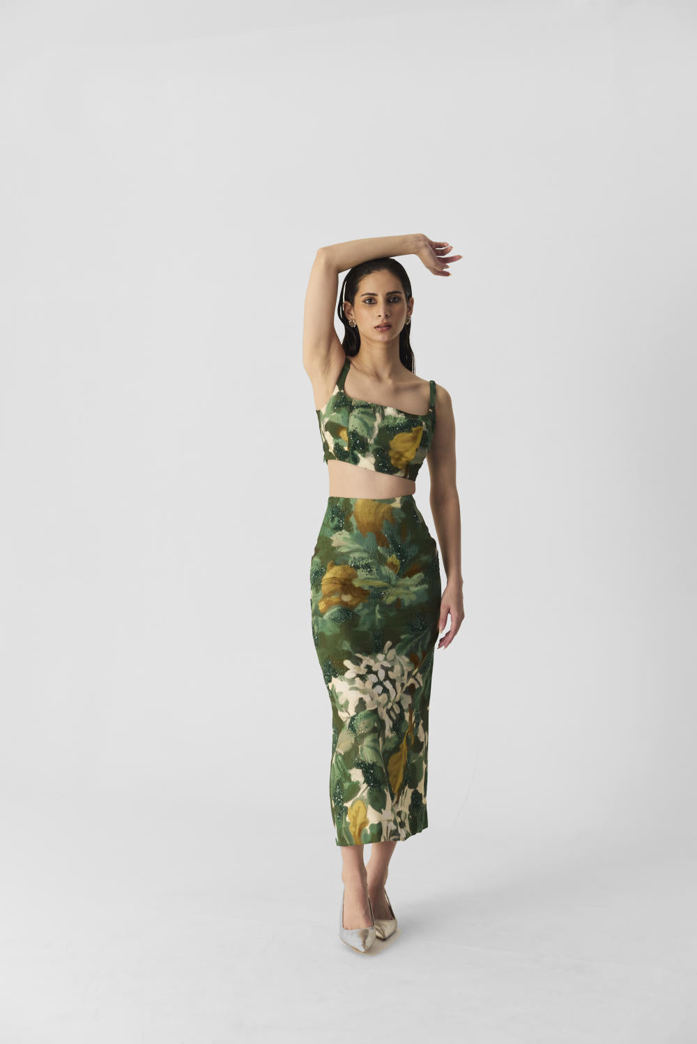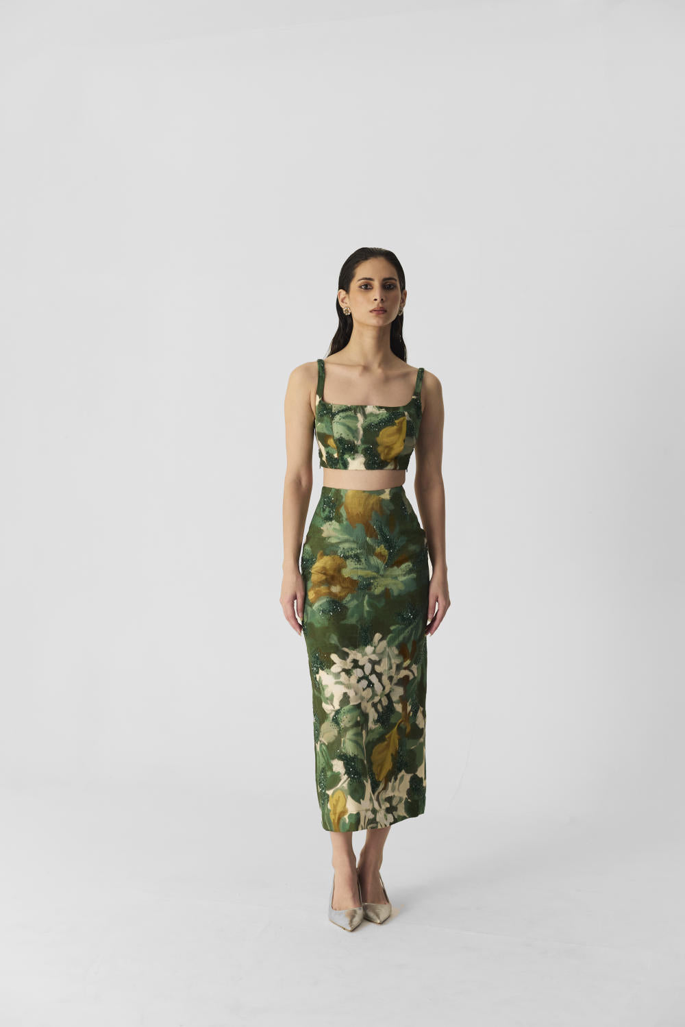 The print of this ensemble is inspired by the lush beauty of jungle flora, featuring vintage-style flowers that evoke a sense of natural elegance. The intricate design blends vibrant blooms with a timeless aesthetic The Rusi Skirt and Blouse Set is meticulously crafted from luxurious cotton silk fabric, offering both comfort and elegance. The blouse features exquisite hand embroidery with sequins on the front, along with side zippers on both sides for a tailored fit. The matching skirt also boasts intricate hand embroidery with sequins on the front, complemented by a center back zipper and slit for a flawless fit. Designed to enhance the vibrant print, this set is the perfect choice for festive occasions, combining timeless style with a modern touch.