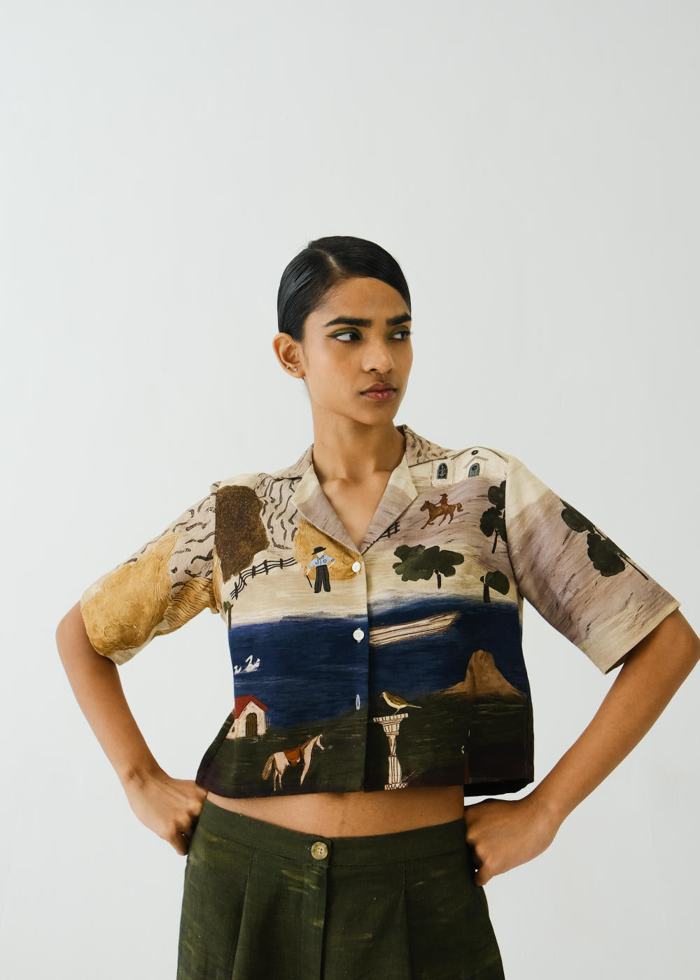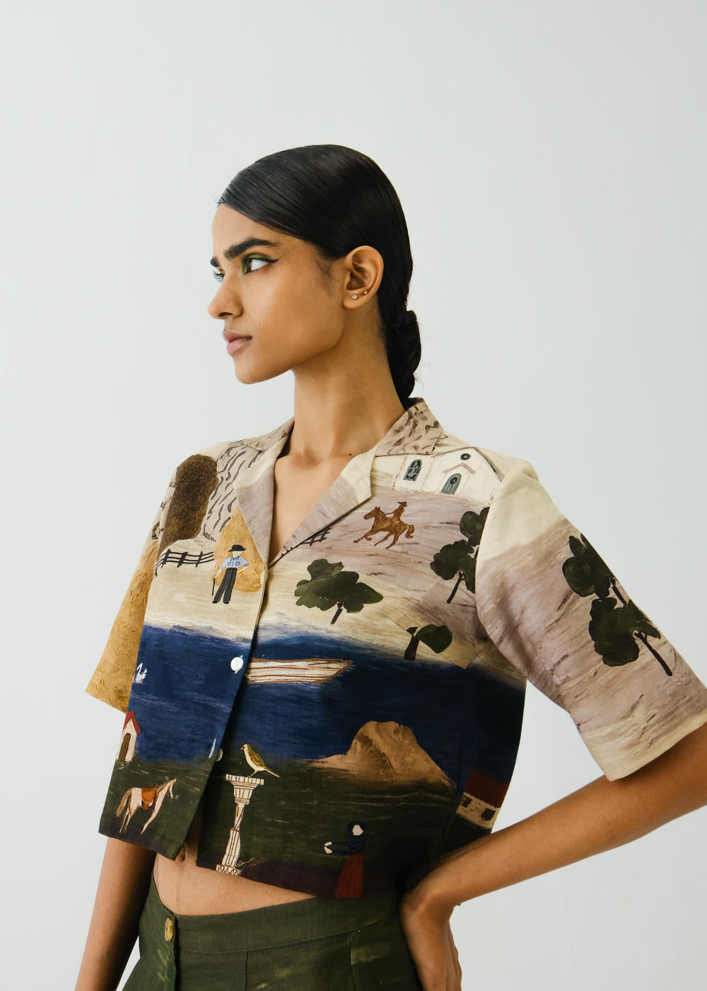 Crafted with meticulous attention to detail, this crop shirt is sure to become your go-to choice this season. Embrace the charm of the Village print. Each stroke tells a story, adding a touch of artisanal flair to your wardrob. Fabric : Linen