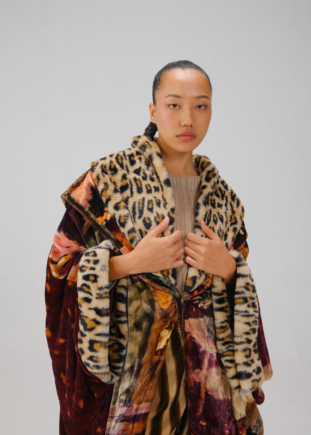 The Fur Overlay is an exaggerated cover-up in our High-tea print, featuring leopard fur trims on the collar and cuffs. It has a super-relaxed silhouette with massive bat sleeves for added drama.