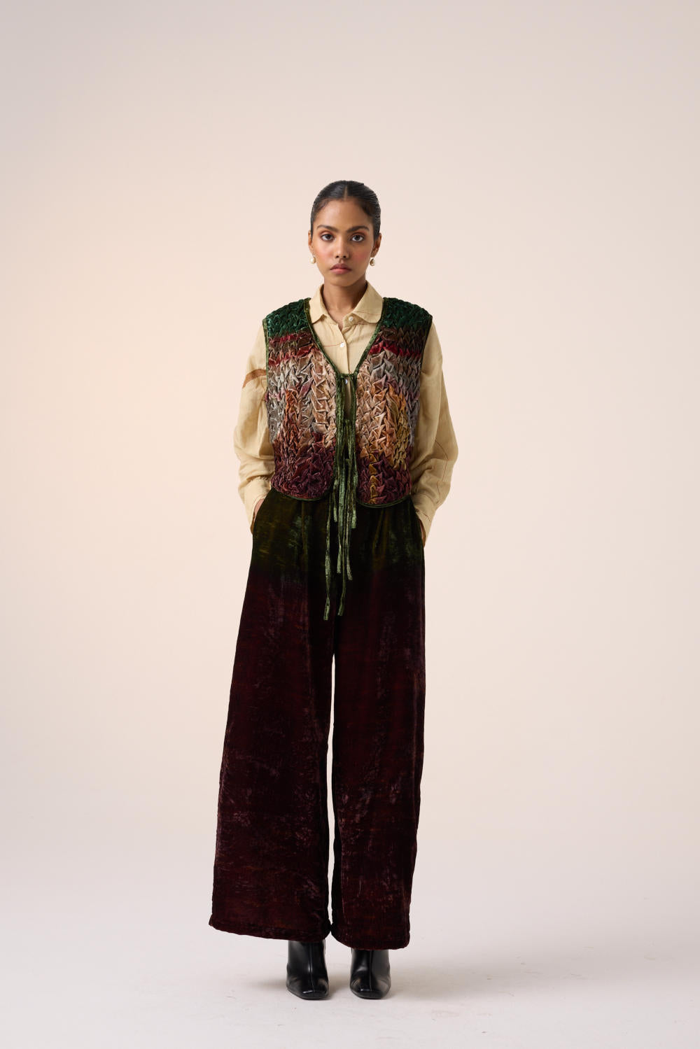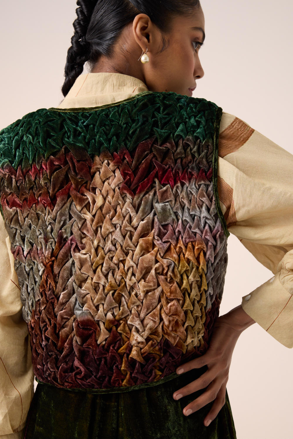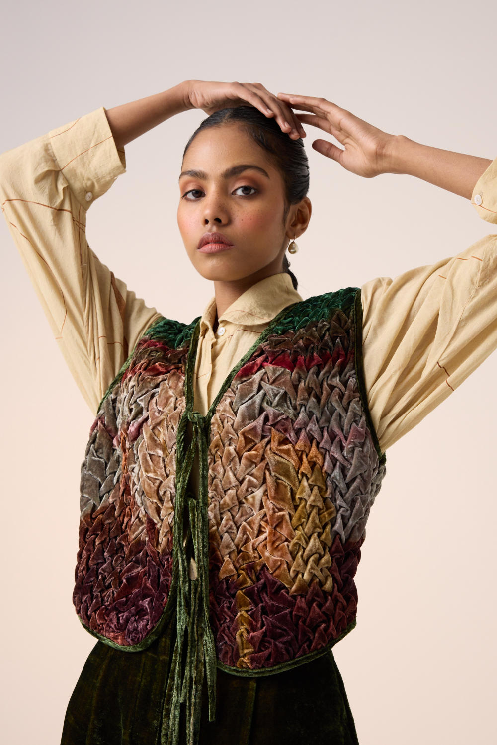 The Janett Gilet is made from a velvet fabric with floral quilting details. It features a tie-up string at the front with pista green piping around the body