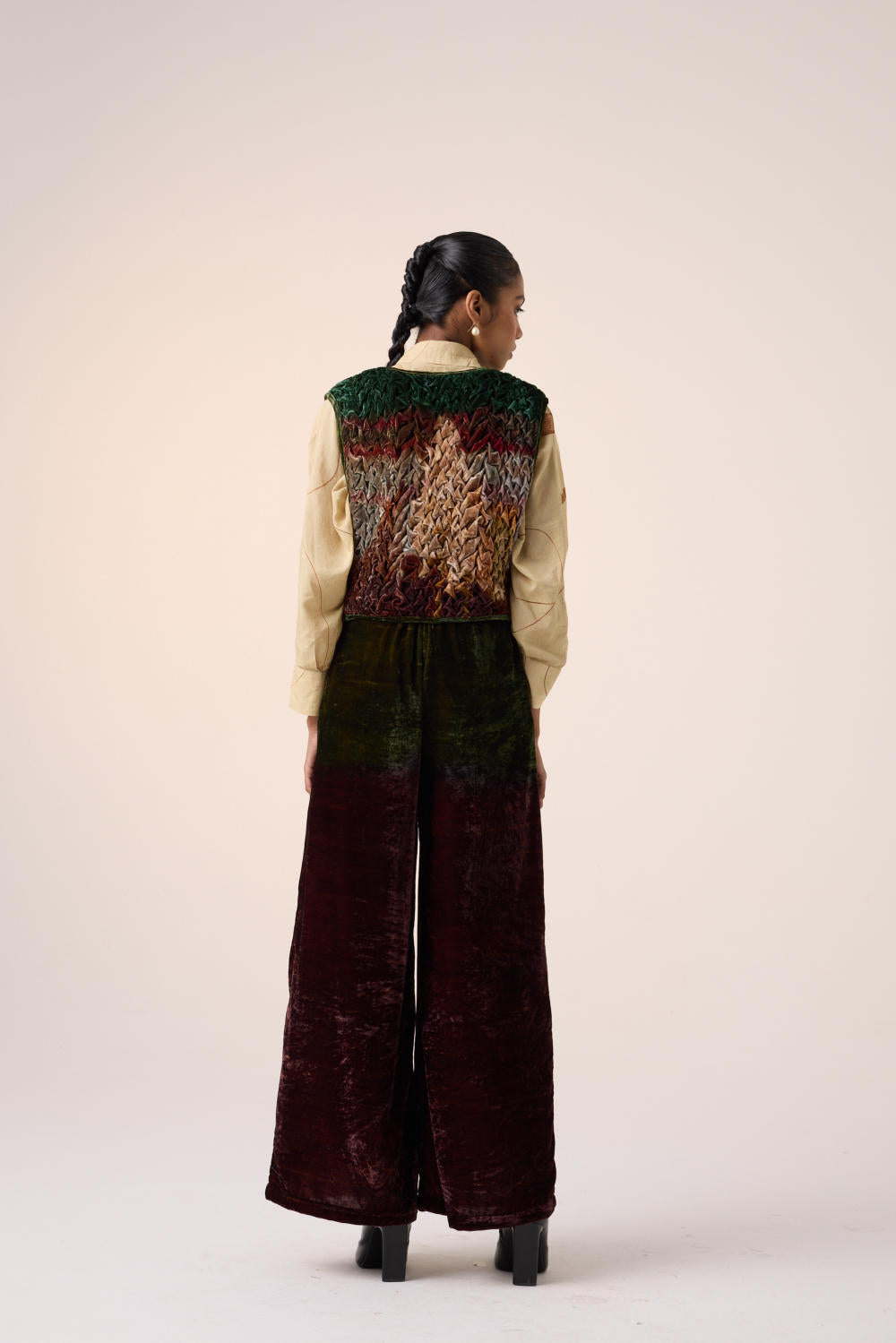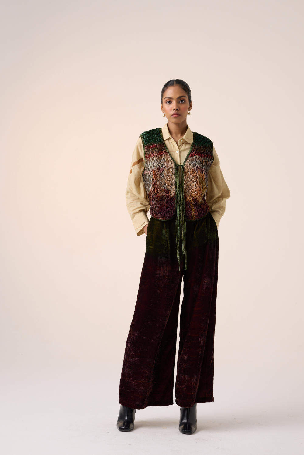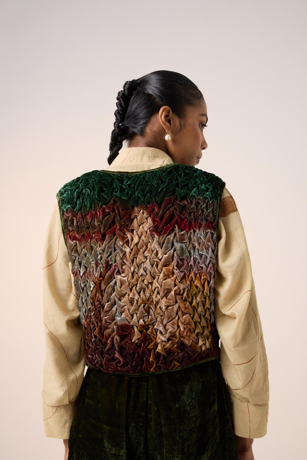 The Janett Gilet is made from a velvet fabric with floral quilting details. It features a tie-up string at the front with pista green piping around the body
