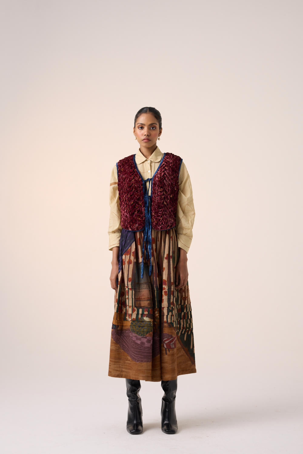 The Janett Gilet is made from a velvet fabric with floral quilting details. It features a tie-up string at the front with pista green piping around the body