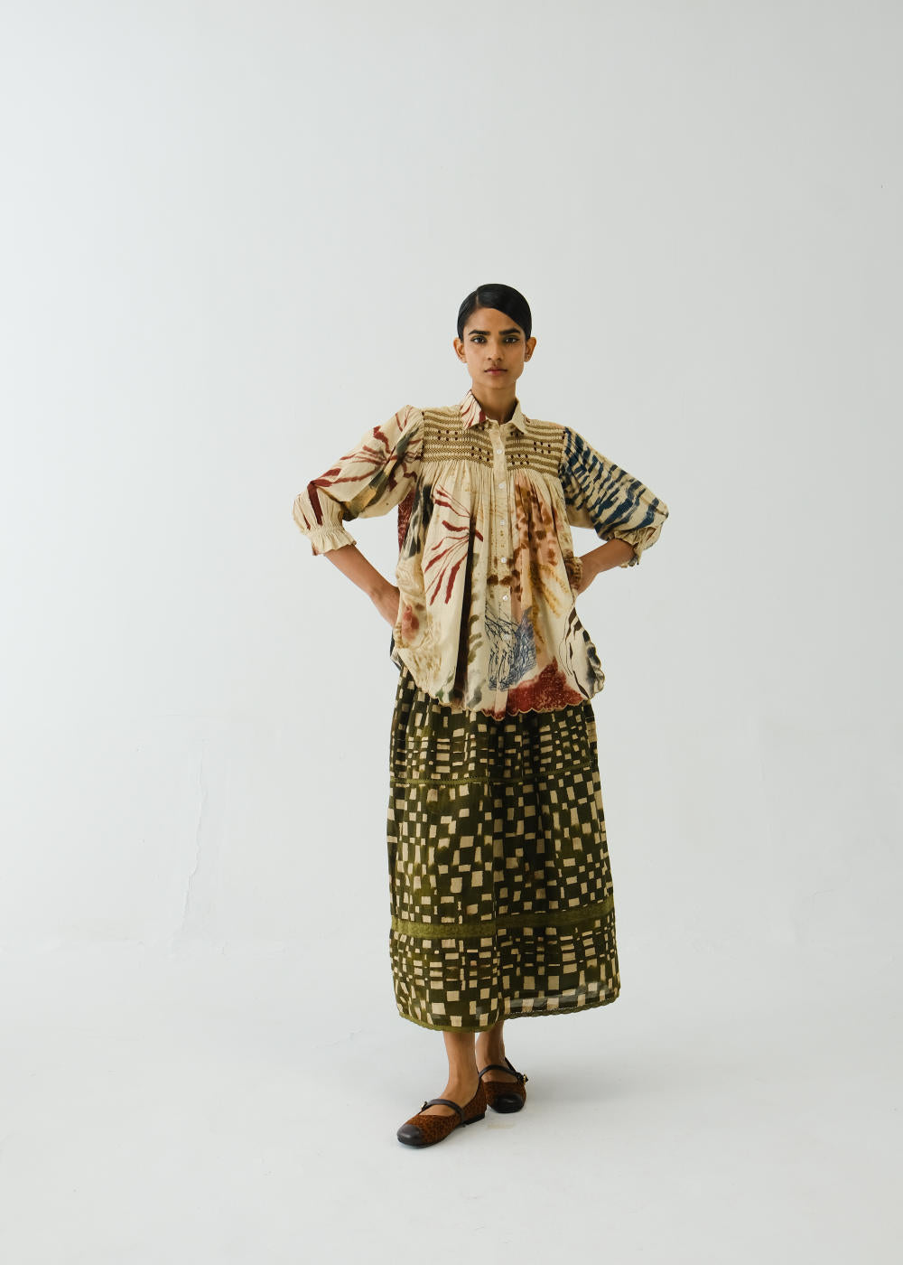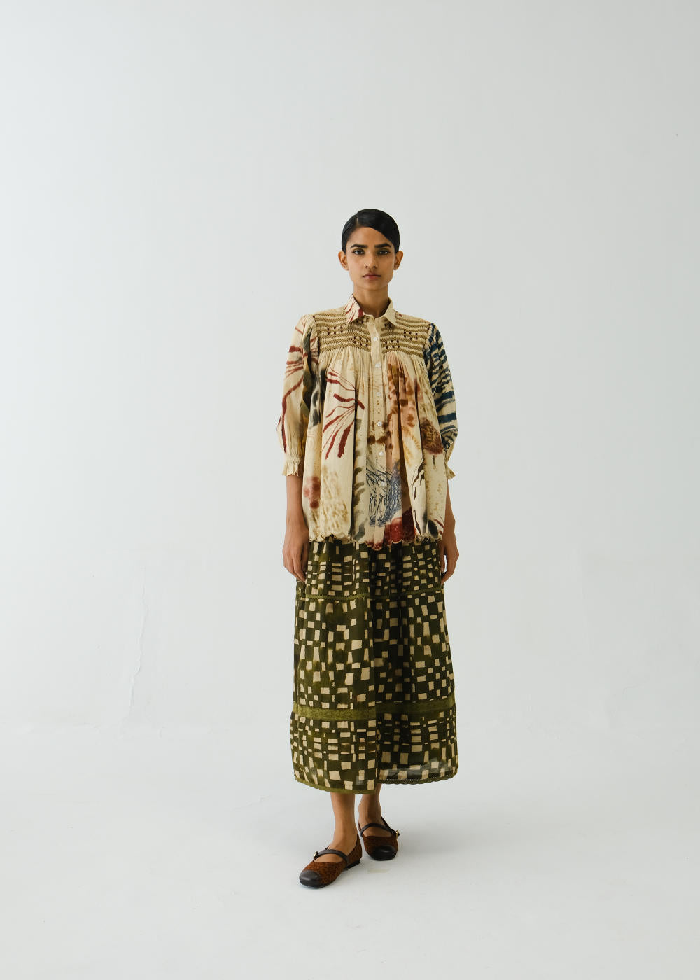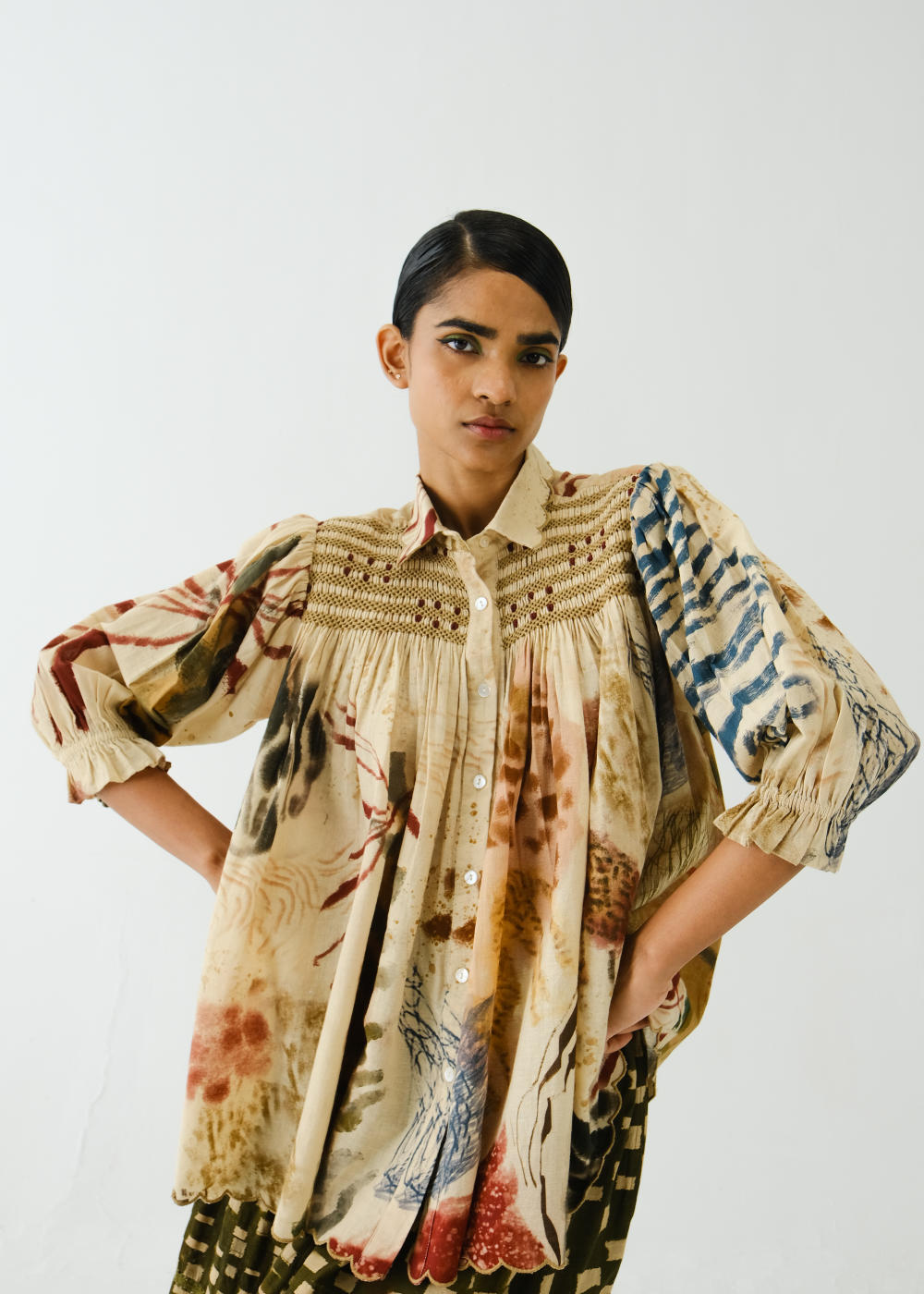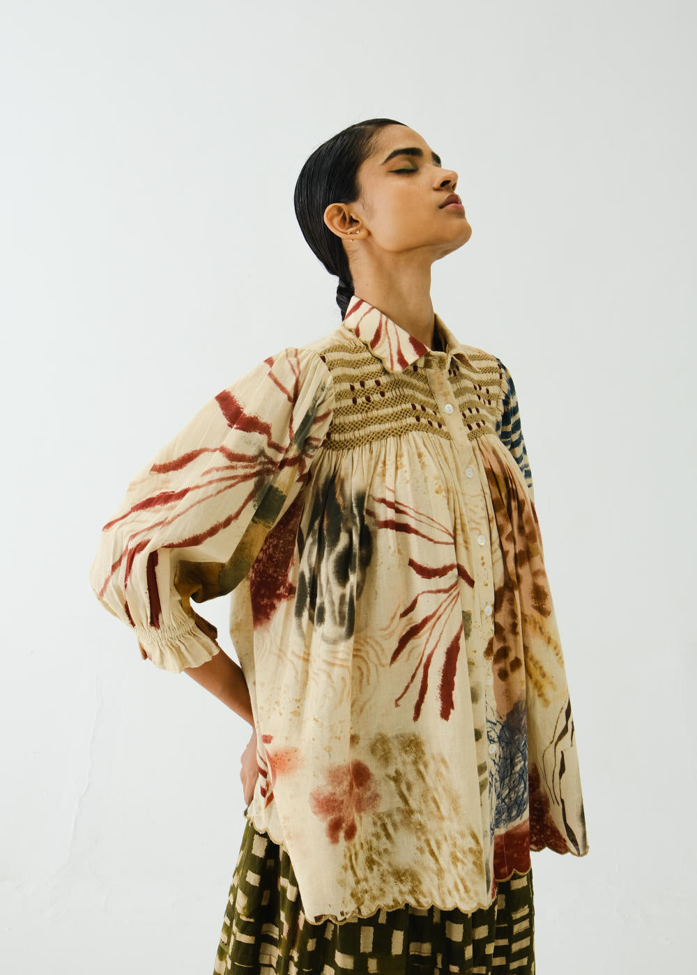The Judy Shirt is a button-down silhouette that blends artisanal charm with effortless wearability. It features a delicately hand-smocked yoke that adds texture and structure, while ruffled elasticated cuffs create a soft, voluminous effect. A scalloped hem lends a feminine, intricate finish, making it a versatile piece that balances elegance with a touch of whimsy. Fabric : Cotton