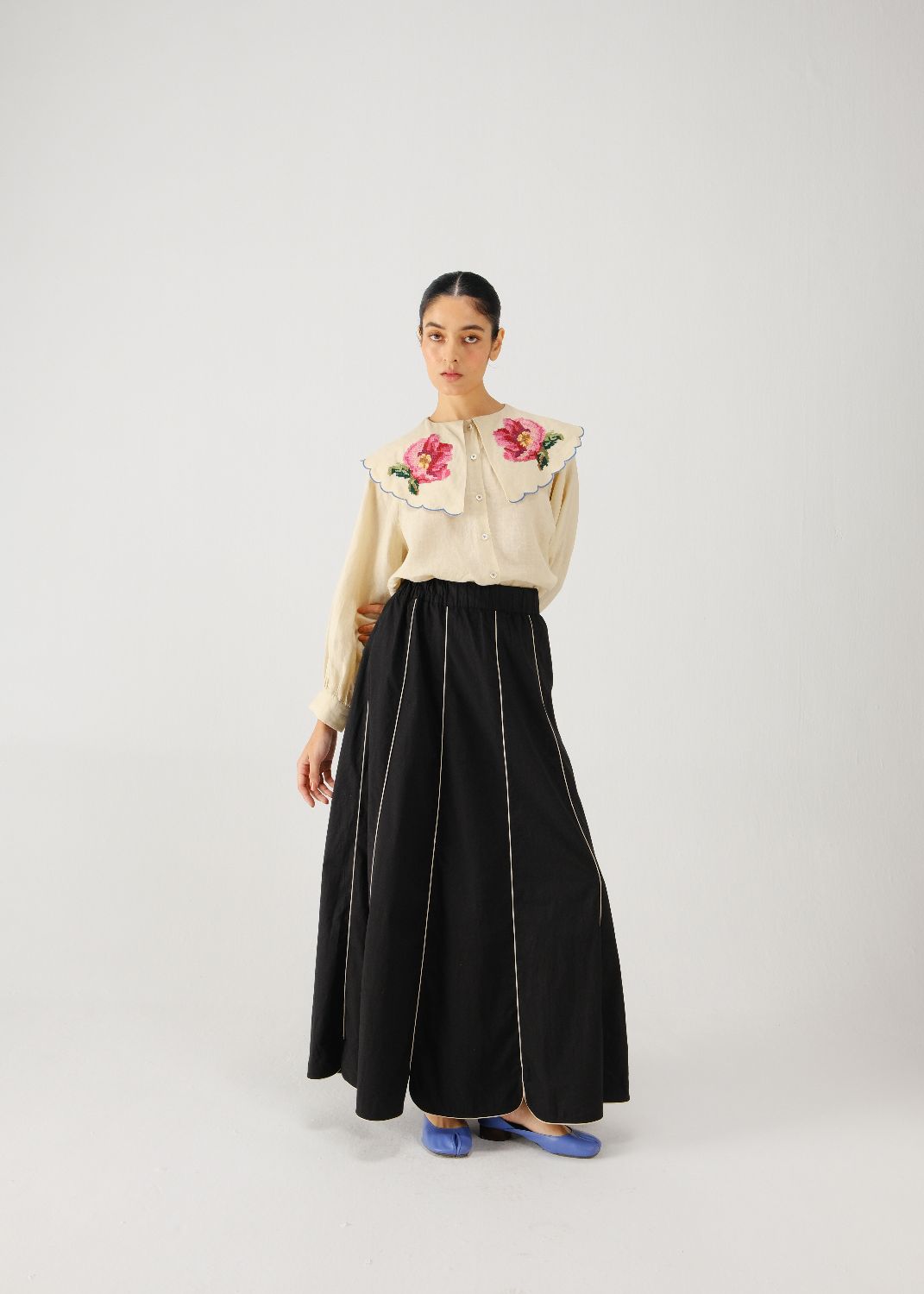 The Julia Top is a shirt made in linen with a Peter Pan collar. The collar has contrast scallop edging. The shirt has full sleeves with buttoned cuffs and a button-down front. A cross-stitch rose is hand-embroidered on the collar, adding a detail to the design.