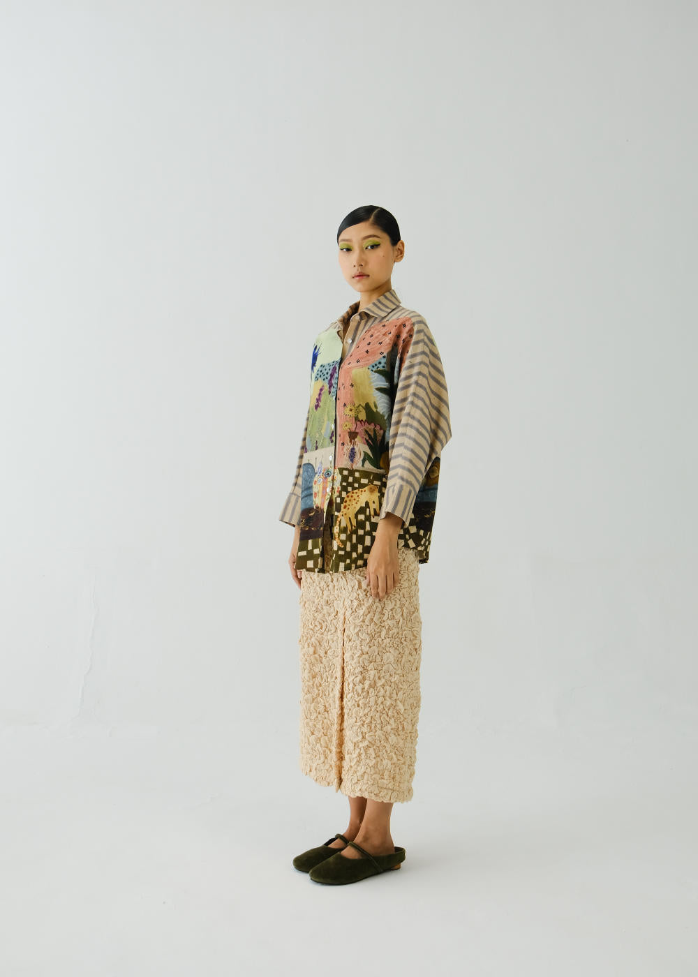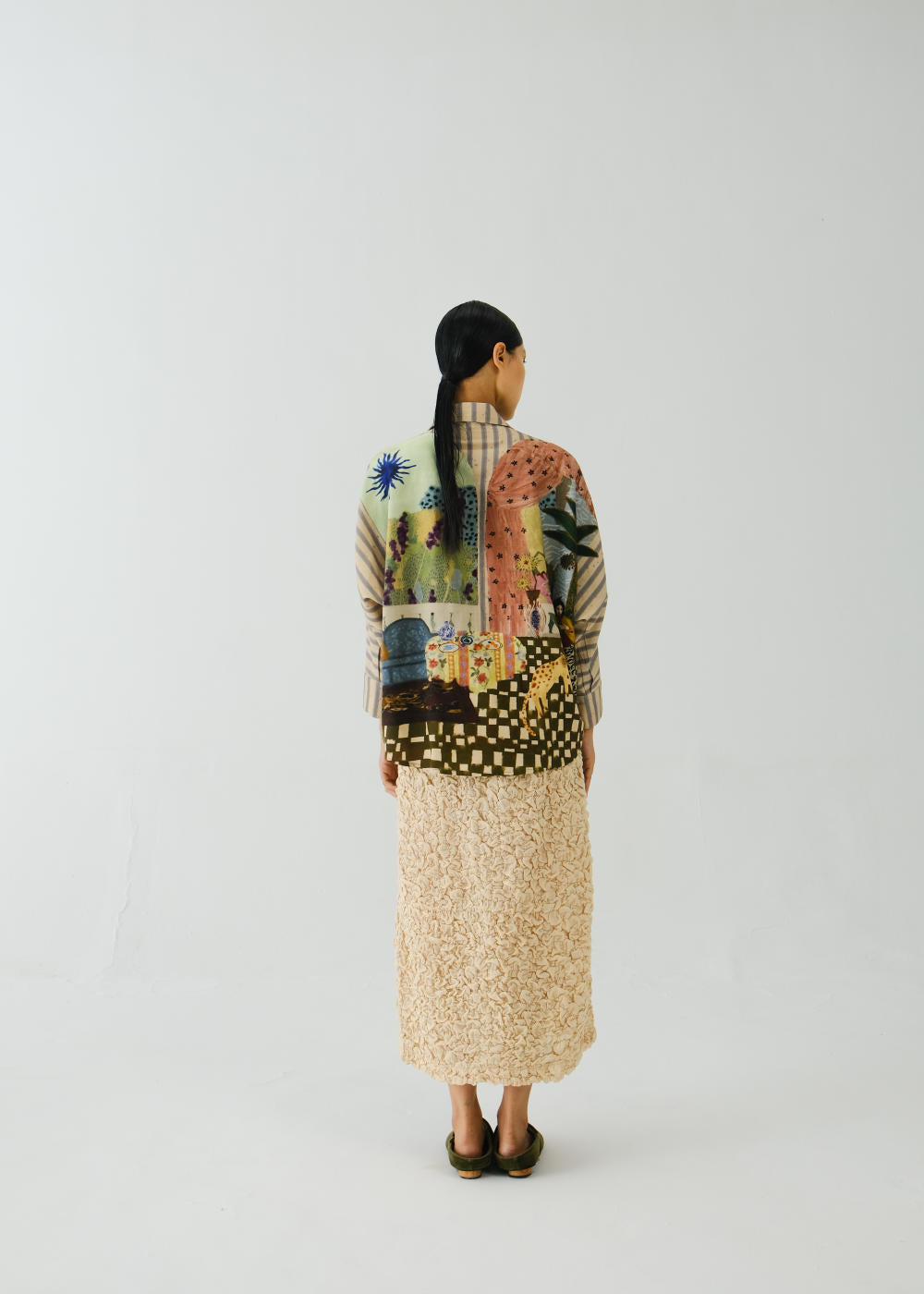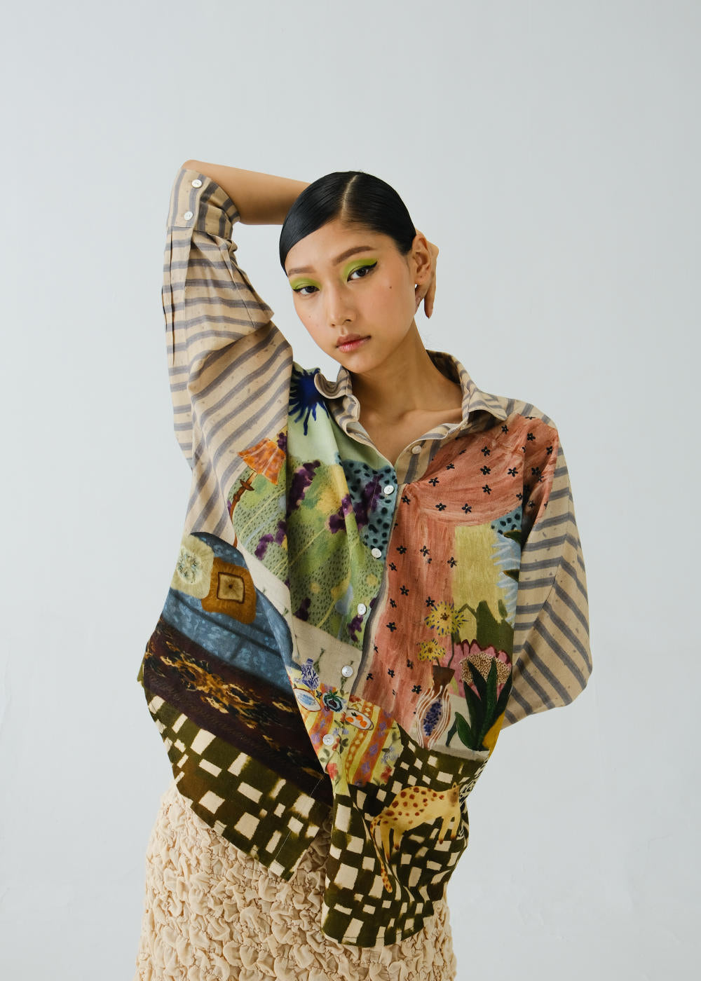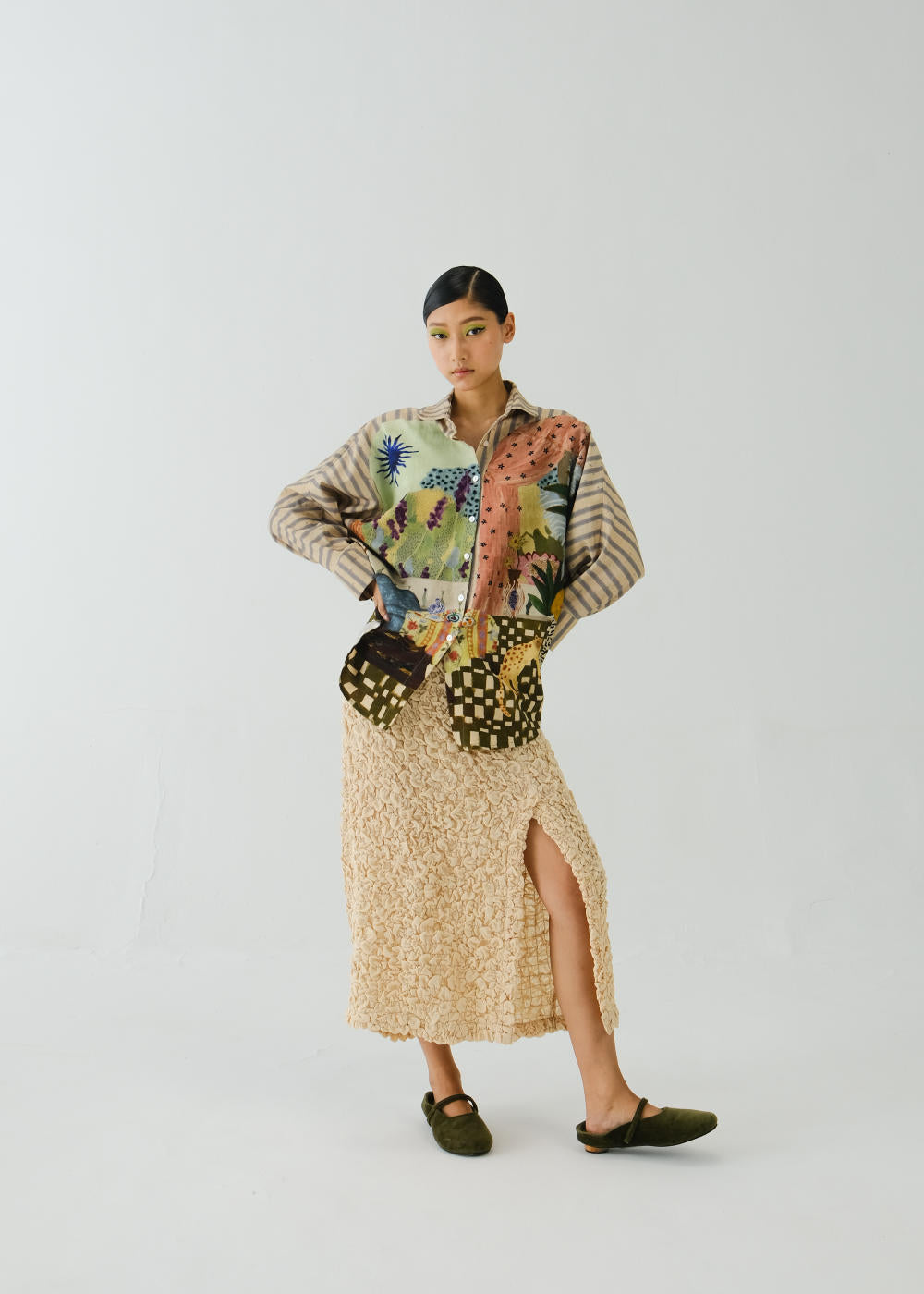 CORD blurs the line between art and attire in a way few labels dare to. Here, fabrics become canvases; illustrations—drawn by hand, steeped in imagination—flow across silhouettes that feel sculptural yet deeply wearable. Each piece has a texture of memory to it, as if it carries echoes of a past life, now reframed for a contemporary world.