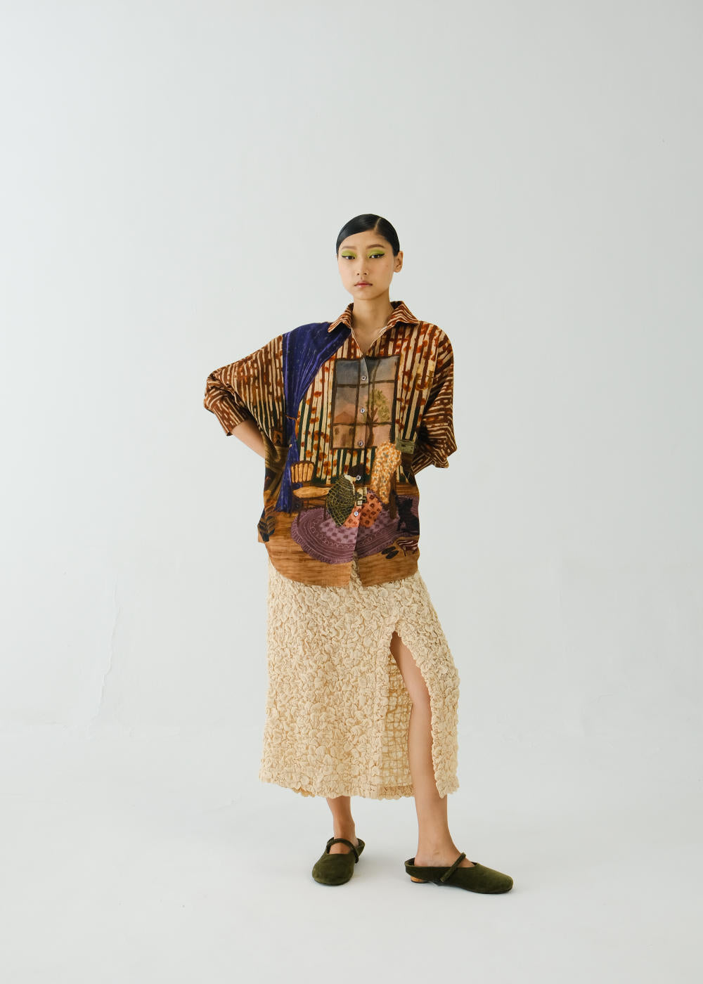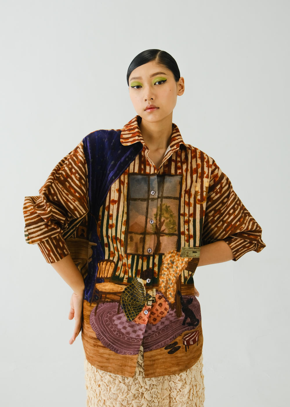 CORD blurs the line between art and attire in a way few labels dare to. Here, fabrics become canvases; illustrations—drawn by hand, steeped in imagination—flow across silhouettes that feel sculptural yet deeply wearable. Each piece has a texture of memory to it, as if it carries echoes of a past life, now reframed for a contemporary world.