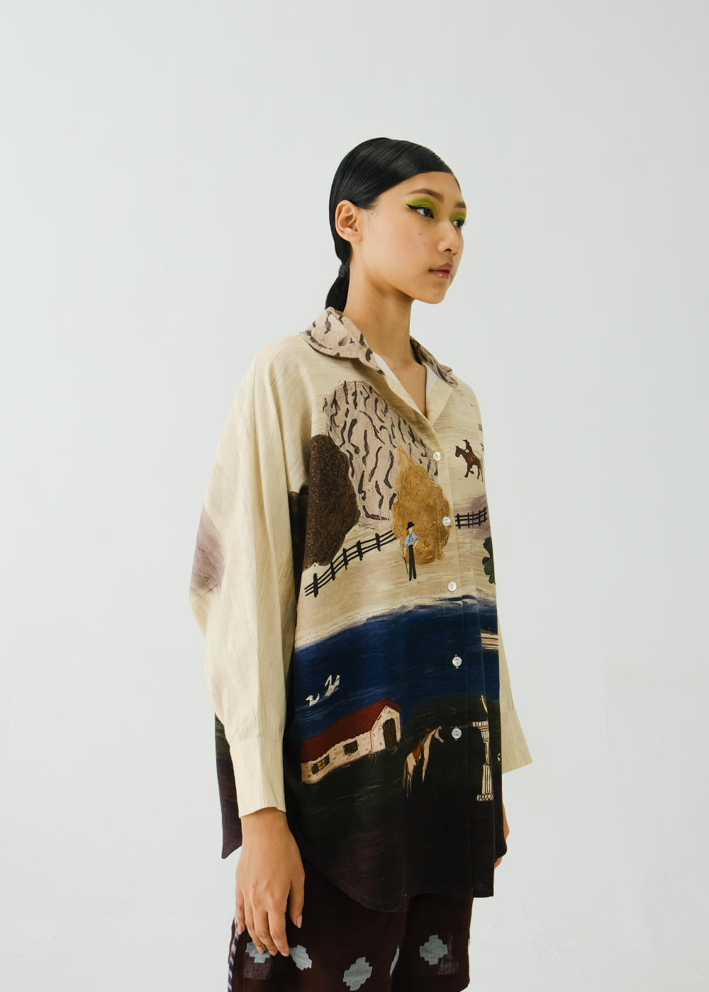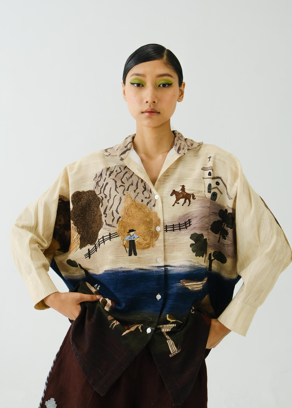 CORD blurs the line between art and attire in a way few labels dare to. Here, fabrics become canvases; illustrations—drawn by hand, steeped in imagination—flow across silhouettes that feel sculptural yet deeply wearable. Each piece has a texture of memory to it, as if it carries echoes of a past life, now reframed for a contemporary world.