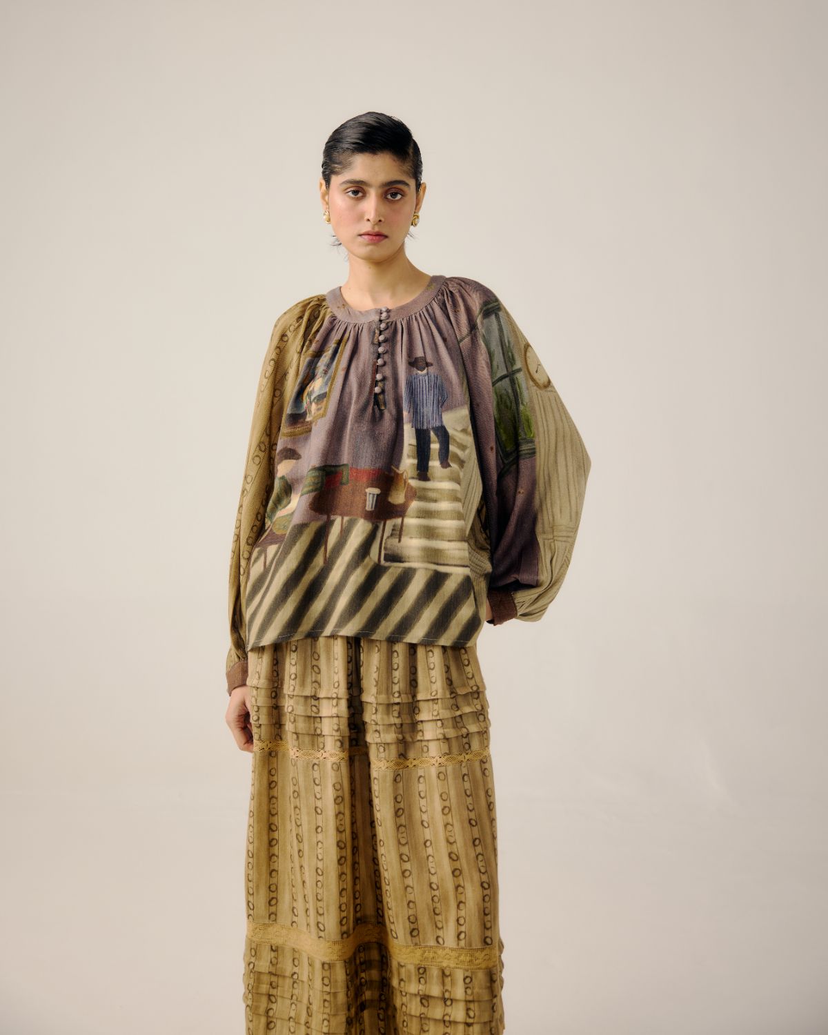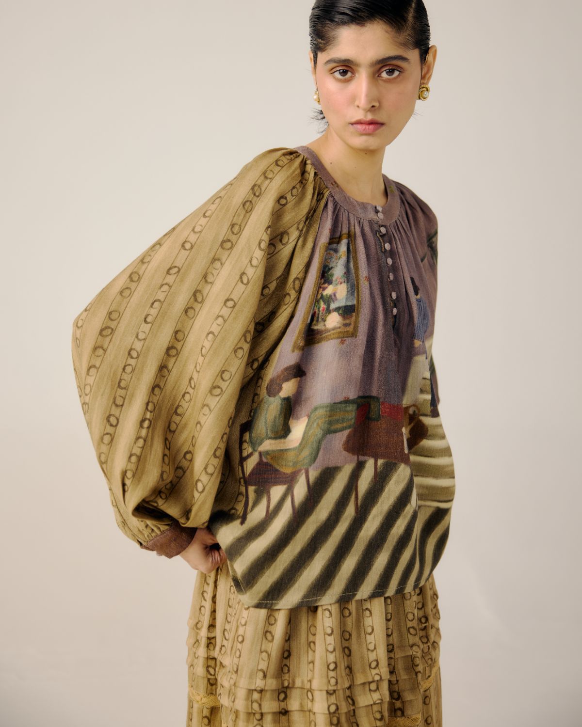 The Lido Top in Living Room Print, crafted from soft wool fabric, features a gathered neckline, bishop sleeves with cuffed ends, and a relaxed silhouette. With its vibrant colors and versatile design, it pairs effortlessly with skirts or pants for a chic, everyday look.