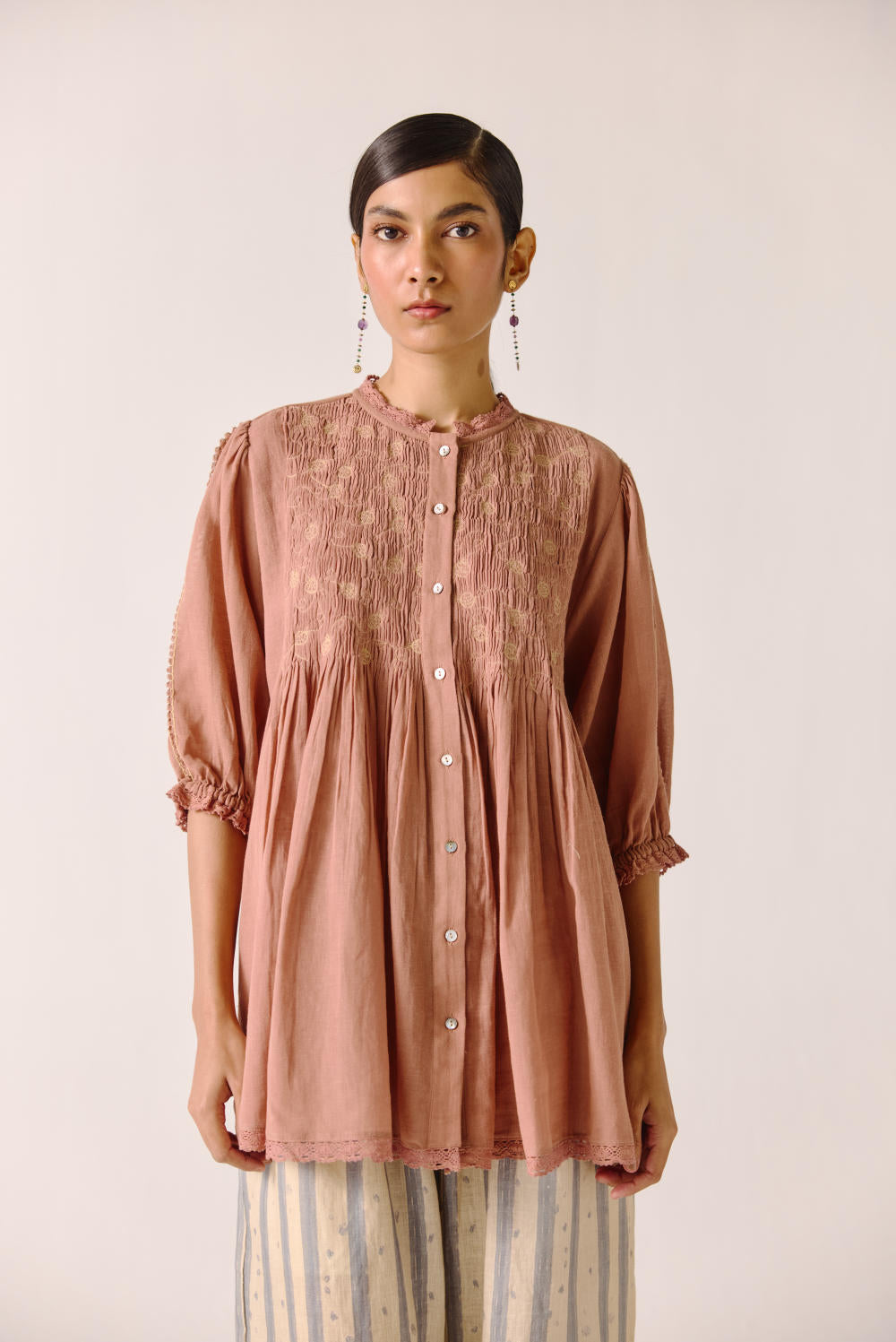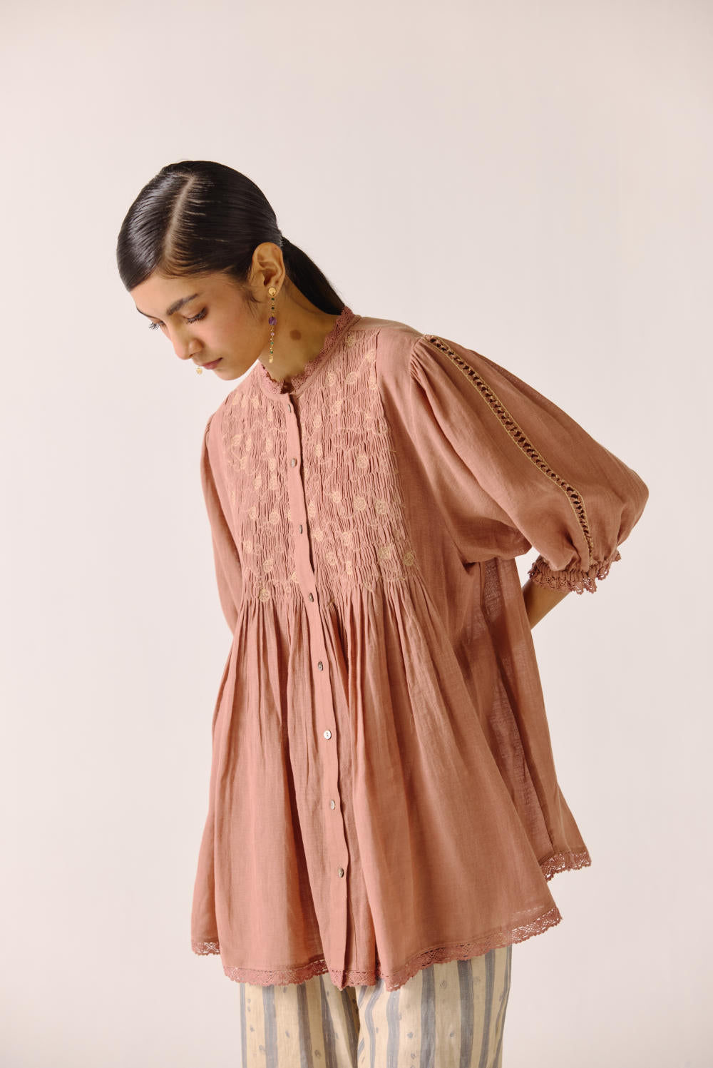 The Nova top is made from cotton in our Peach anaar embroidery, a button-down top. It features scallop lace detail on the neck, cuff and hem.