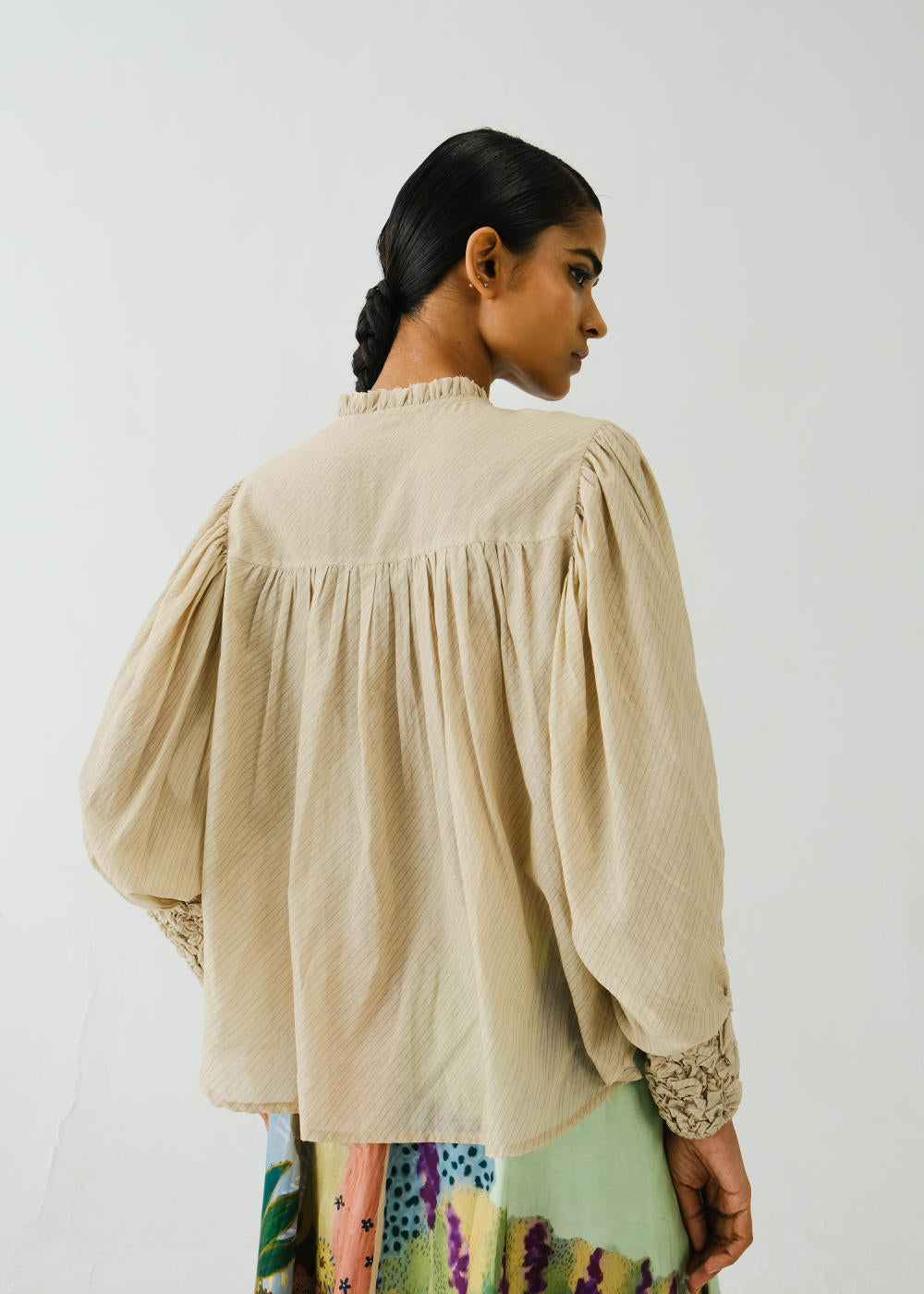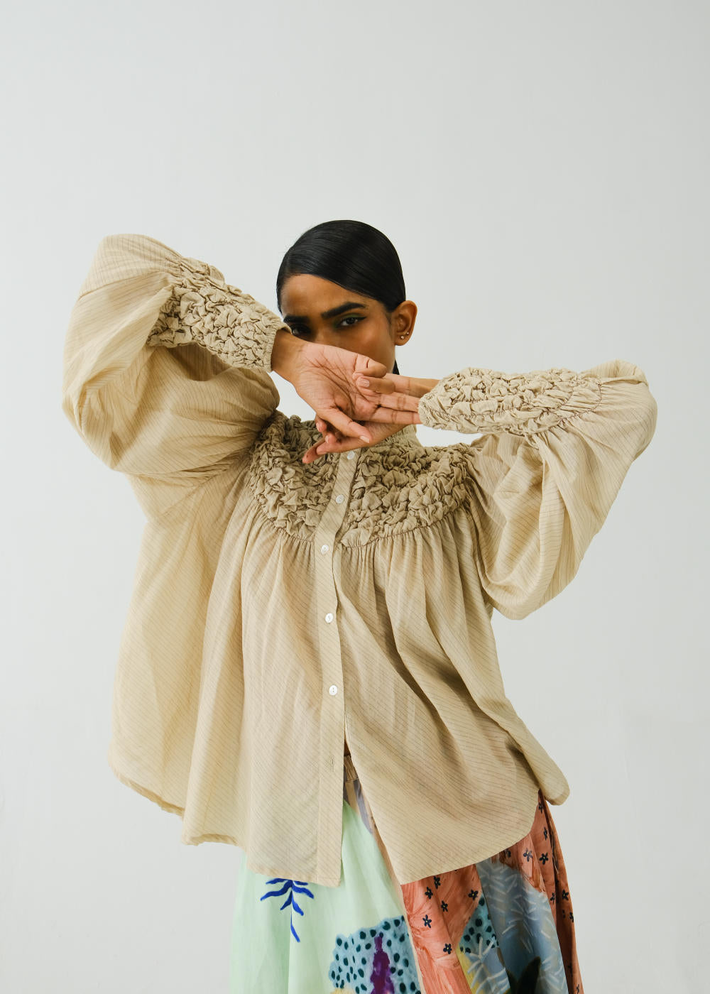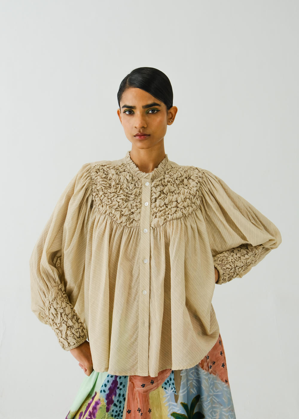 A relaxed, easygoing roosted shirt in classic ivory. Designed with soft elasticated smocking around the neckline and cuffs, it offers subtle texture and shape. The button-up front keeps it versatile, while the breezy fabric and relaxed silhouette make it an effortless everyday staple.