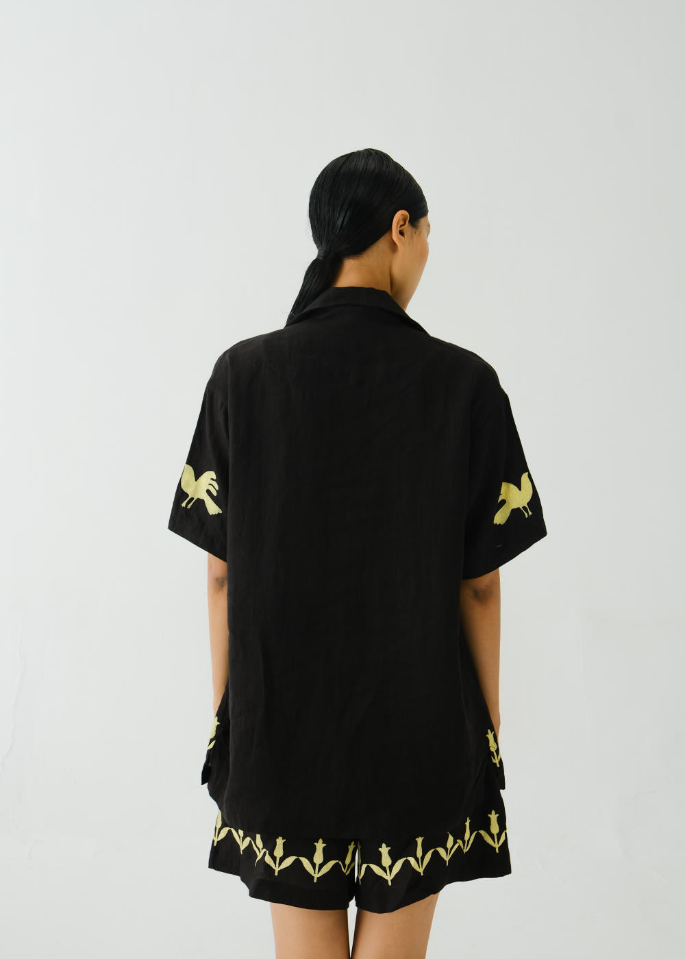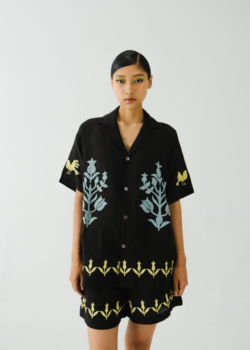 Crafted from 100% linen, this boxy-fit shirt blends comfort with artisanal charm. Designed with a notch collar and subtle sleeve details, it offers a relaxed, oversized fit that flatters a range of sizes. Block-printed flowers and bird adorn the hem and sleeves, adding a delicate touch, while intricate appliqué detailing on the front enhances its handcrafted appeal. Lightweight and breathable, this versatile piece is perfect for effortless, everyday styling