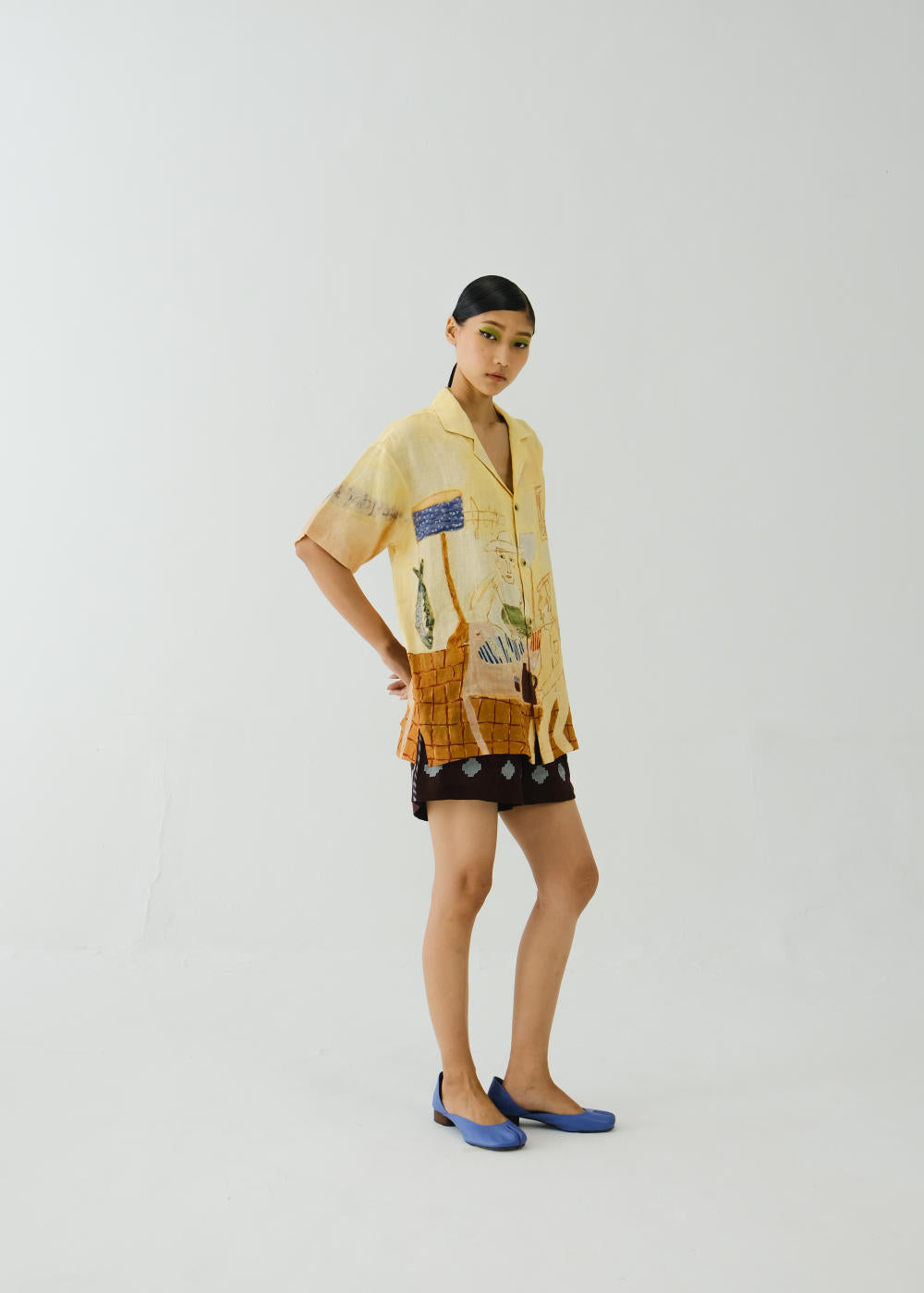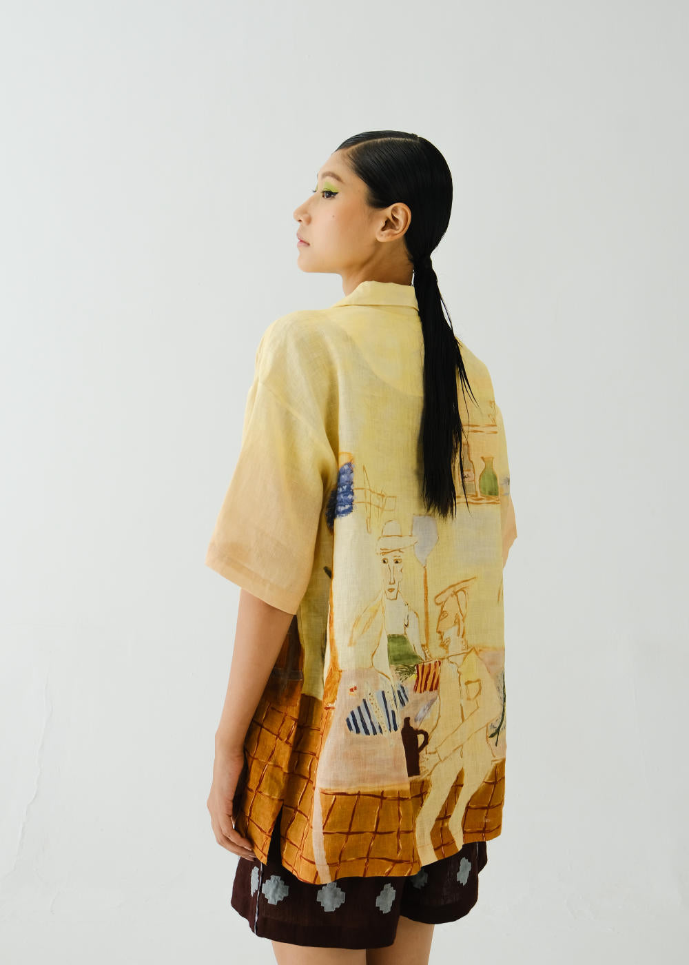 Boxy fit shirt made in 100% linen with collar and sleeve details, gives an oversized fit till a large size. Fabric : Linen