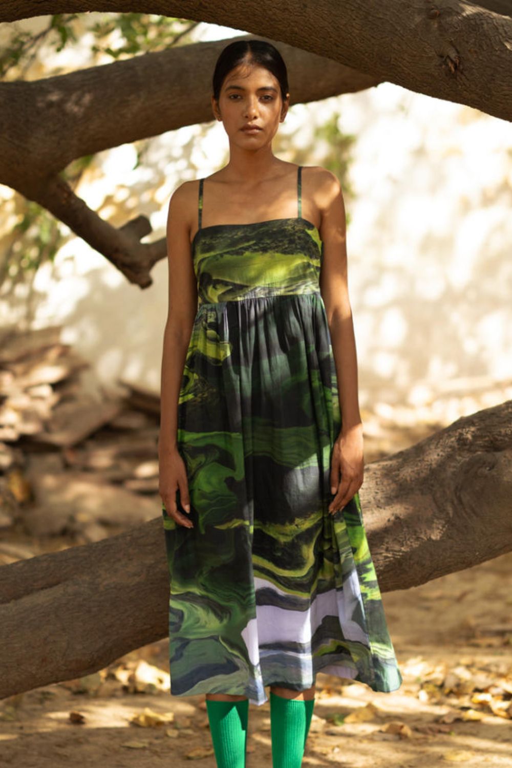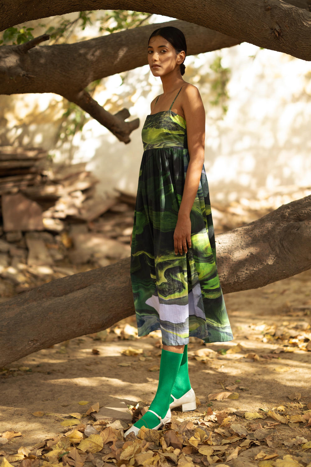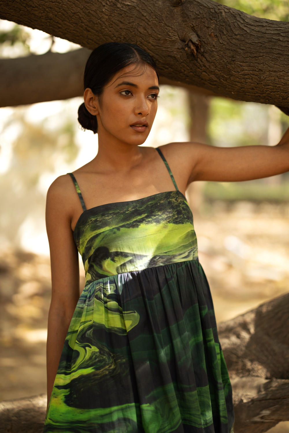 Description: Printed strappy dress, gathered at waist and smocking details at the back. The dress comes with adjustable staps and pockets.