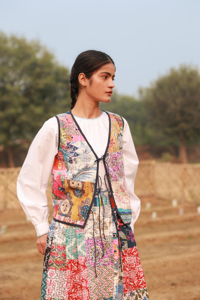 A unique Kantha patchwork vest crafted with intricate hand-stitched details and a playful mix of colors and patterns. Featuring a flattering V-neck and tie-up closures, this lightweight vest is perfect for layering over dresses or casual outfits for a vibrant, boho-inspired look.