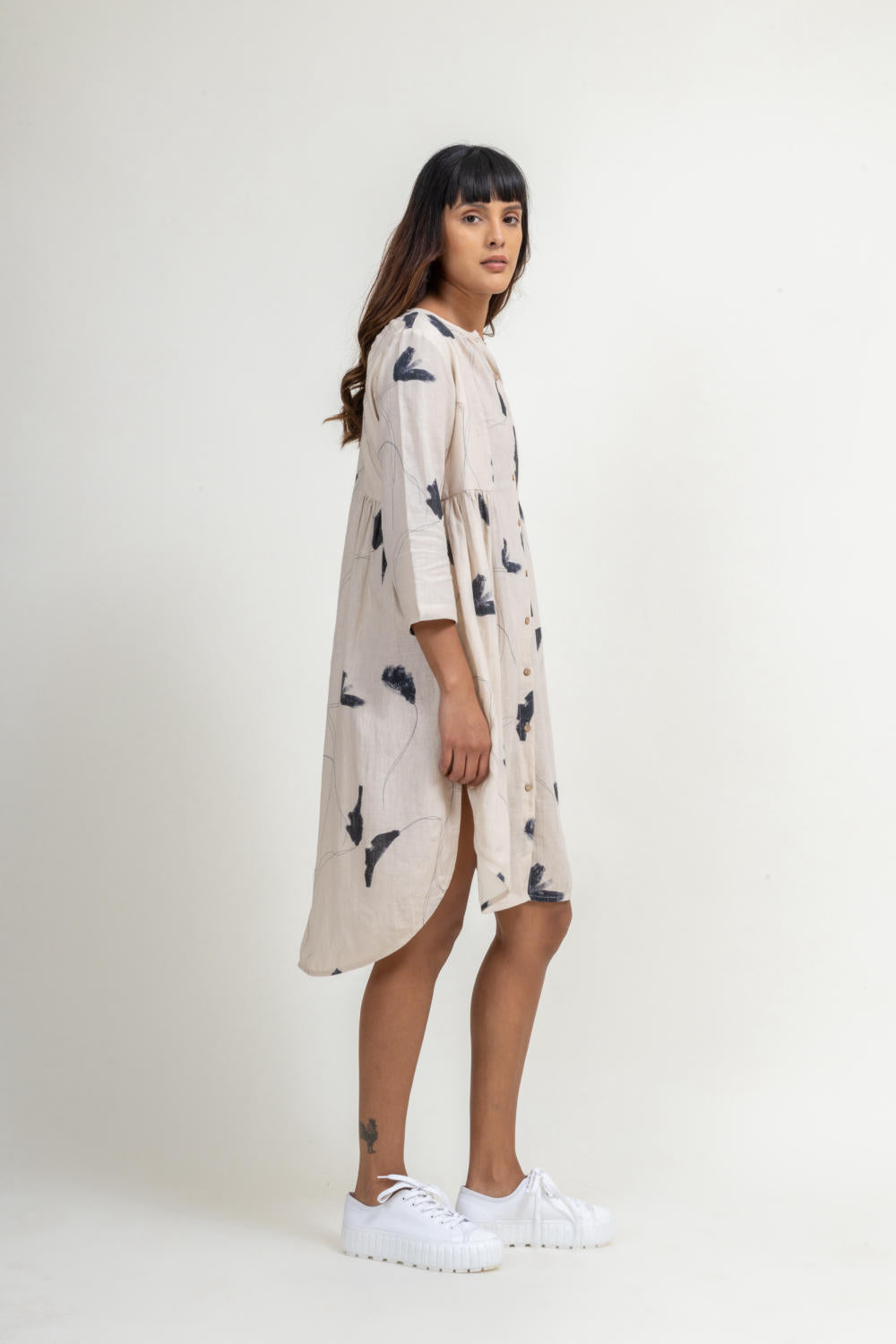 Description: Side paneled tunic with subtle side gathers and front button opening.