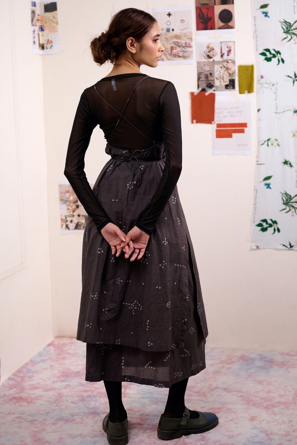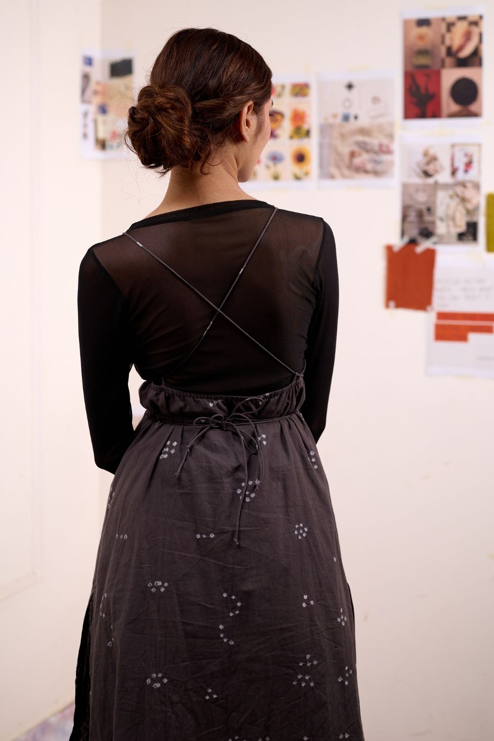 Description: Product Detail: A statement festive piece in organic cotton bandhani, designed to flow effortlessly with every movement. This tunic features delicate shoulder straps, a deep back with cross-string detailing, and an adjustable drawstring waist for a custom fit. The elegant side slit adds fluidity, while the rich navy tone enhances its timeless sophistication. Lightweight yet festive, this tunic transitions seamlessly from intimate gatherings to grand celebrations. Material: Organic cotton