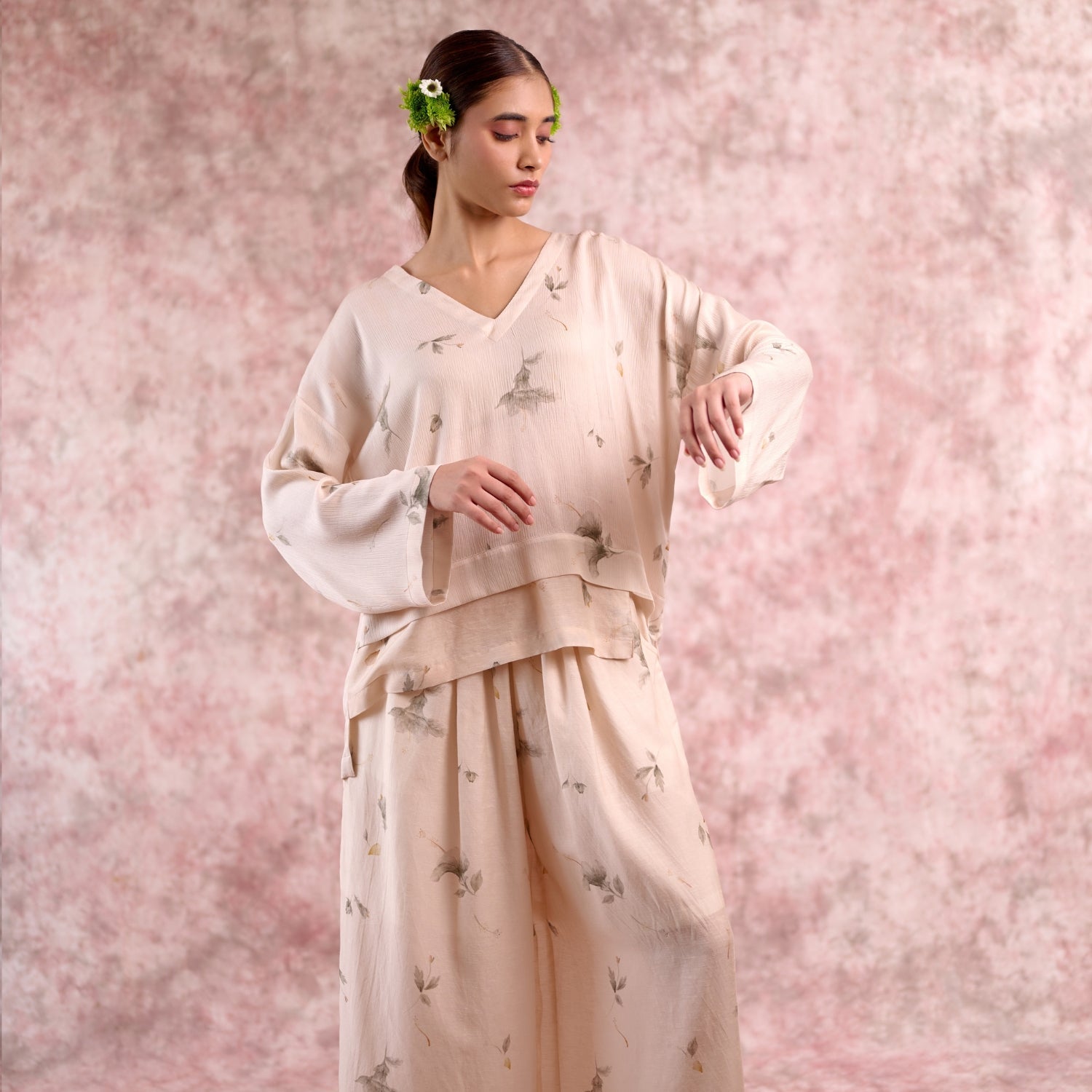 A flowy festive top crafted in Bemberg linen georgette (recycled fabric) with a soft beige base and delicate all-over print. Featuring a V-neckline, relaxed fit, and a layered hemline, this piece drapes beautifully for effortless elegance. Lightweight and breathable, it transitions seamlessly from festive occasions to everyday wear.
