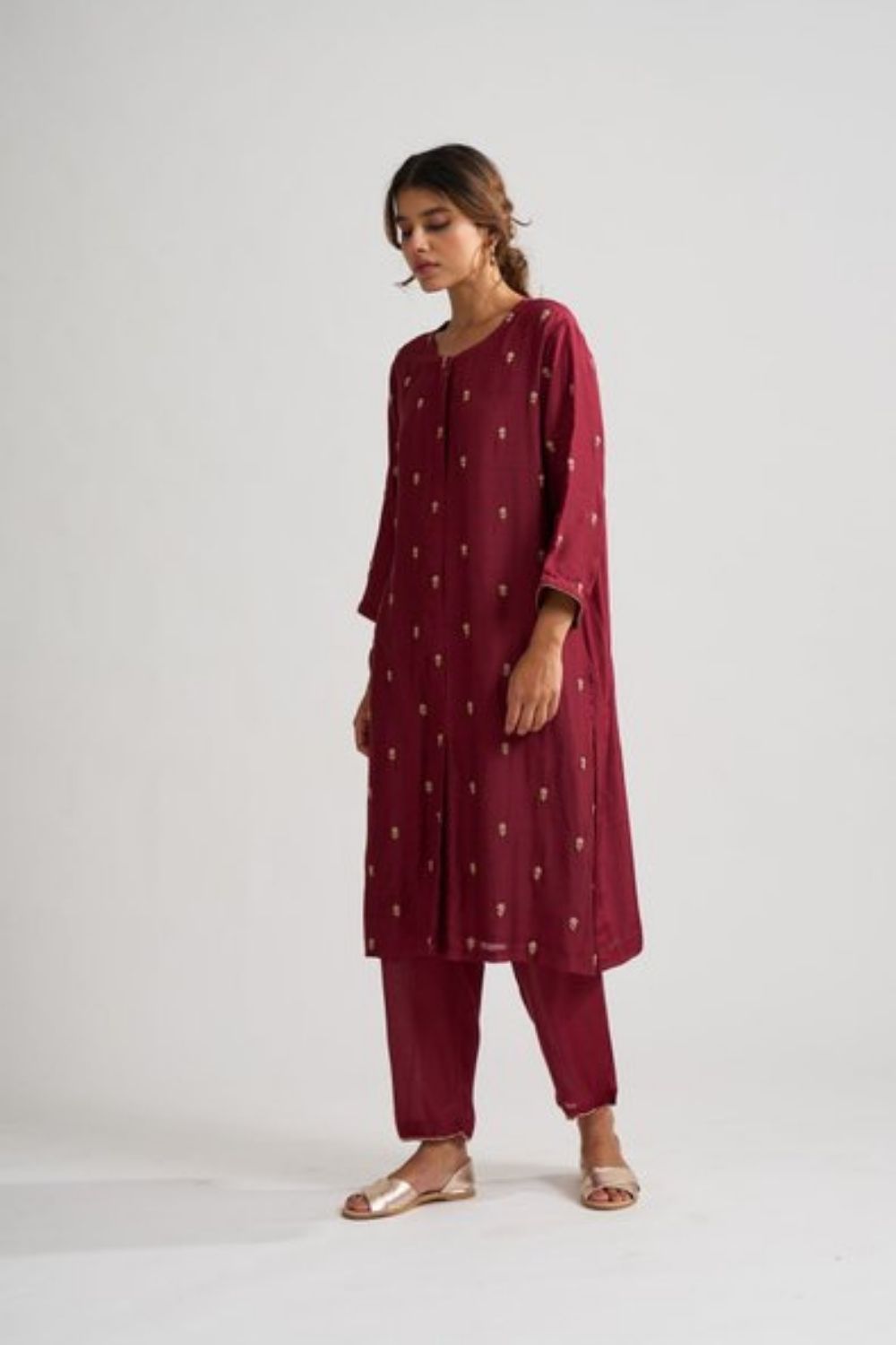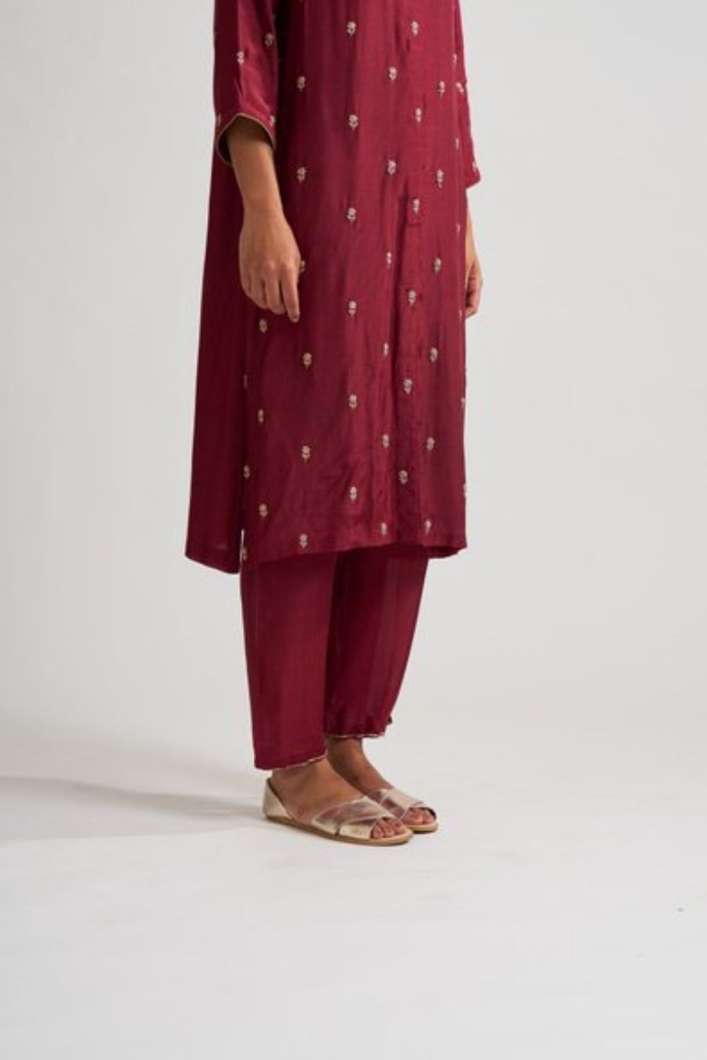 Rohita kurta set is a perfect blend of contemporary fashion and traditional roots. Its a two piece garment made in cotton silk. It's embellished with delicate hand embroidered buds of flowers. The motif is made with dabka and the intricacy of french knots made in zari.