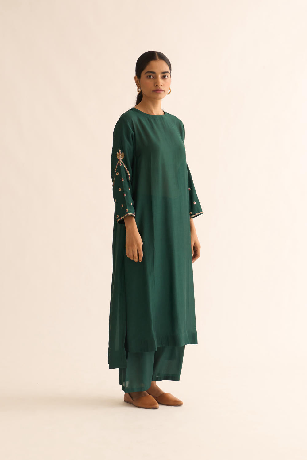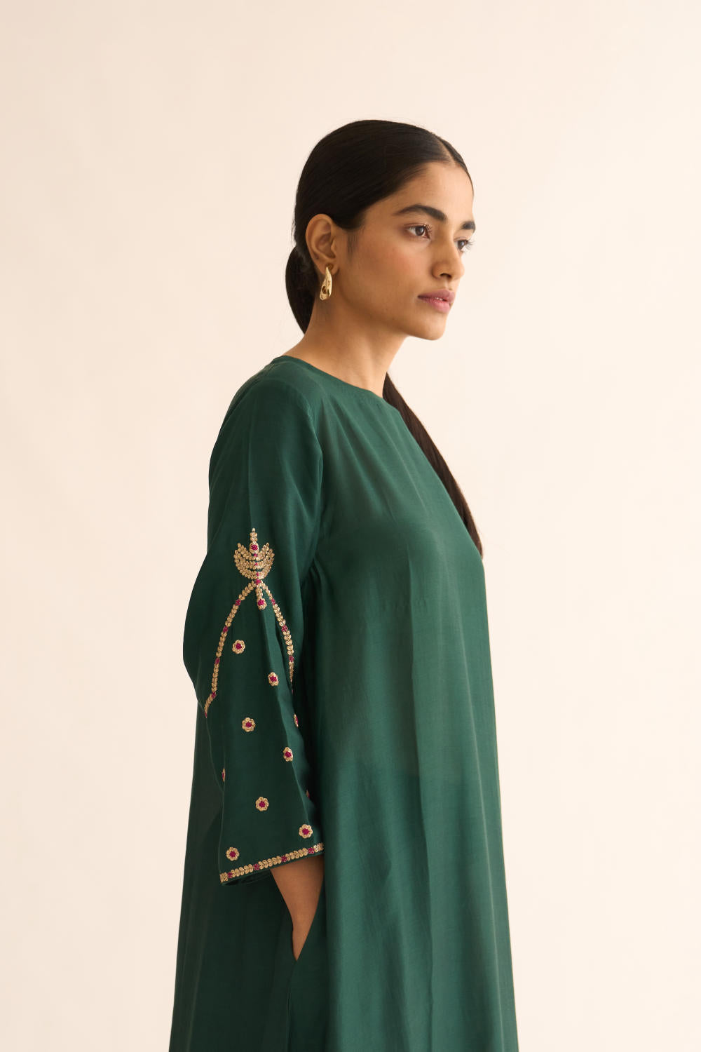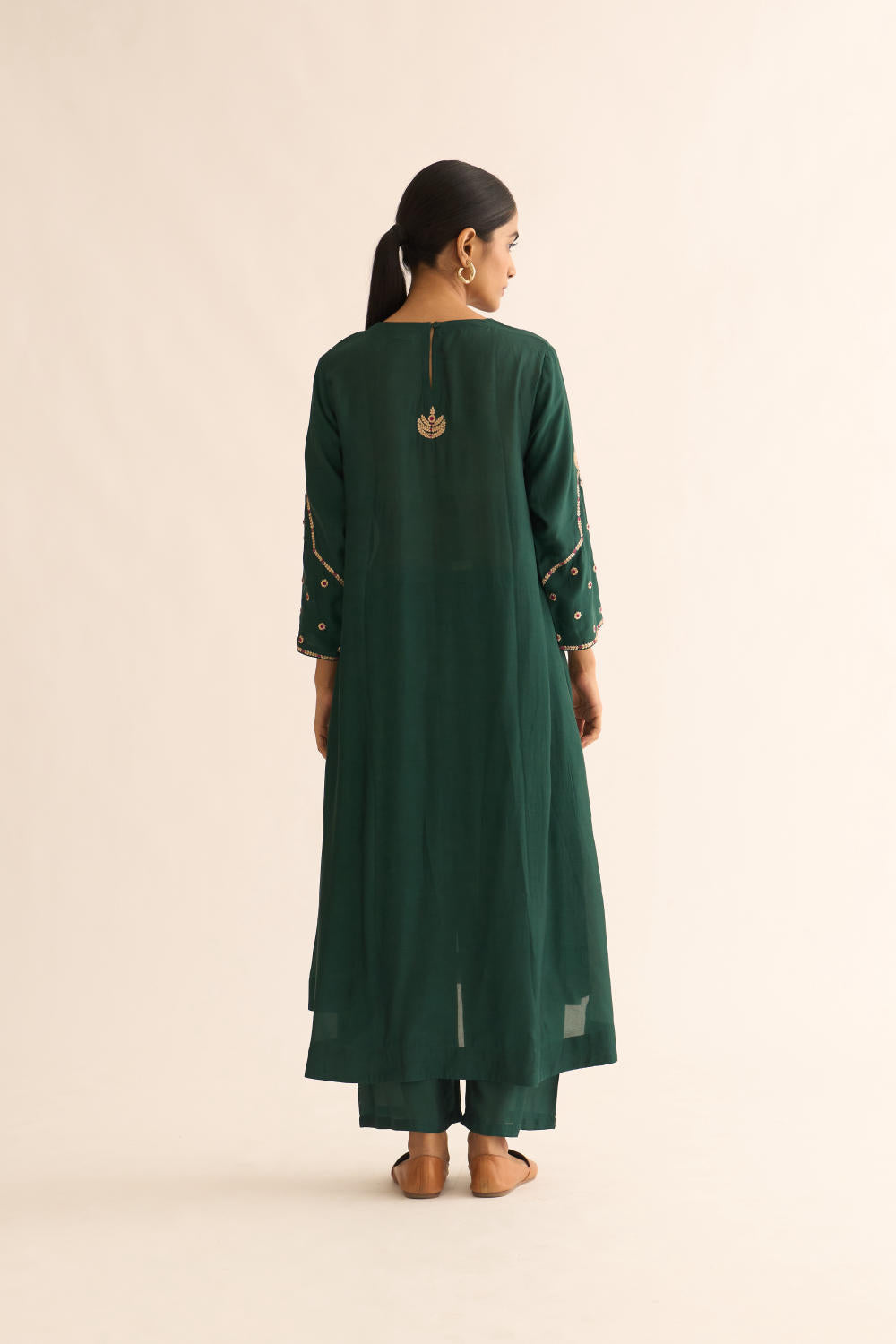 Featuring a Deep green kurta in silk base with zari and resham work. It is paired with matching pants.