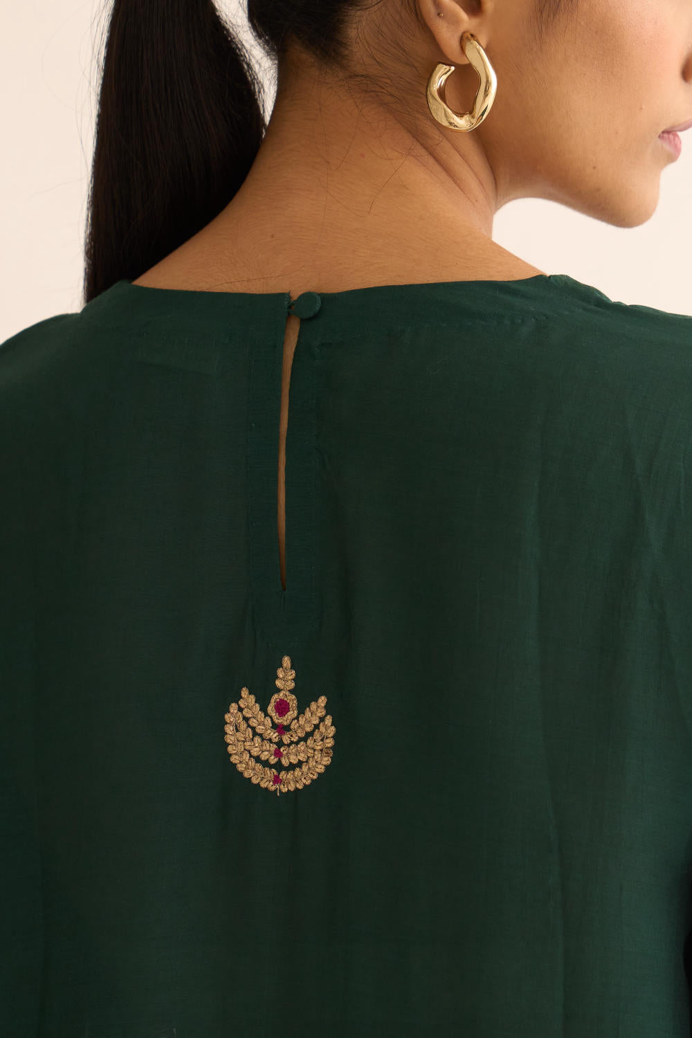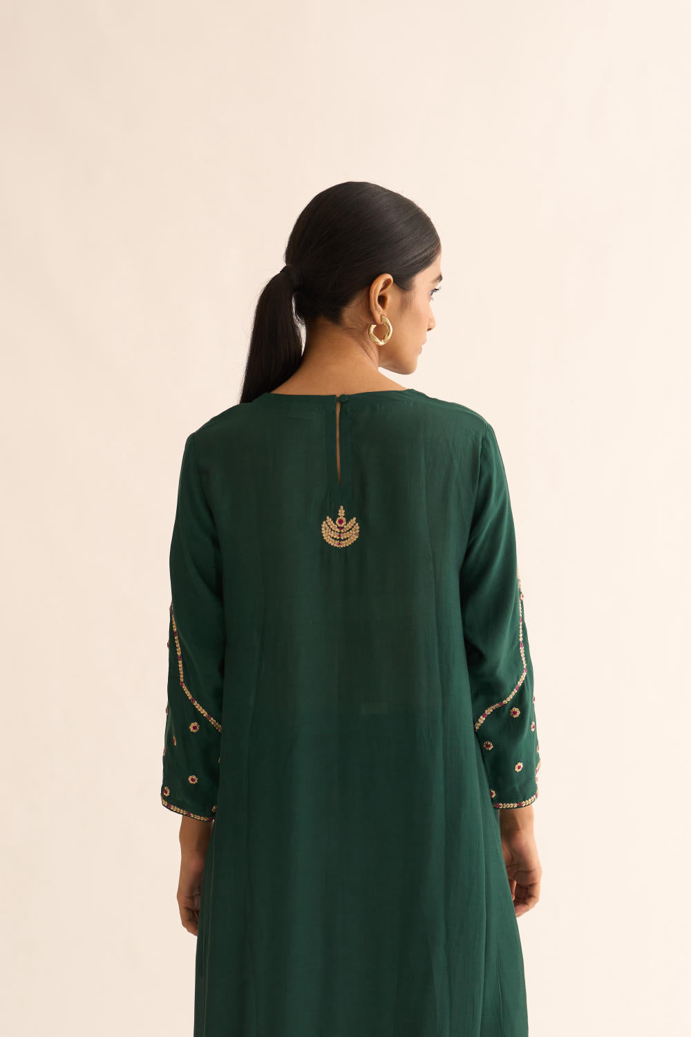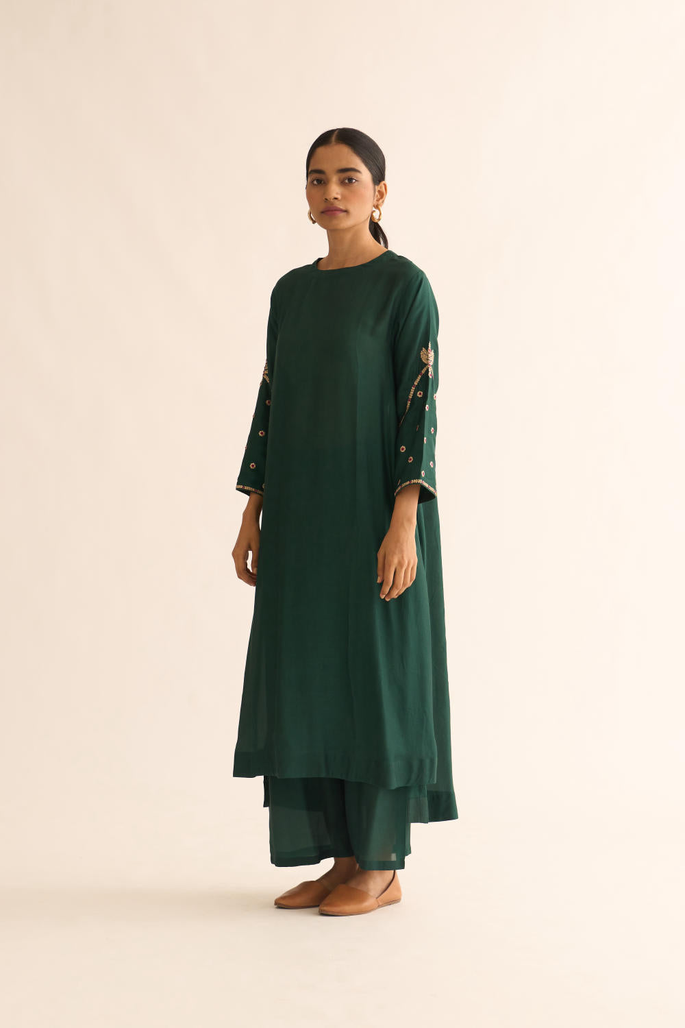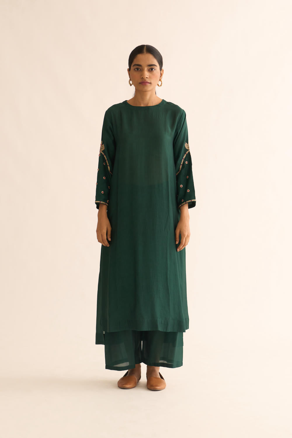 Featuring a Deep green kurta in silk base with zari and resham work. It is paired with matching pants.
