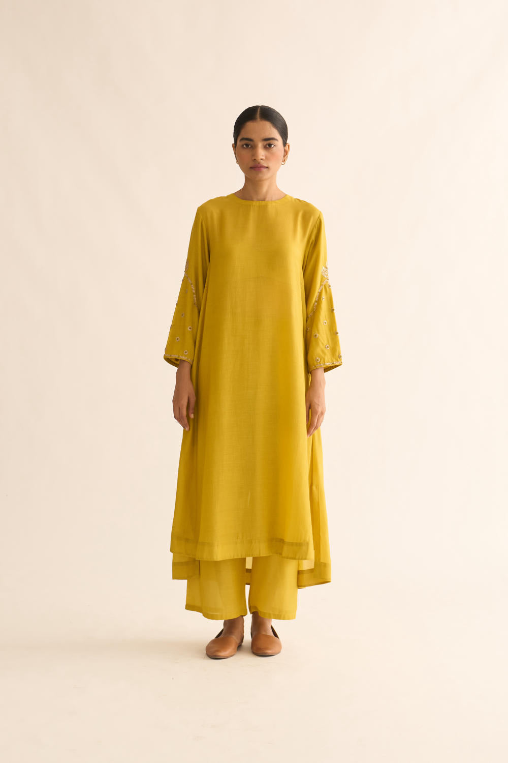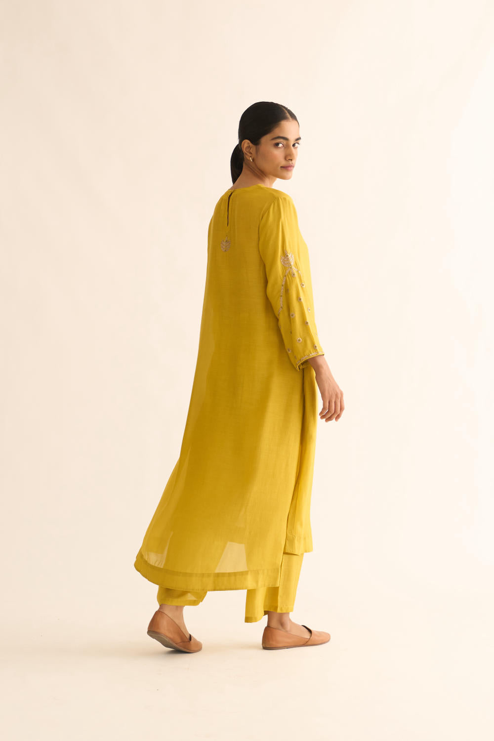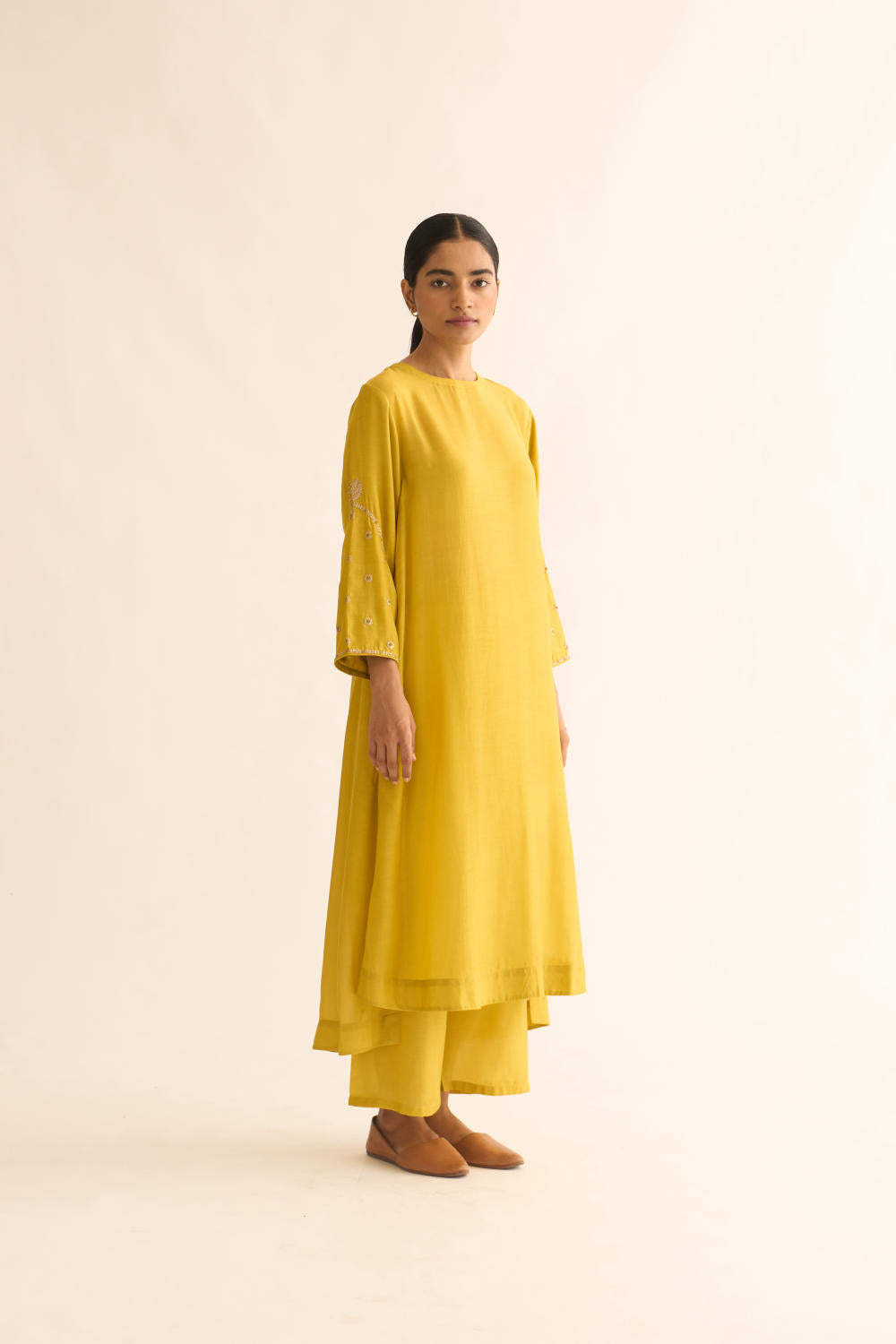 Featuring a lemon Yellow kurta in silk base with zari and resham work on sleeves. It is paired with matching pants.