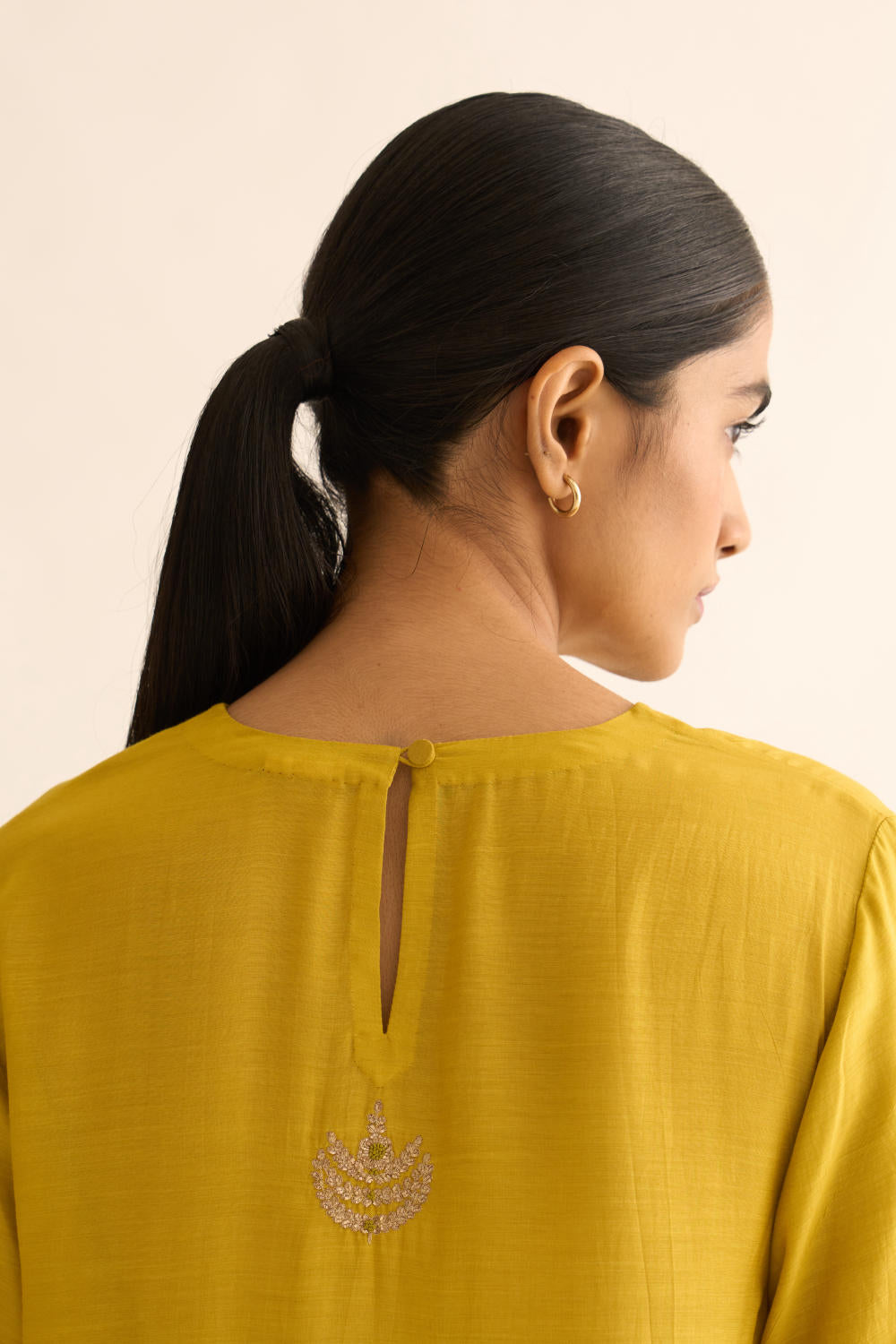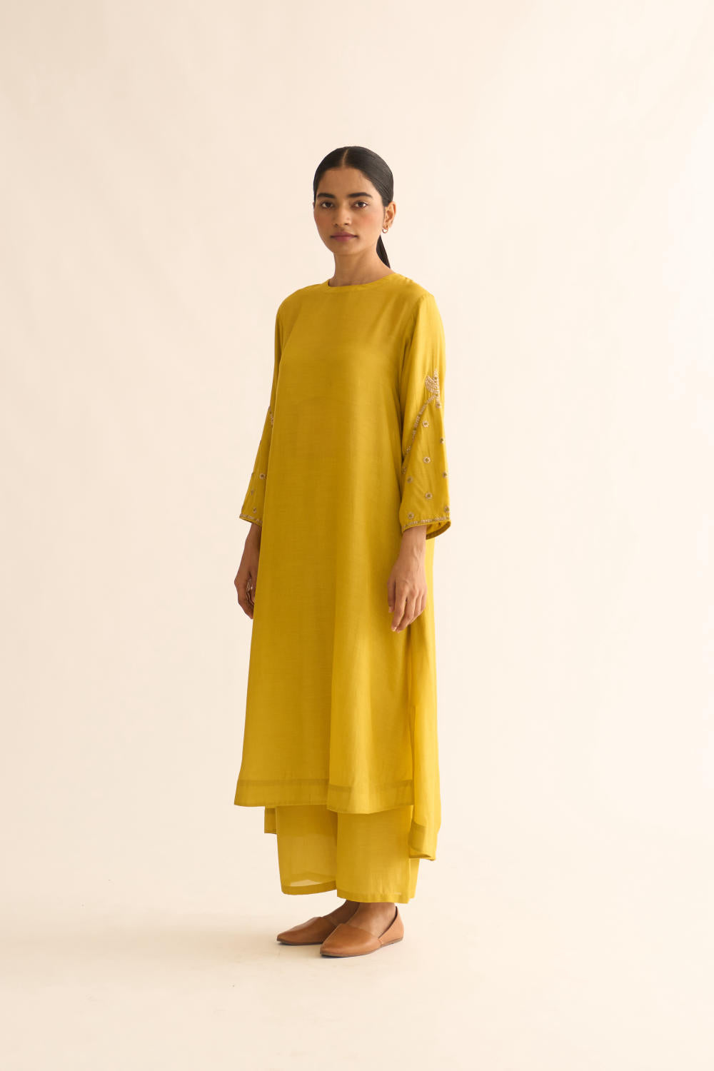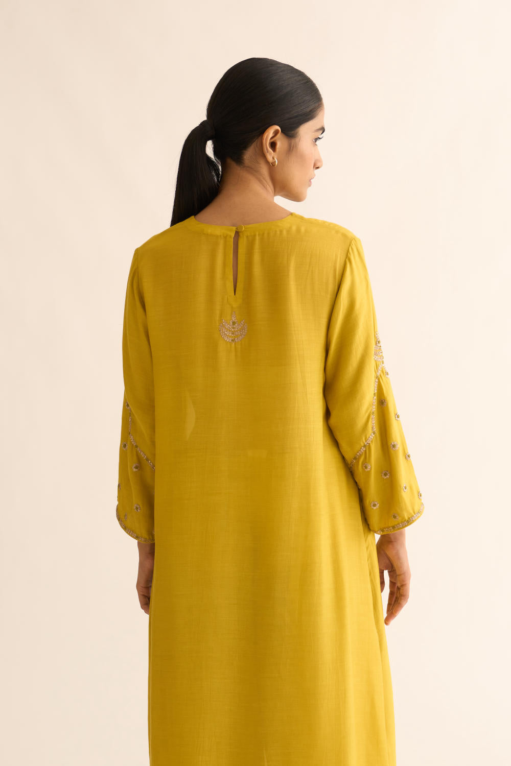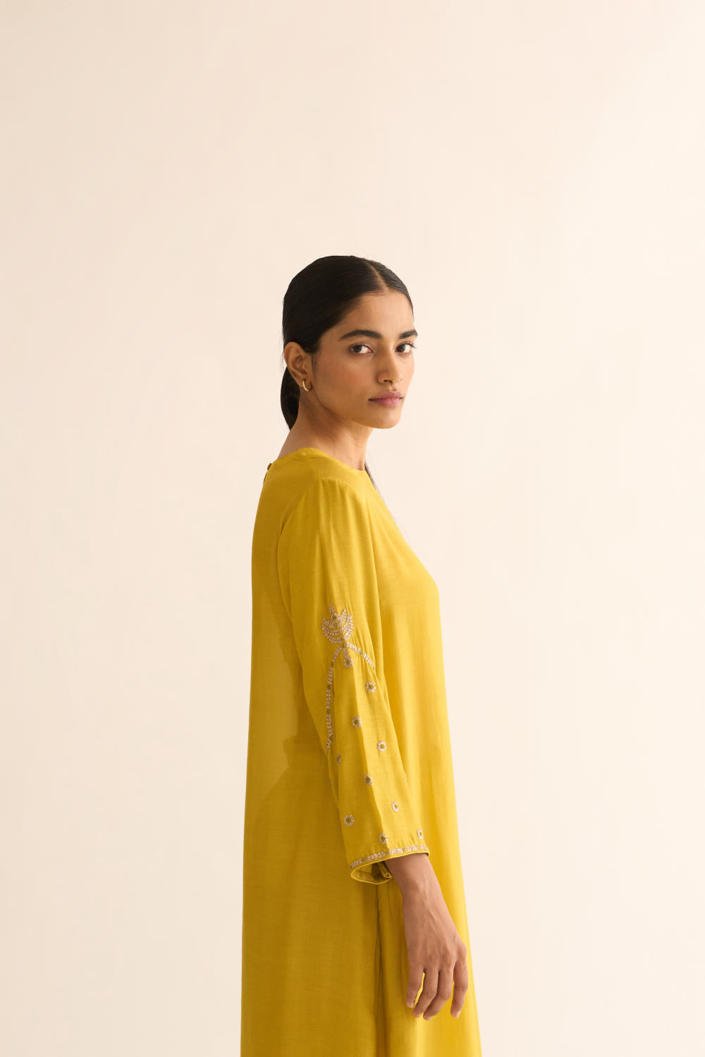 Featuring a lemon Yellow kurta in silk base with zari and resham work on sleeves. It is paired with matching pants.
