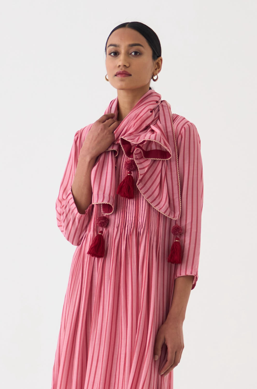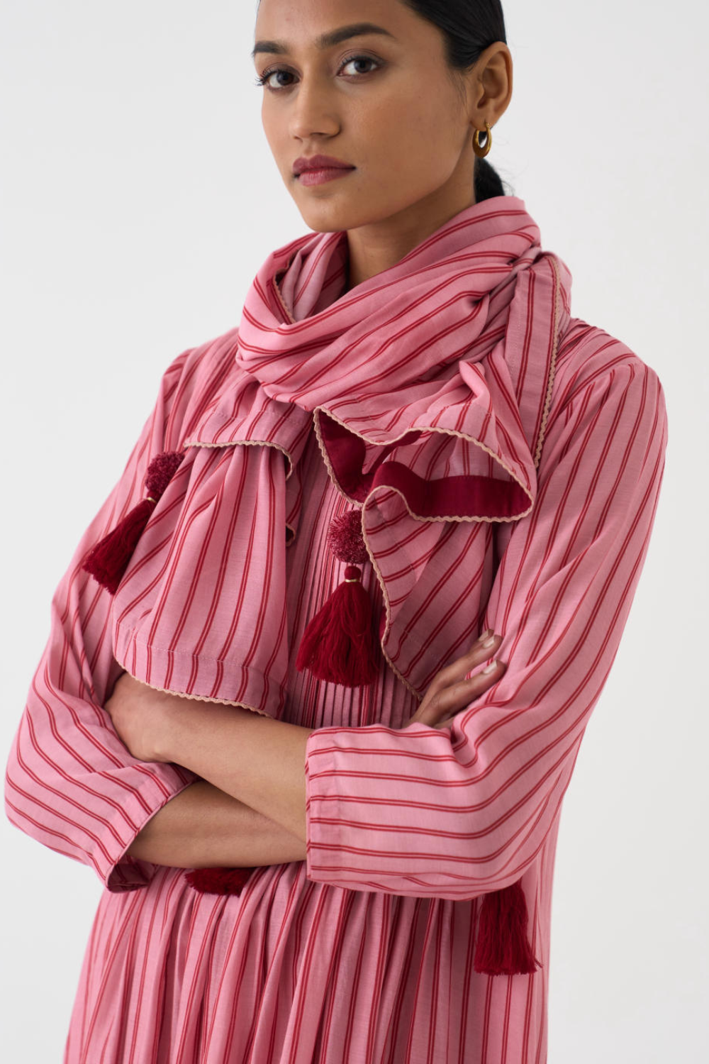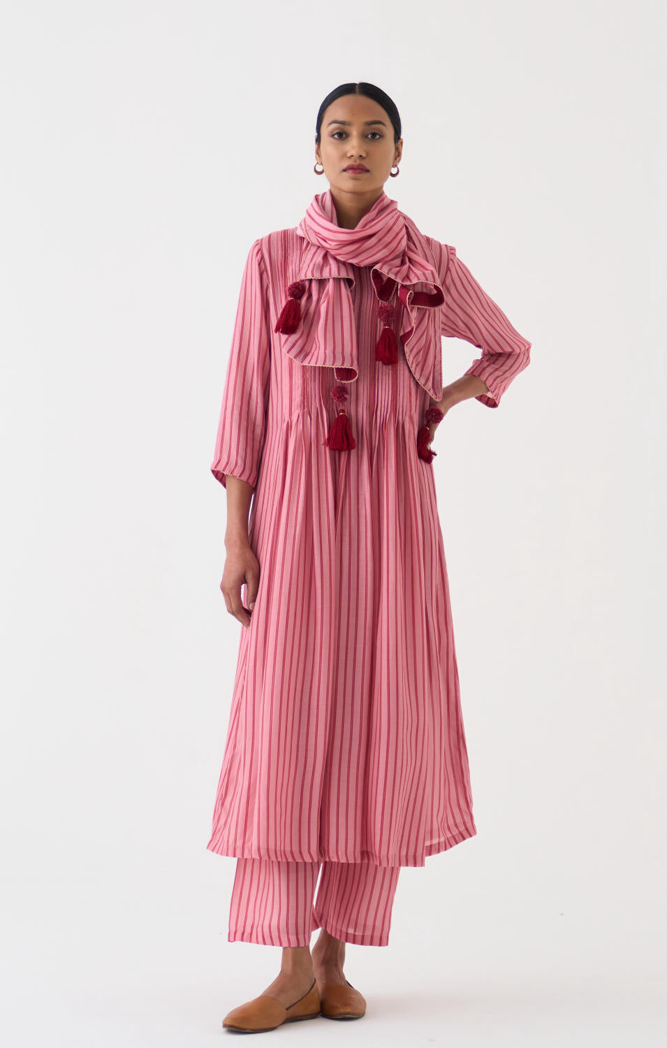 Aria Striped Kurta set with Pintucks at Yoke and matching pants paired with Aria Striped Cotton Silk Scarf