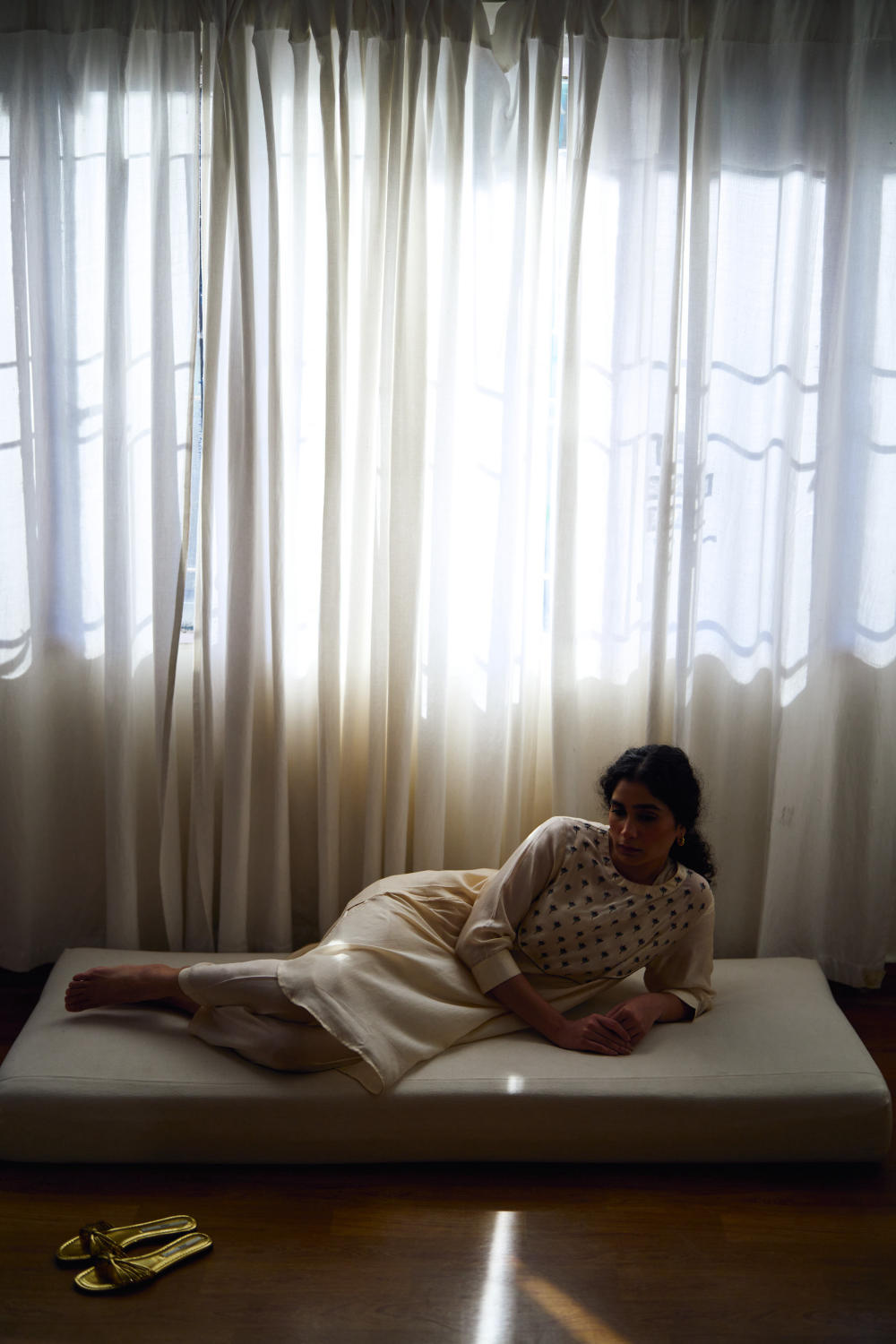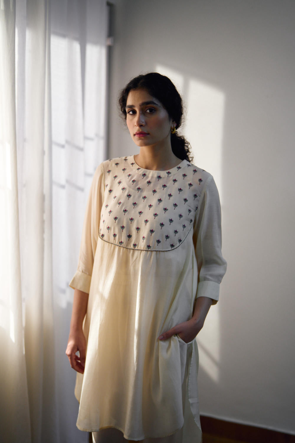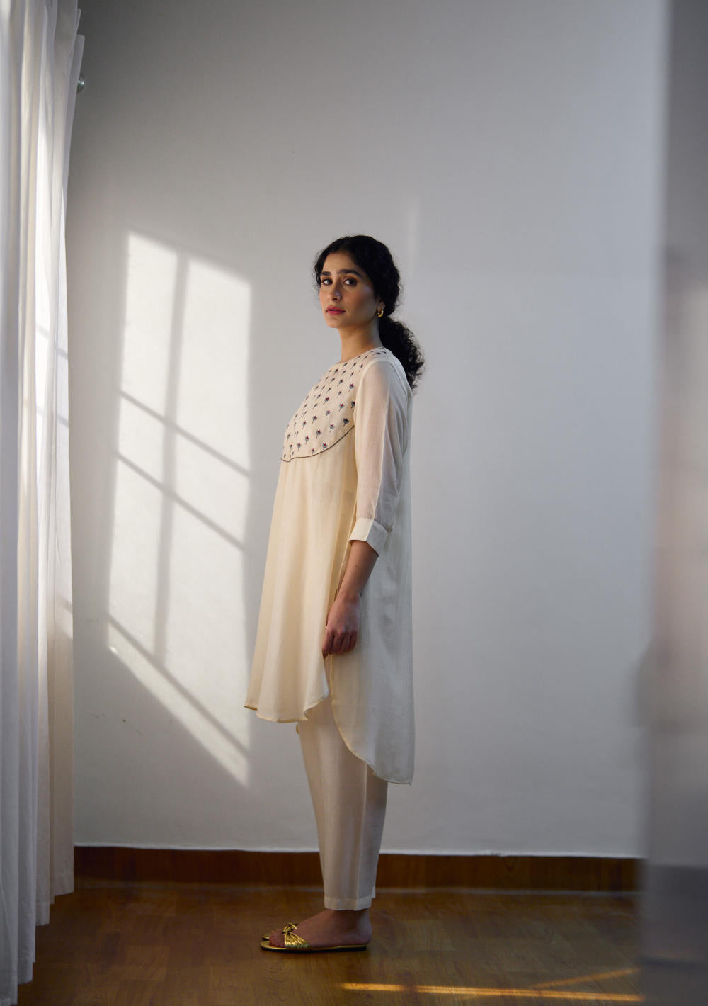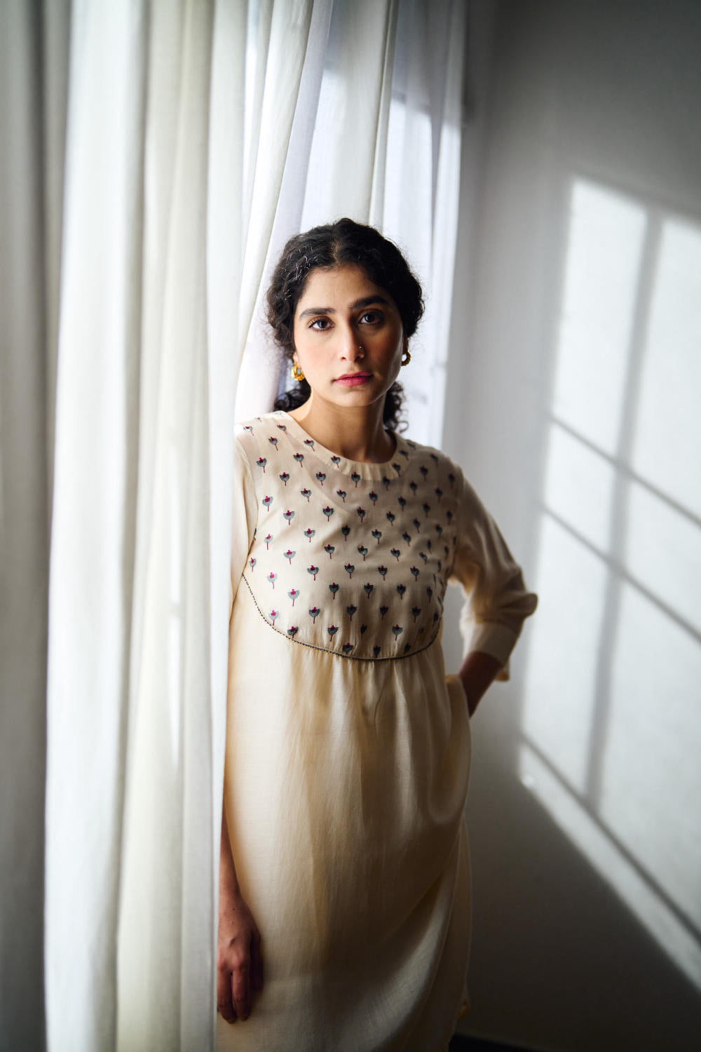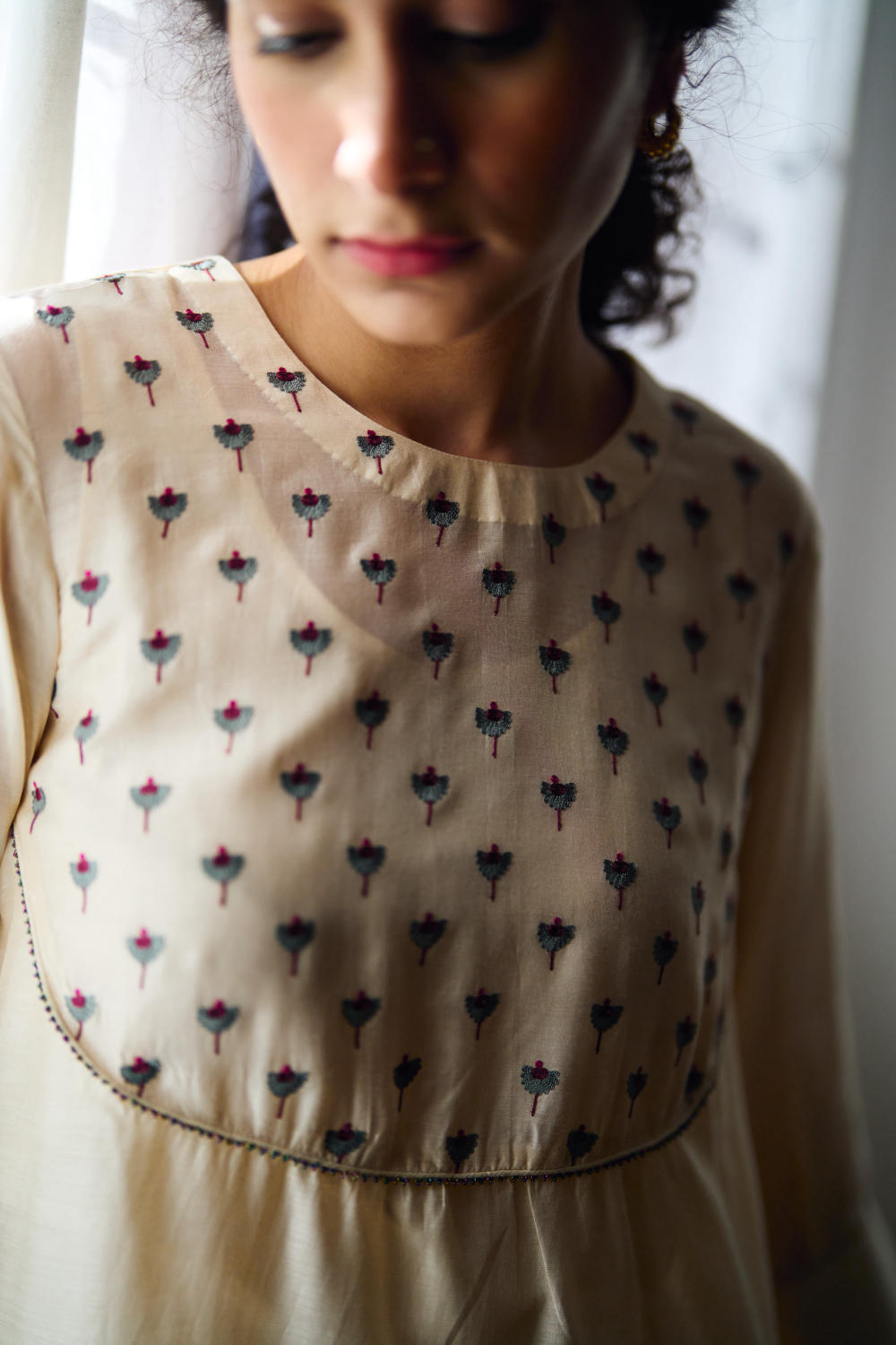 DOT is built on the philosophy of simple living: colours borrowed from nature, silhouettes that float rather than cling, and craftsmanship that honours tradition without performing it. There is a serenity to their pieces — soft pastels, fluid drapes, minimal embroidery, and a lingering hint of the vintage. Everything feels poetic, but never precious; modern, but never loud. Their garments live in that delicate balance where texture, alignment, and movement tell the story.
