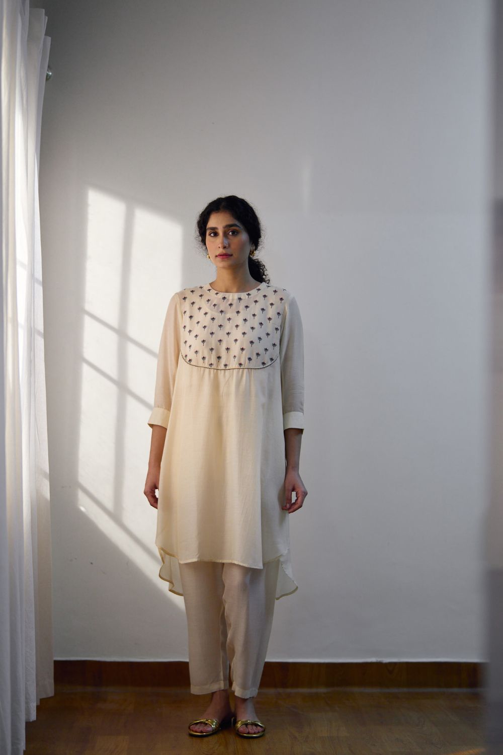 The Cotton Silk kurta set is exquisitely designed with intricate Resham butas on the yoke. These delicate and colorful threadwork motifs add a touch of elegance and charm to the overall look. Additionally, the yoke is adorned with beadwork detailing, further elevating the kurta's sophistication and making it an ideal choice for celebrations and gatherings