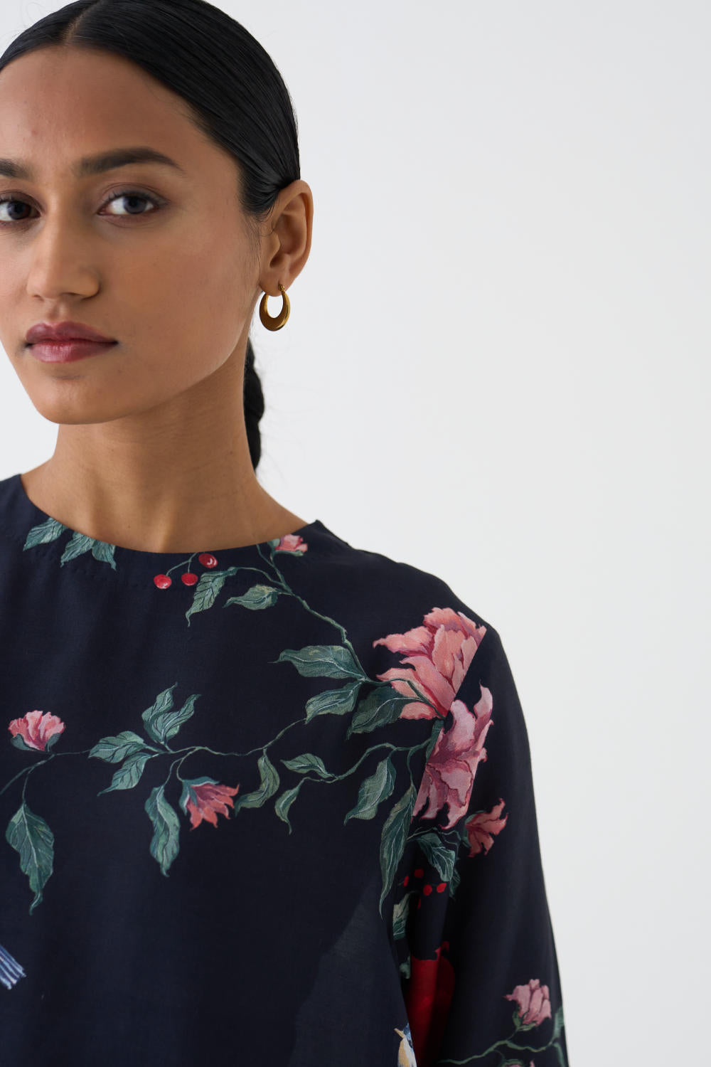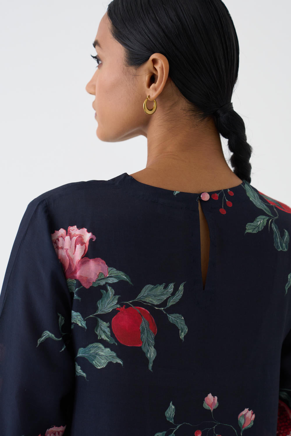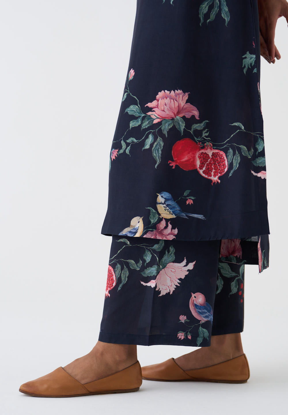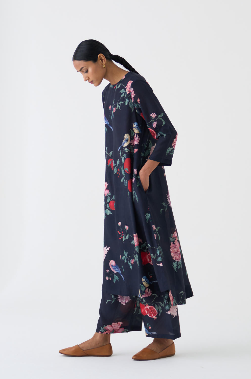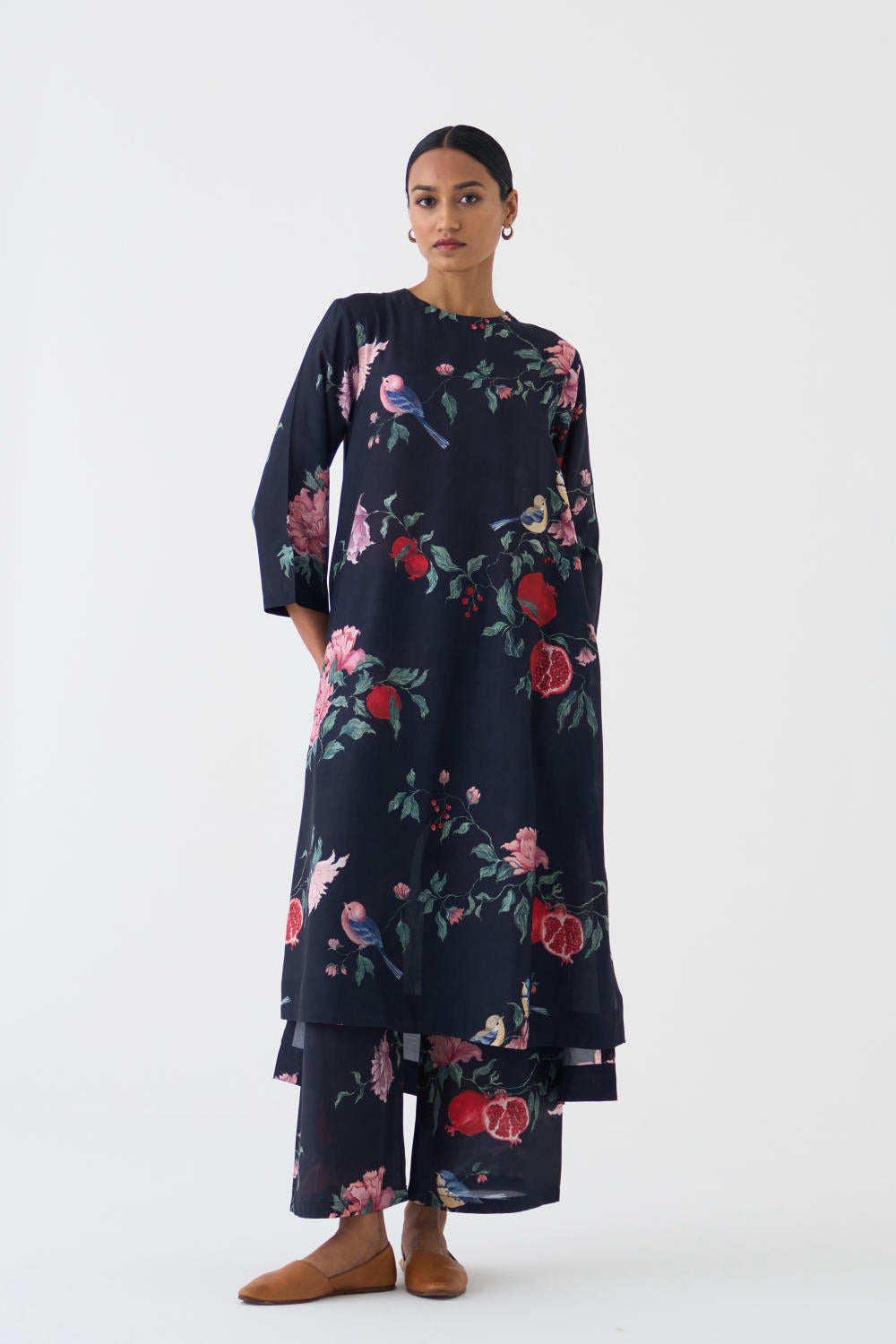 Crafted from a luxurious blend of cotton silk, the Black printed kurta and pants perfectly complementing each other, creating a harmonious ensemble.