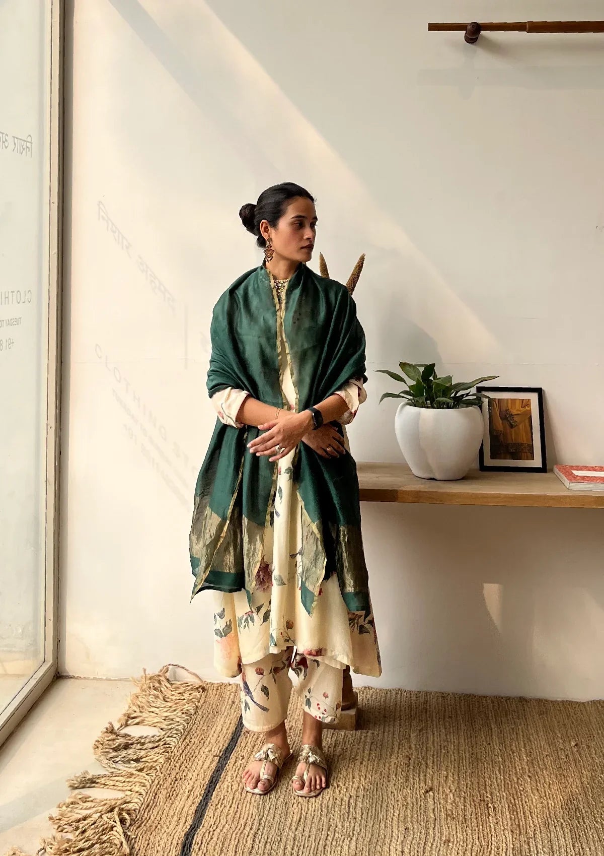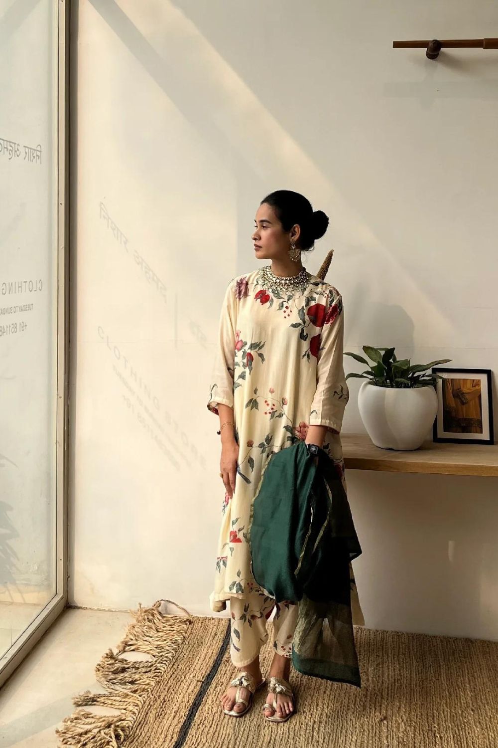 Crafted from a luxurious blend of cotton silk, the Ivory printed kurta and pants perfectly complementing each other, creating a harmonious ensemble.