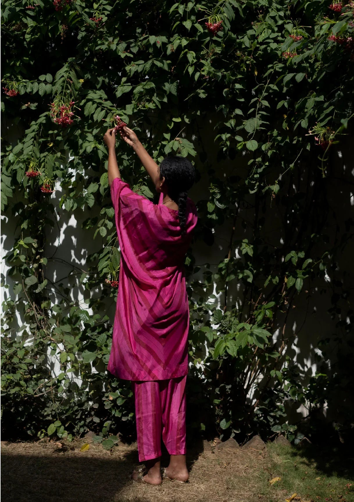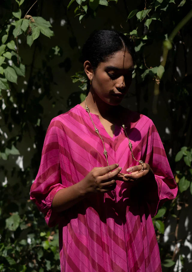 This Butterfly Bush Pink Set features a stunning Kaftan with diagonally striped rani pink stripes, paired with matching pants in a comfortable cotton silk fabric. The Kaftan is designed to flatter any figure, with a flowy silhouette and a flattering neckline. The pants are tailored to perfection, providing both comfort and style.