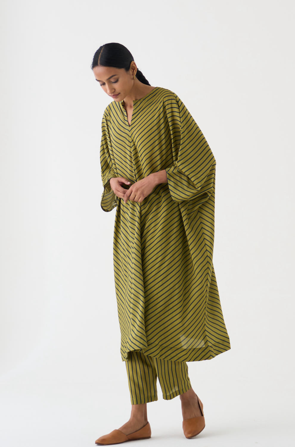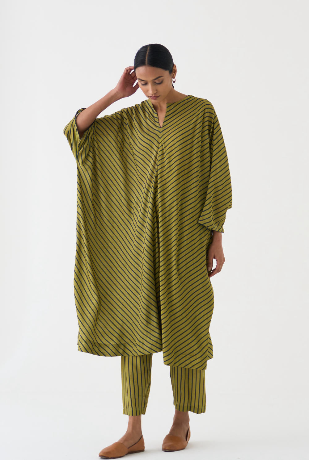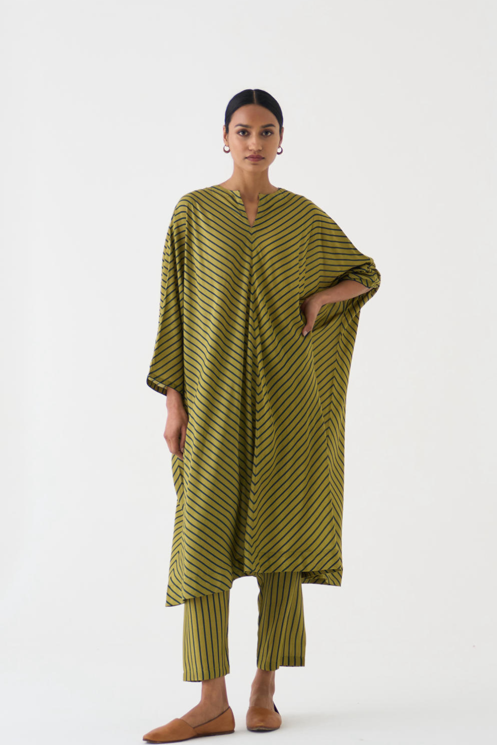 This Butterfly Calla Kaftan Set features a stunning Kaftan with diagonally striped Lime and Emerald stripes, paired with matching pants in a comfortable cotton silk fabric. The Kaftan is designed to flatter any figure, with a flowy silhouette and a flattering neckline. The pants are tailored to perfection, providing both comfort and style.