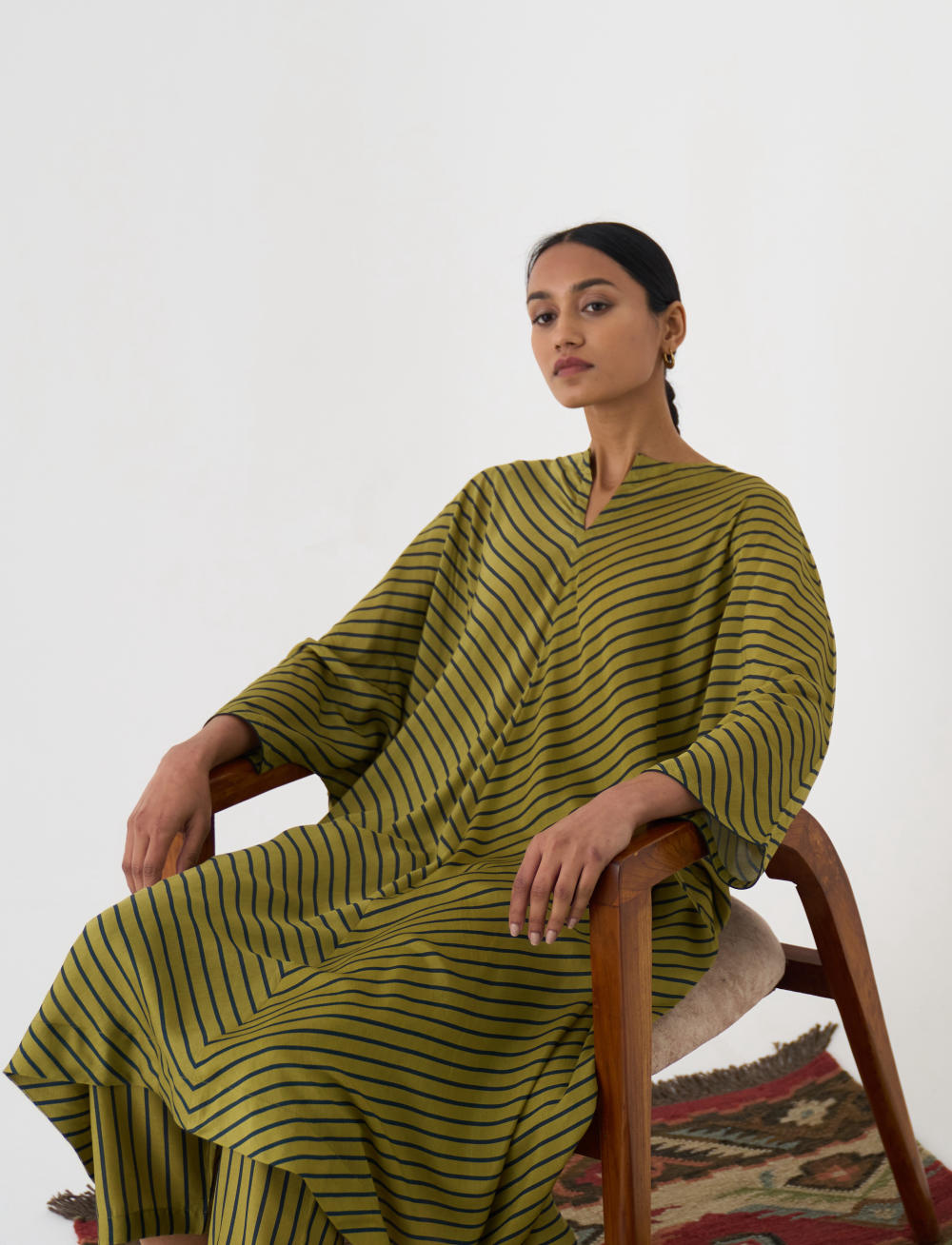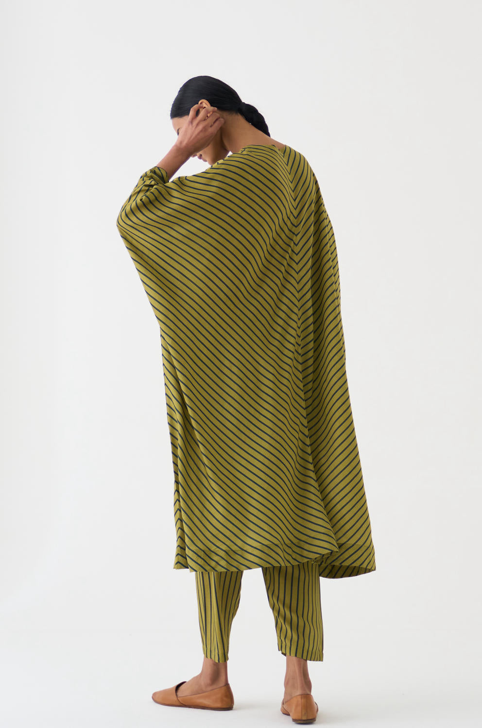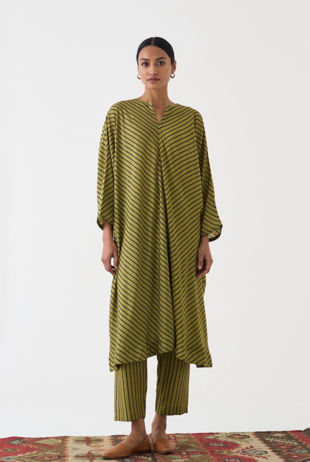 This Butterfly Calla Kaftan Set features a stunning Kaftan with diagonally striped Lime and Emerald stripes, paired with matching pants in a comfortable cotton silk fabric. The Kaftan is designed to flatter any figure, with a flowy silhouette and a flattering neckline. The pants are tailored to perfection, providing both comfort and style.