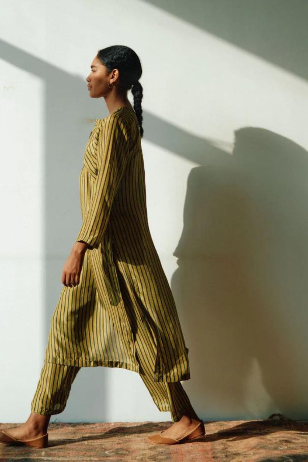 This Calla Kurta Set is a refreshing take on traditional Indian wear. Made from Habutai Silk, a lightweight and breathable fabric, this kurta set is perfect for any occasion. The kurta features a green striped pattern and a flattering straight silhouette. The pants are straight-leg and flowy.