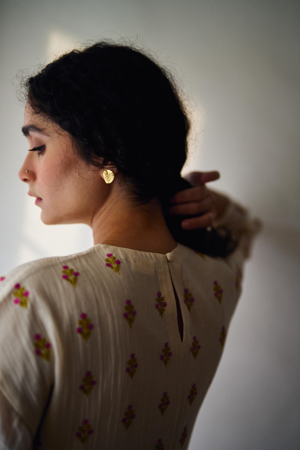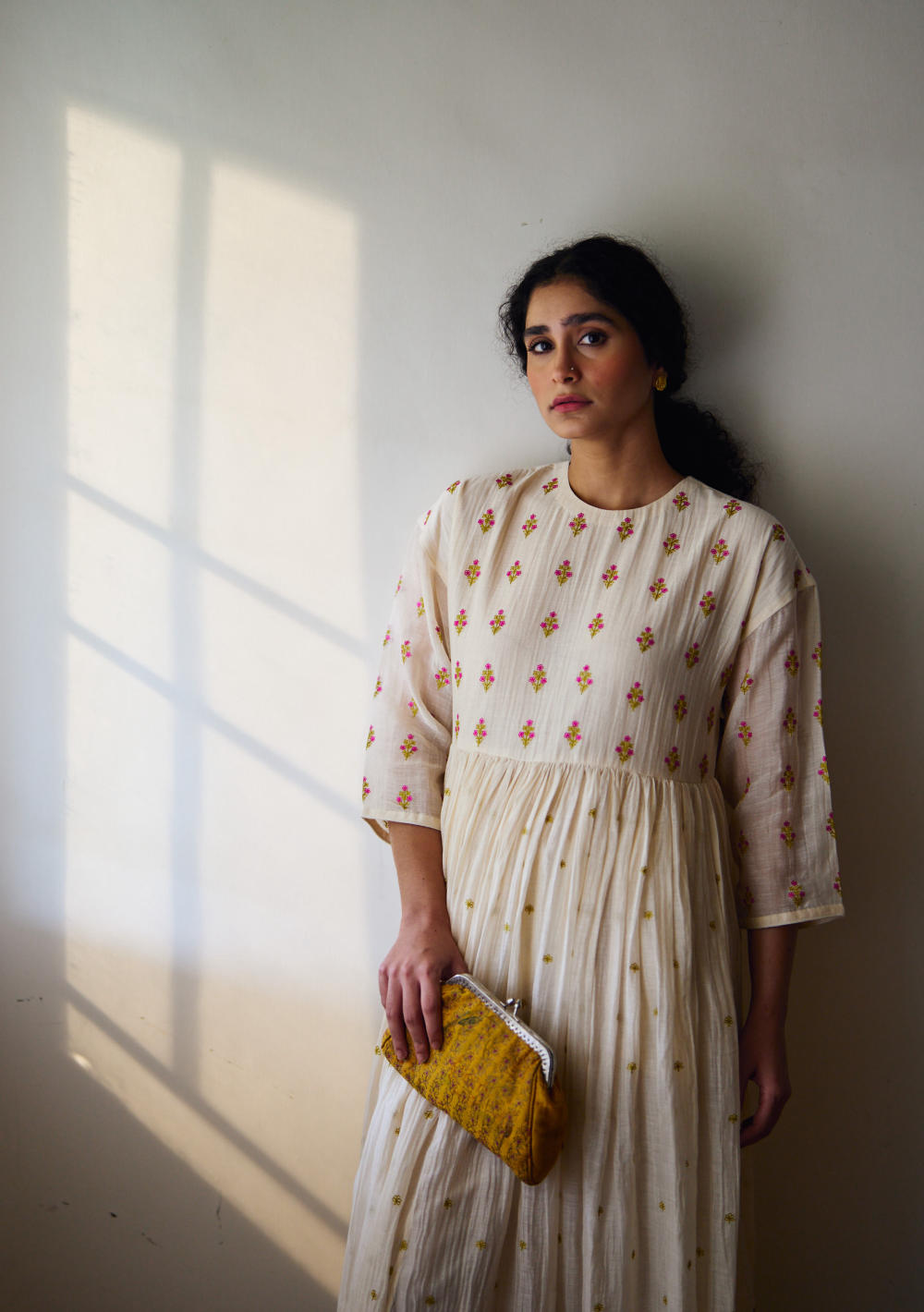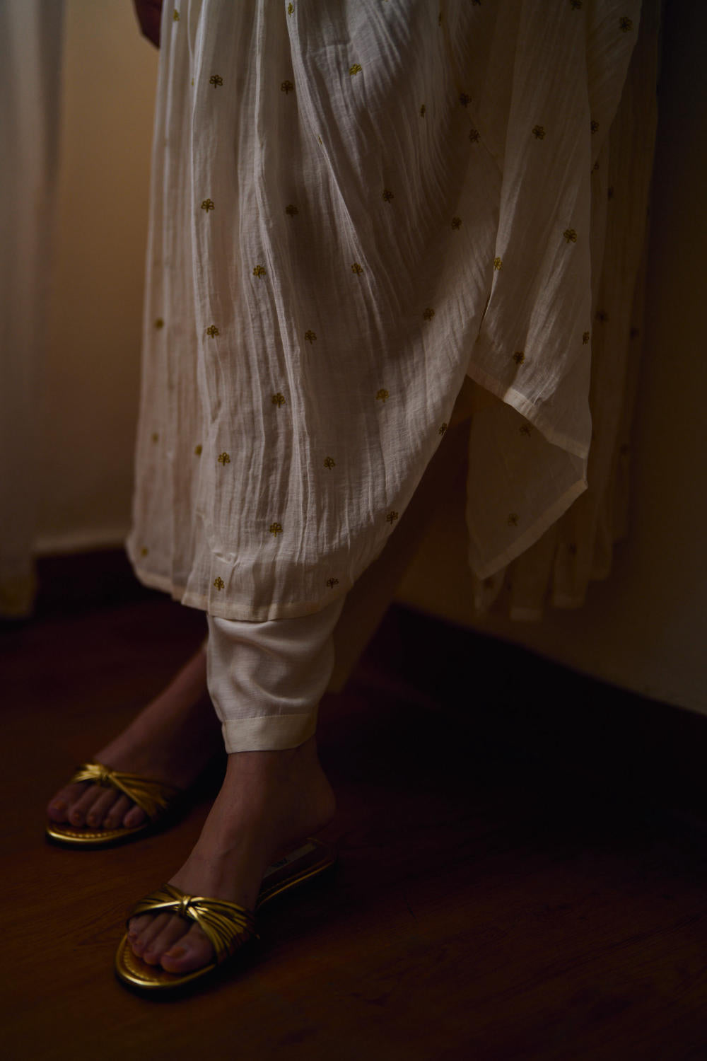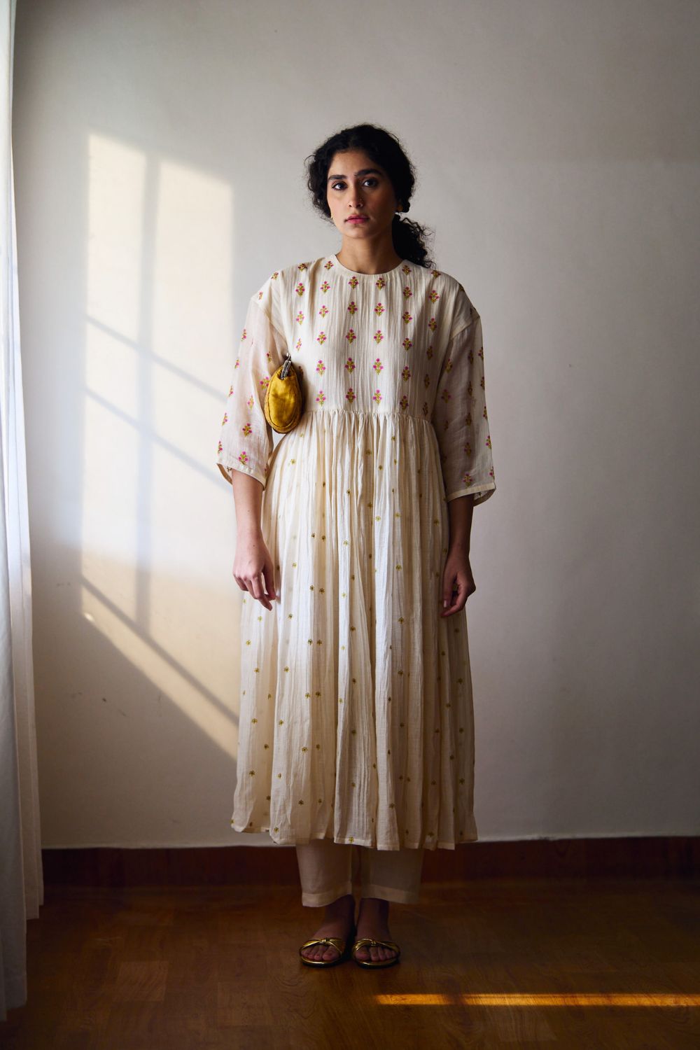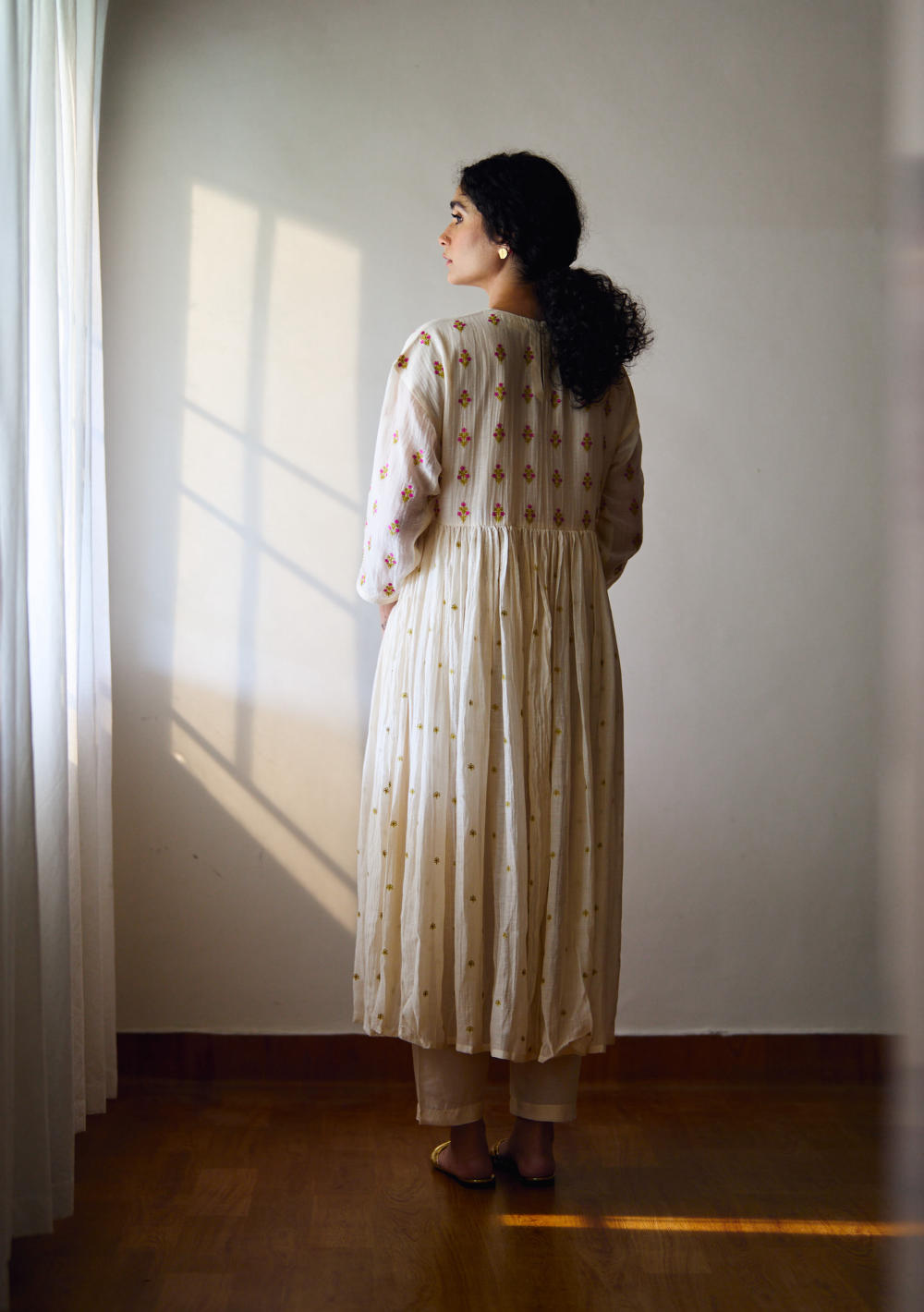 Embrace timeless elegance and enchanting craftsmanship with our exquisite Hand-Embroidered Chanderi Gathered Kurta, gracefully paired with a luxurious Cotton Silk pant adorned with Resham floral Buta.