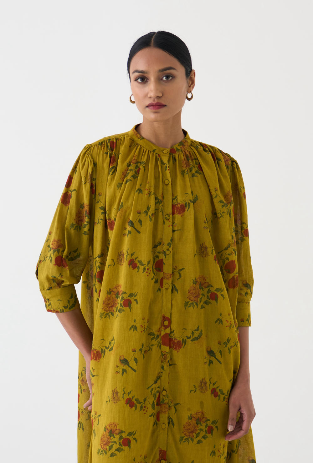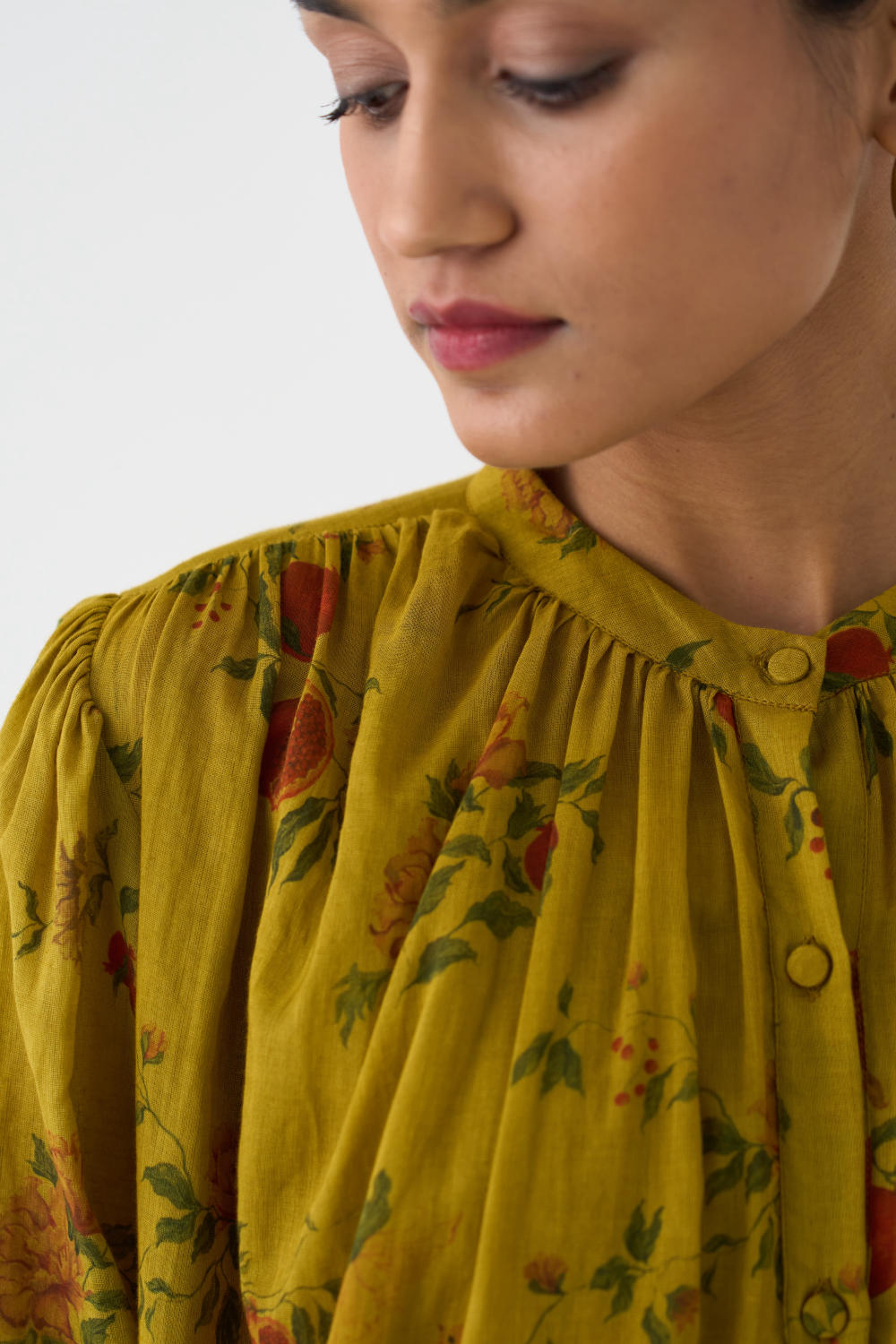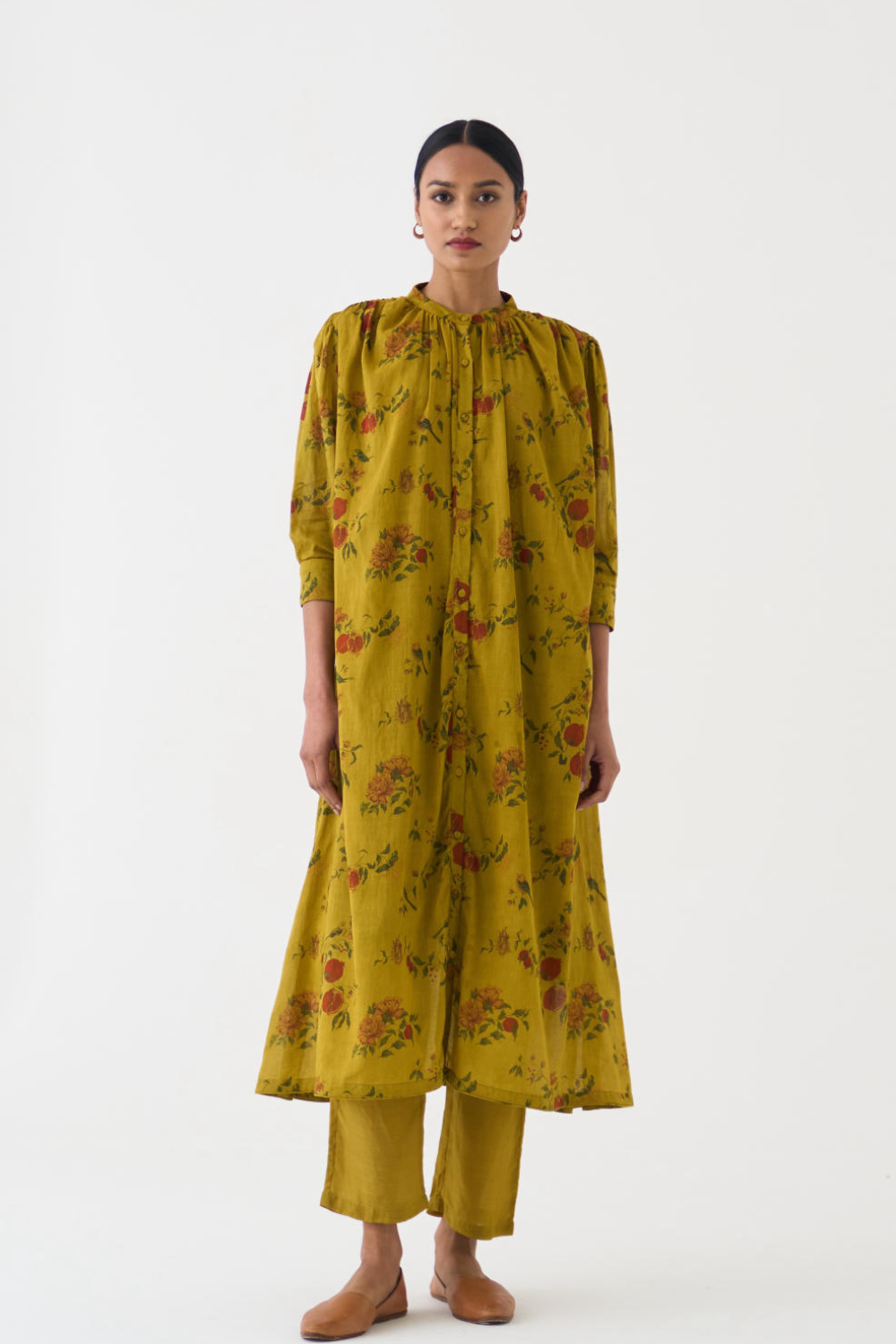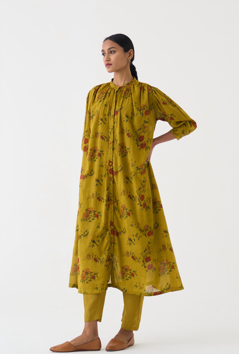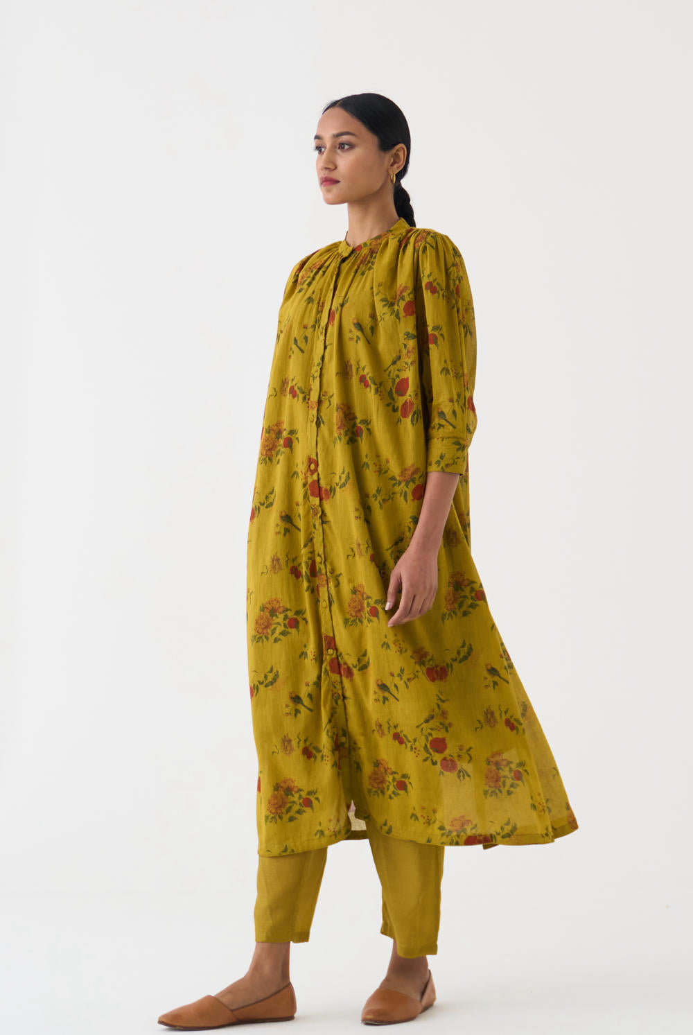 Crafted with utmost care and attention to detail, this set is perfect for any occasion. The Yellow cotton print adds a touch of uniqueness, while the neck-gather design enhances the overall charm. Paired with comfortable cotton pants, this set offers both style and comfort.