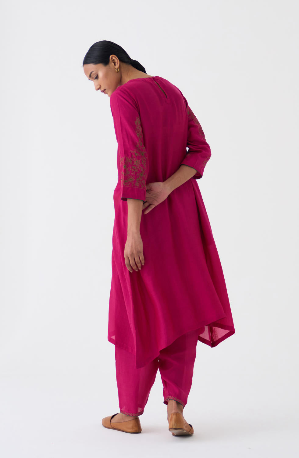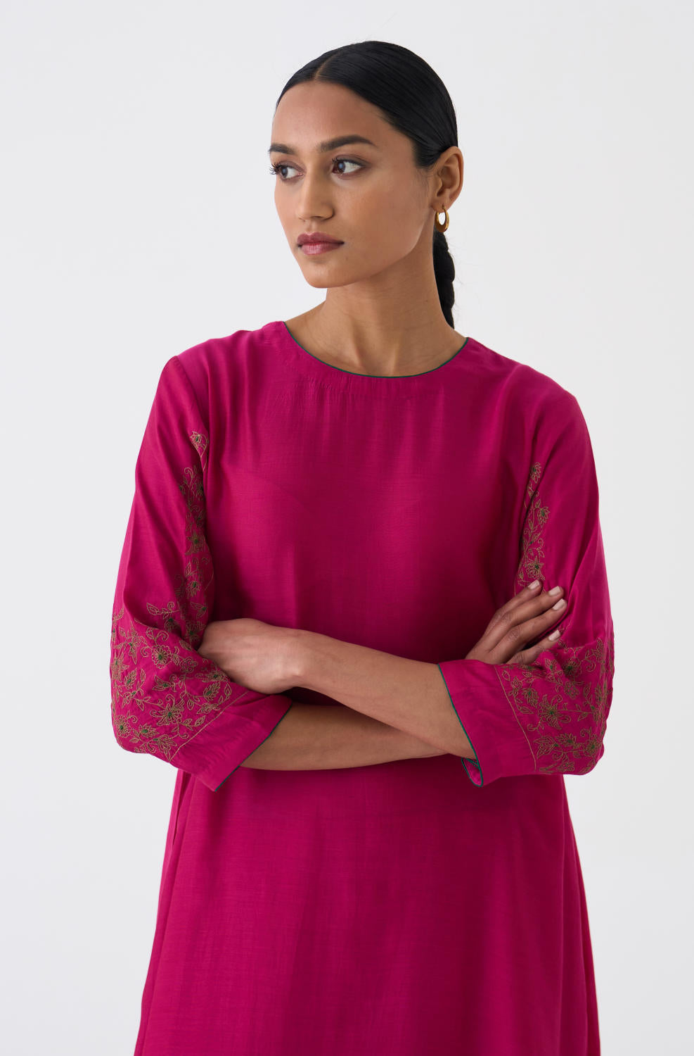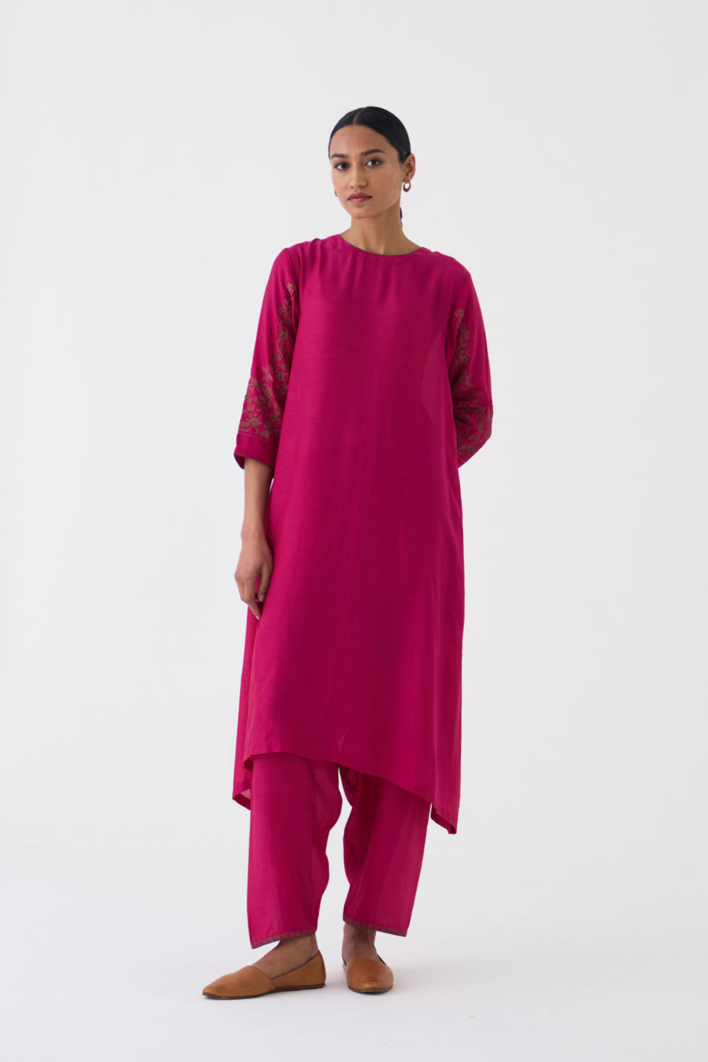 Featuring a Rani Pink kurta in silk base with Zari and Resham work on sleeves. It is paired with matching pants.