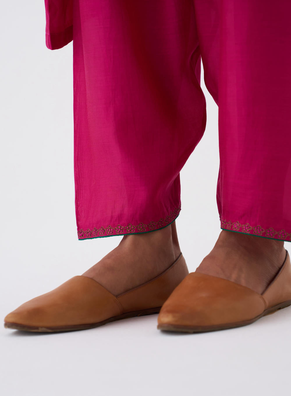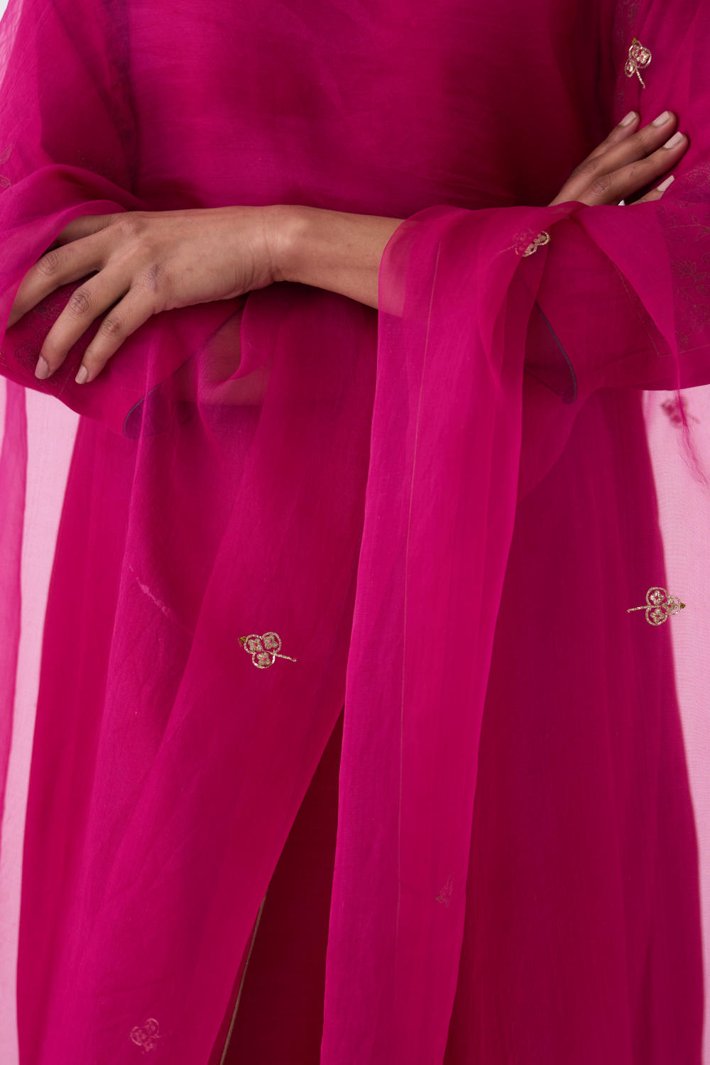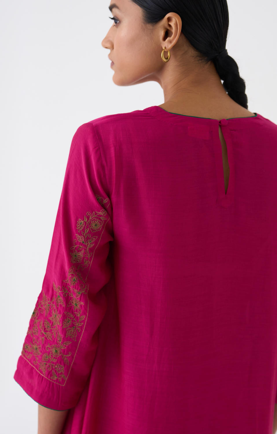 Featuring a Rani Pink kurta in silk base with Zari and Resham work on sleeves. It is paired with matching pants.