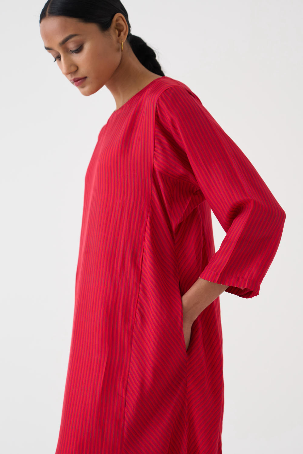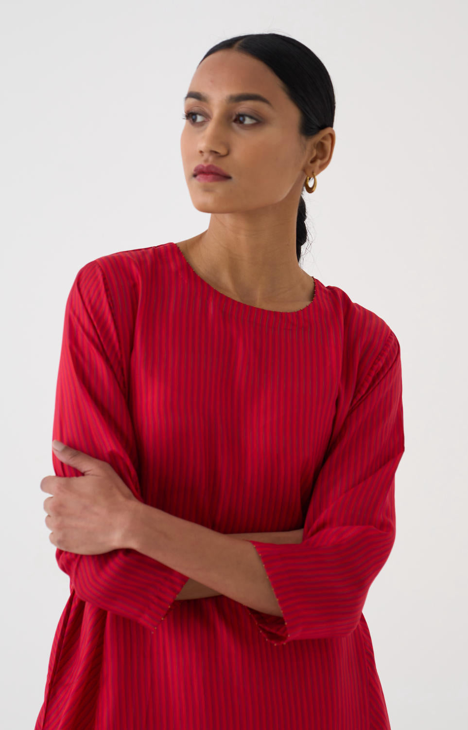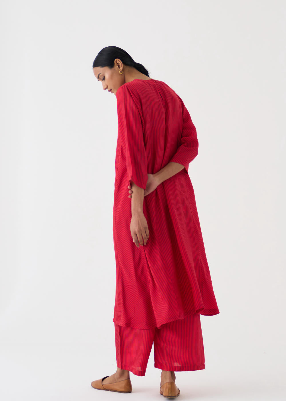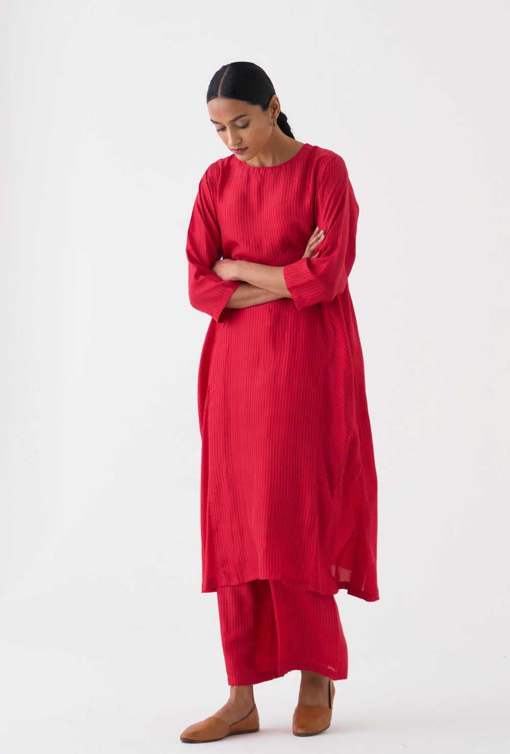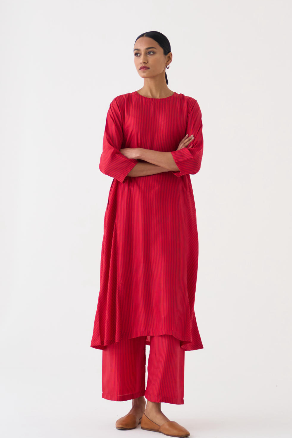 This Kurta set features Irisstriped Kurta set with paired pants, crafted from high-quality Habutai Silk fabric.