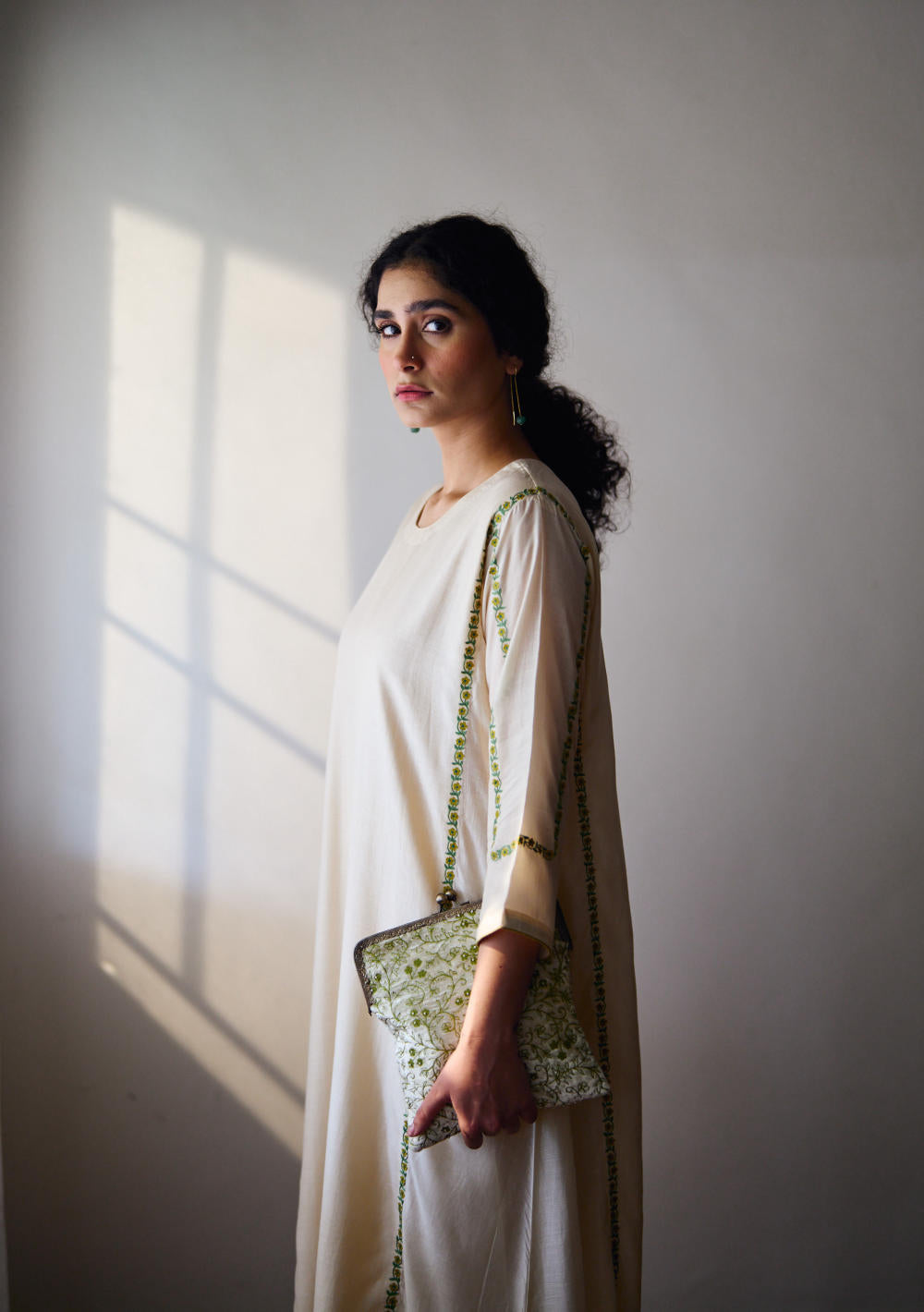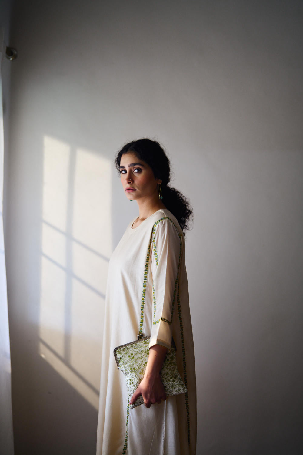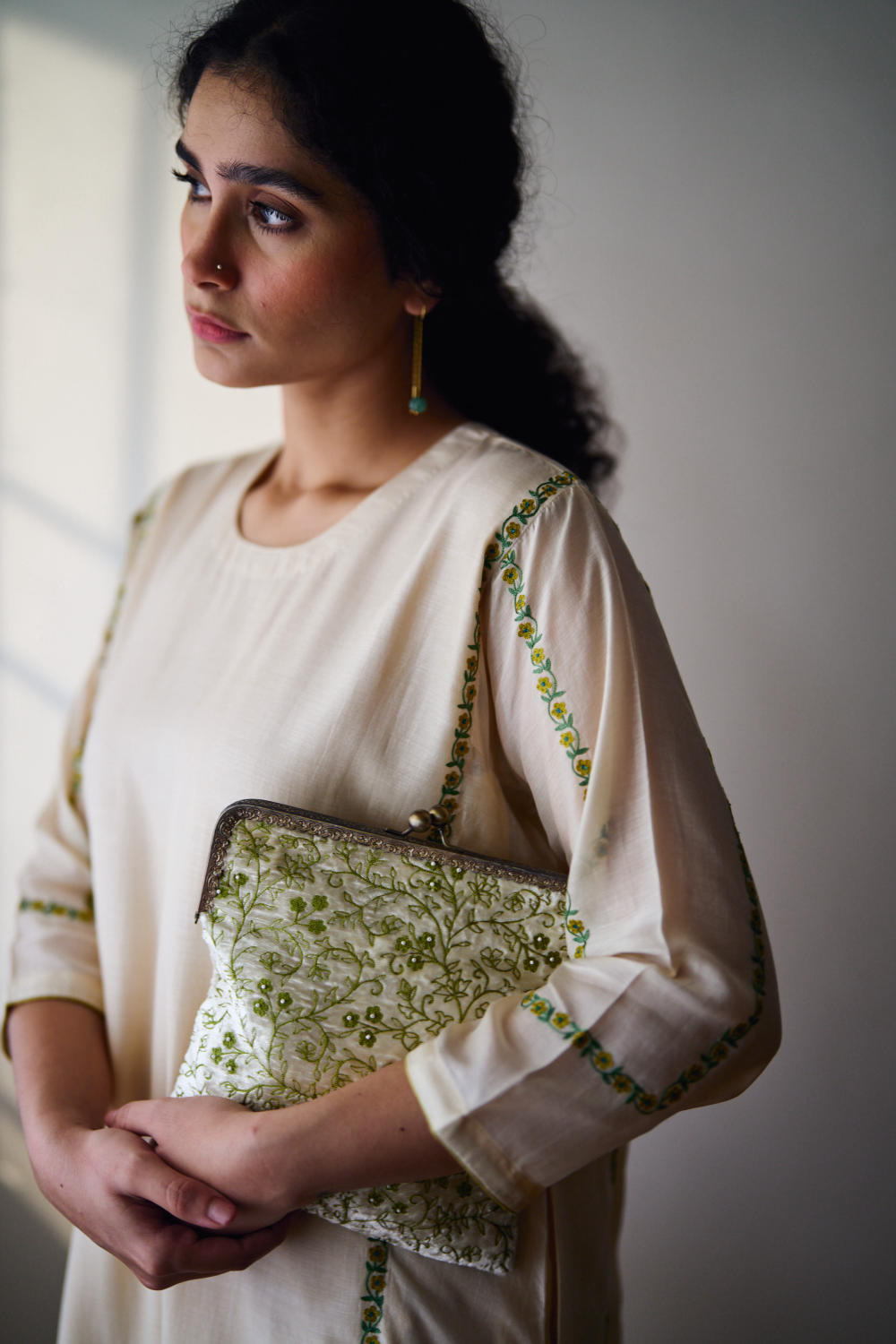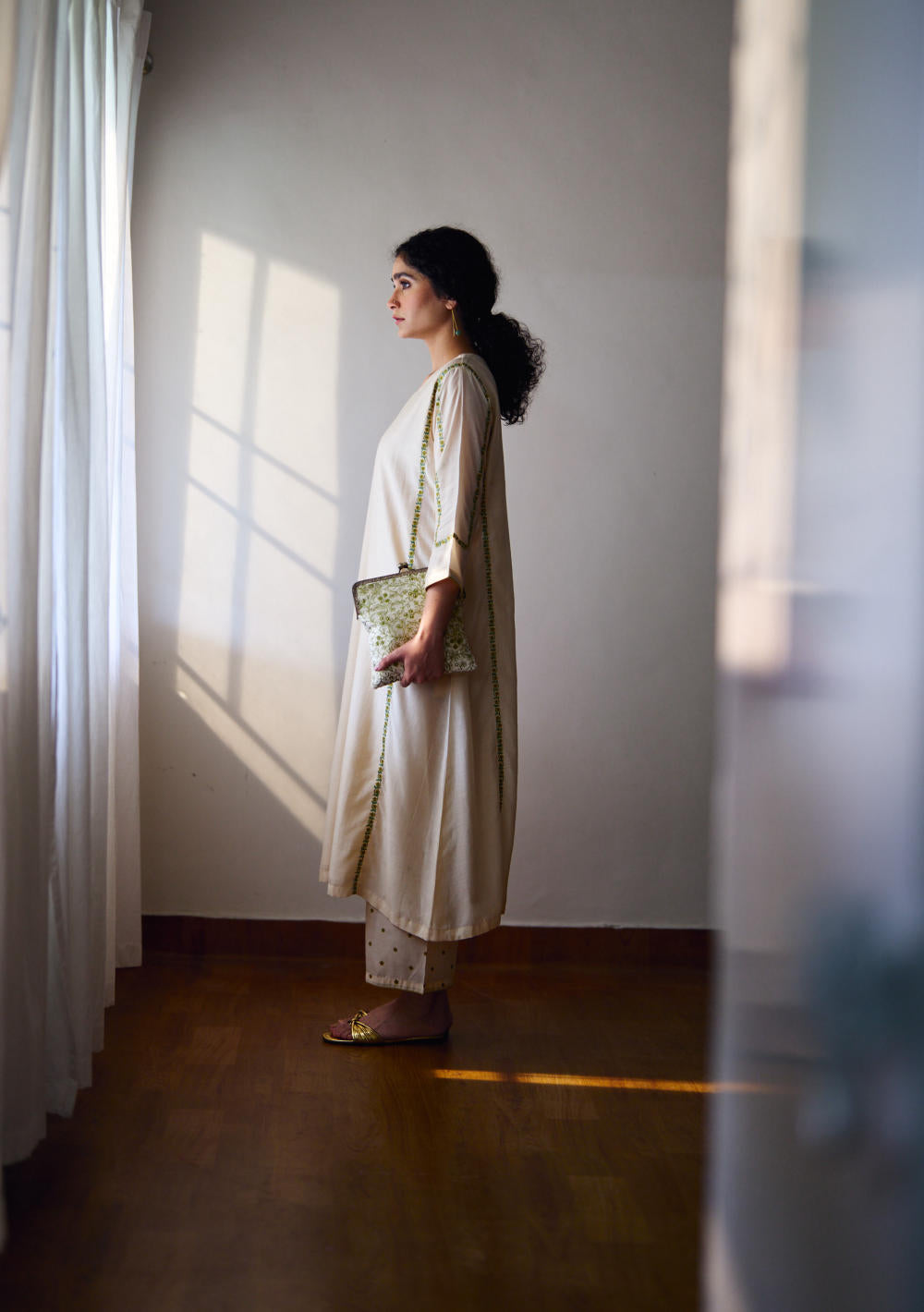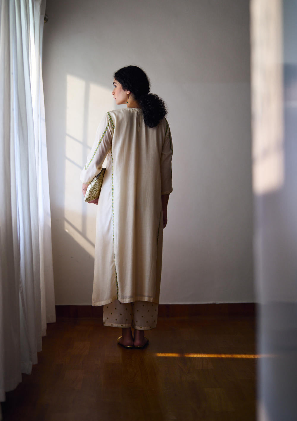 Embrace the allure of the Kurta's flowing silhouette, designed to accentuate grace, while the Silk pants effortlessly complement the ensemble with their luxurious drape. From the intricately embroidered sleeves to the gracefully tapered hems, every detail reflects a dedication to perfection.