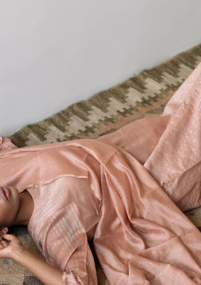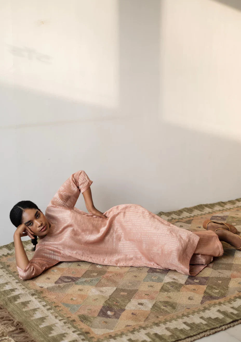 Chanderi Zari Striped Kurta Set with Chanderi Tara Dupatta, a truly festive ensemble that exudes elegance and grace. The vibrant pink hue of the fabric adds a touch of femininity, while the intricate striped pattern and Zari detailing showcase the craftsmanship and attention to detail paired with the luxurious Chanderi Tara Dupatta.